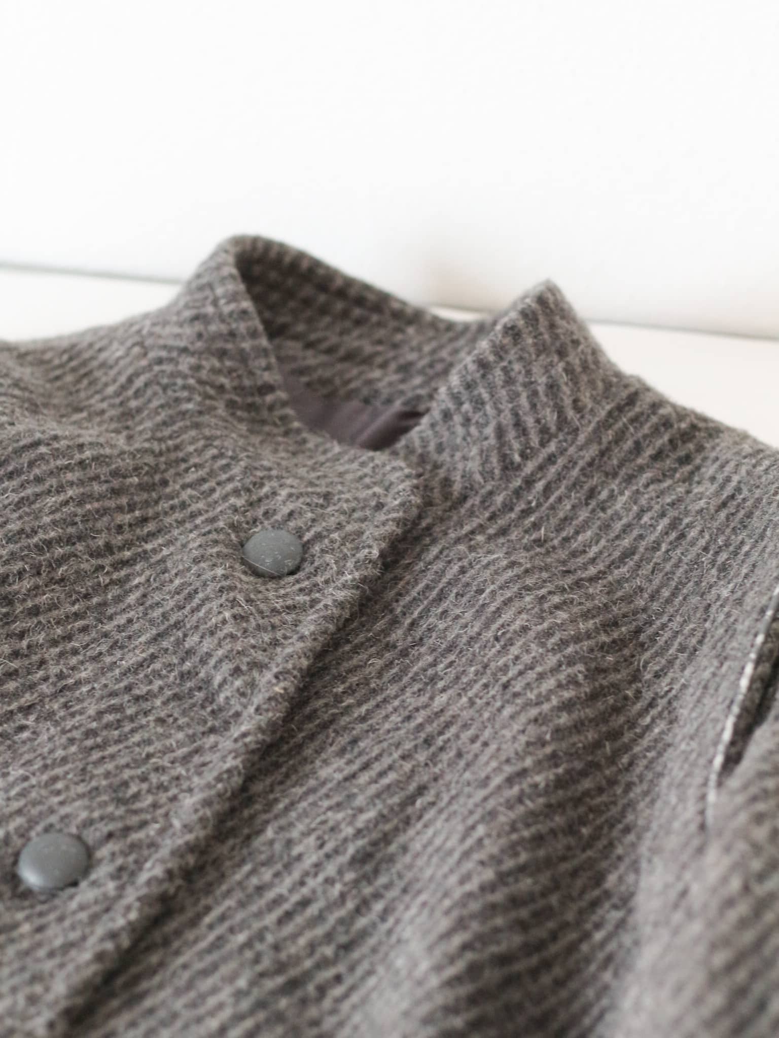 Abrigo en color gris con tejido de espiga. Corte oversize con hombreras marcadas y cuello tipo mao.