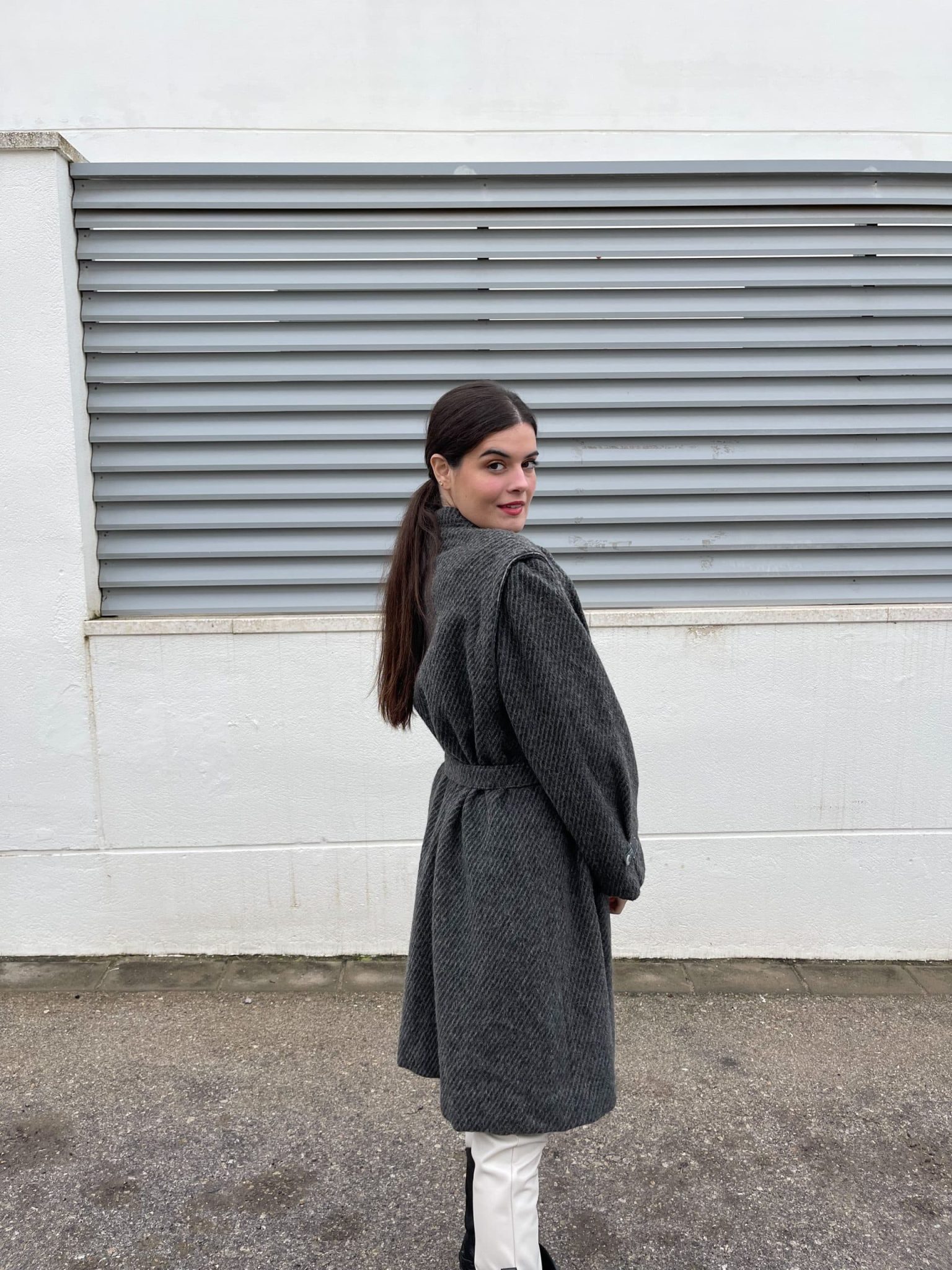 Abrigo con estampado de espiga en color gris. Corte oversize con detalle de hombreras marcadas y una caída tipo capa preciosa.