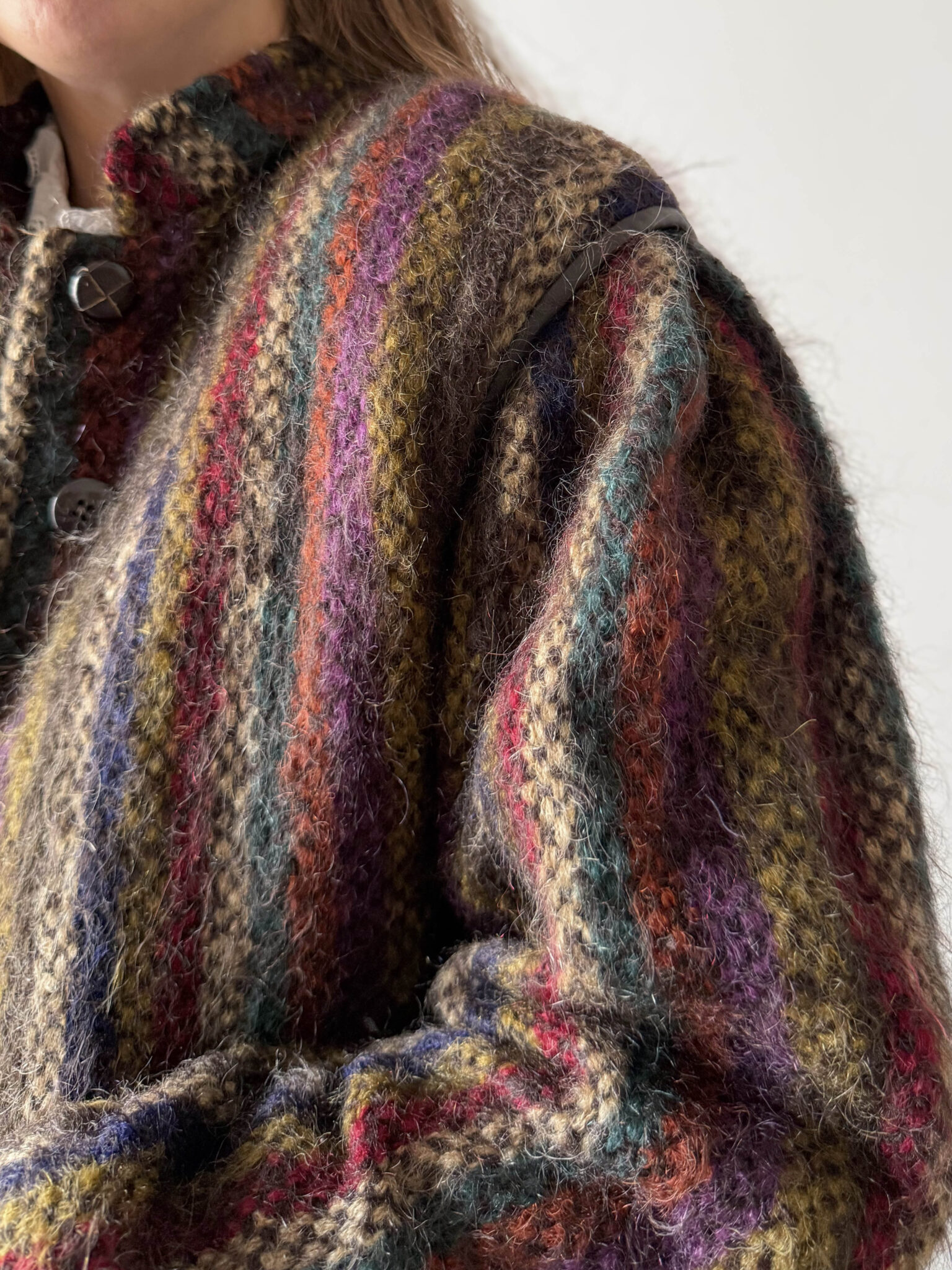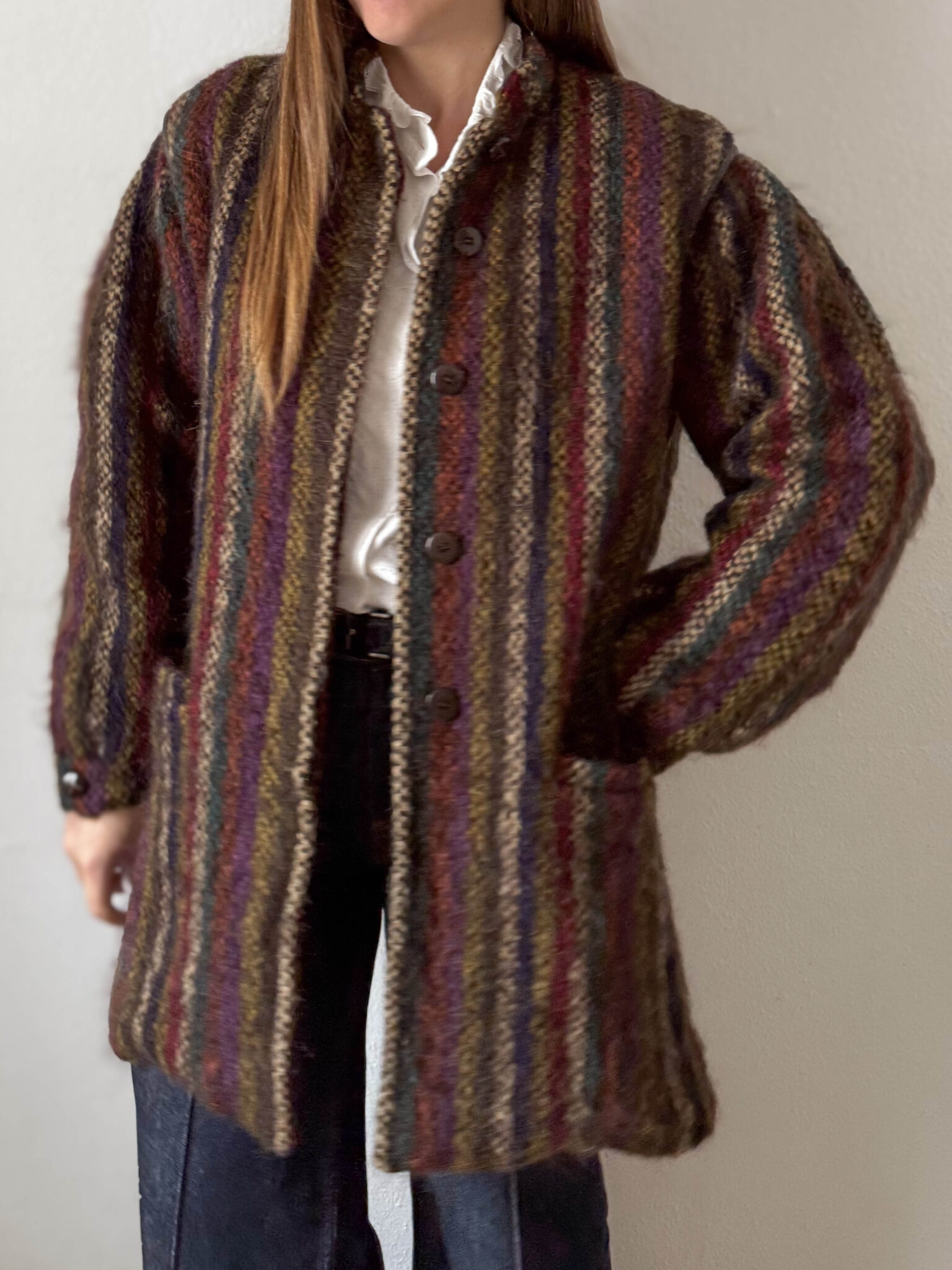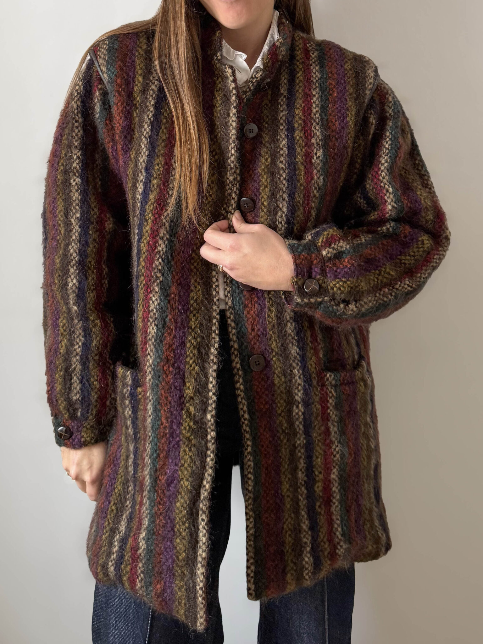 Abrigo lana 80s muy original. Punto grueso con rayas verticales multicolor. Cuello tipo mao y corte en hombros con mangas abullonadas. Prenda de gran calidad.