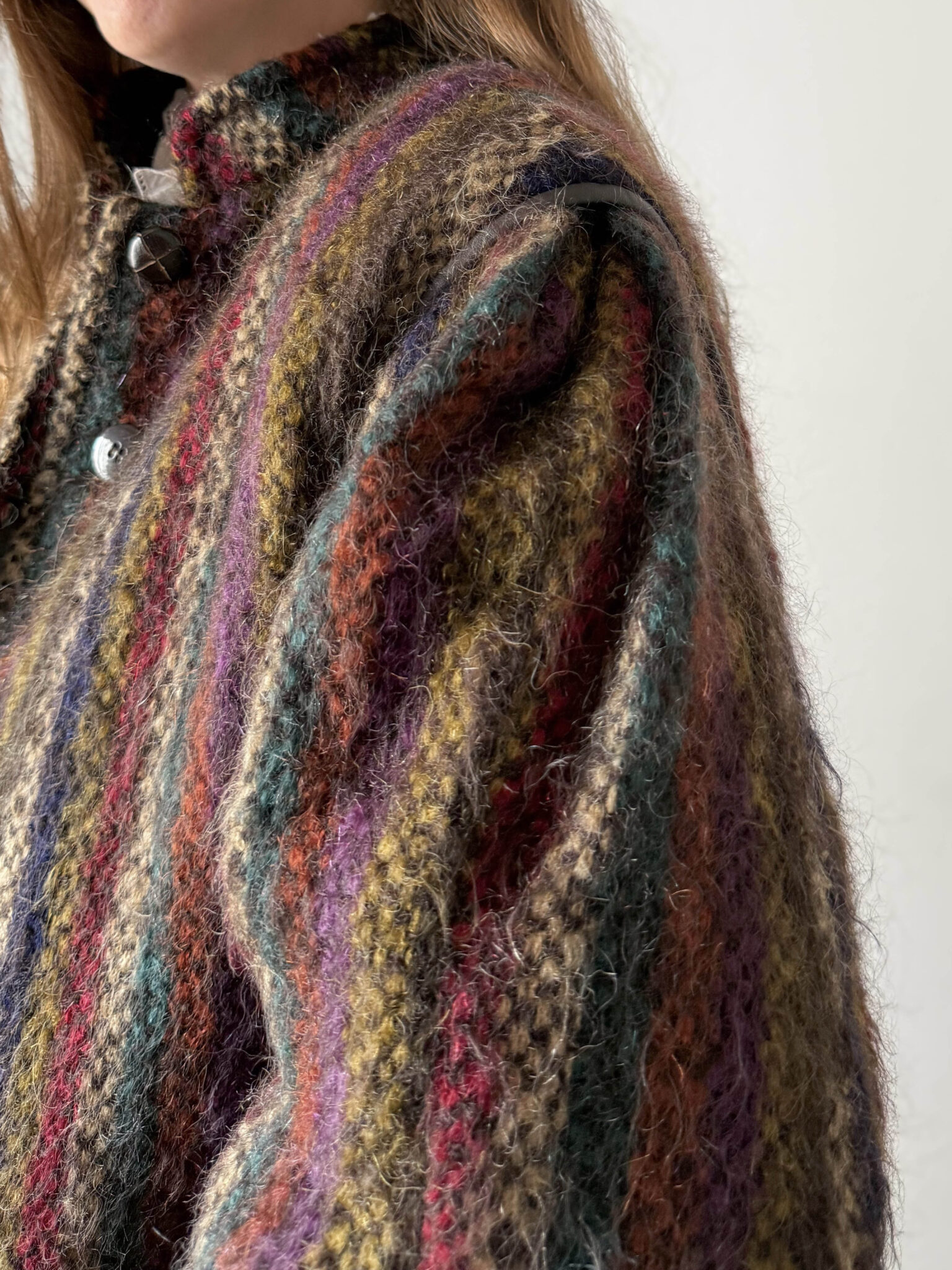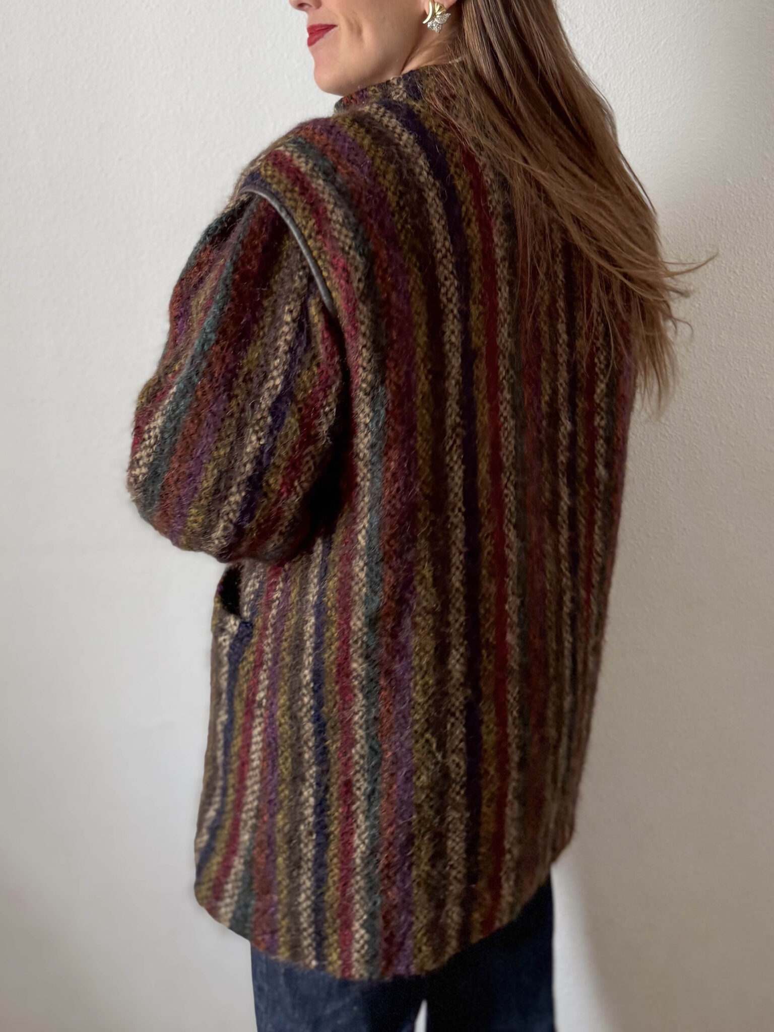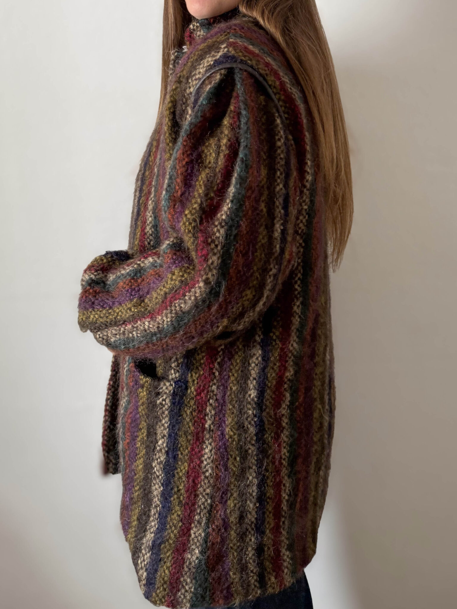 Abrigo lana 80s muy original. Punto grueso con rayas verticales multicolor. Cuello tipo mao y corte en hombros con mangas abullonadas. Prenda de gran calidad.