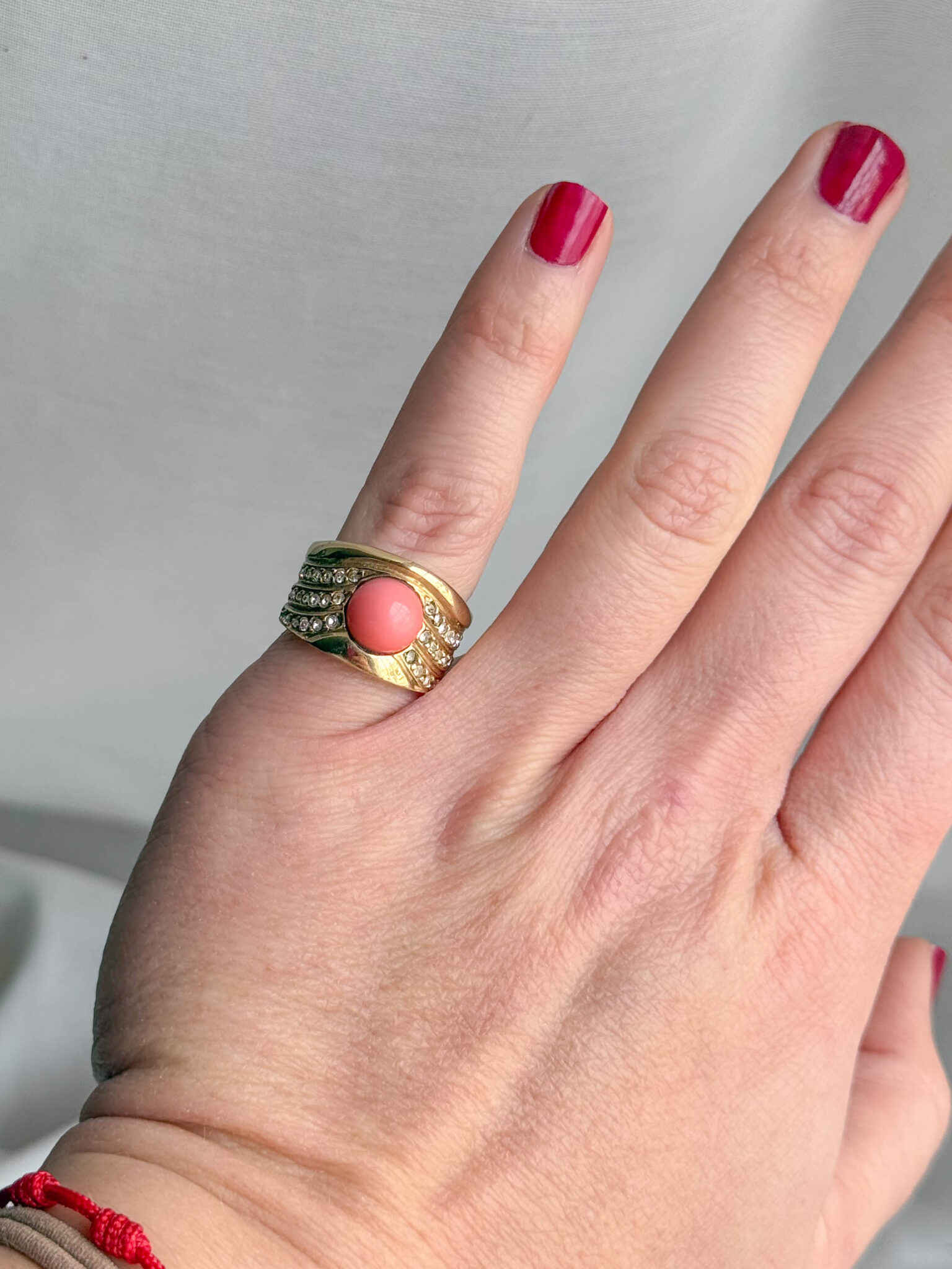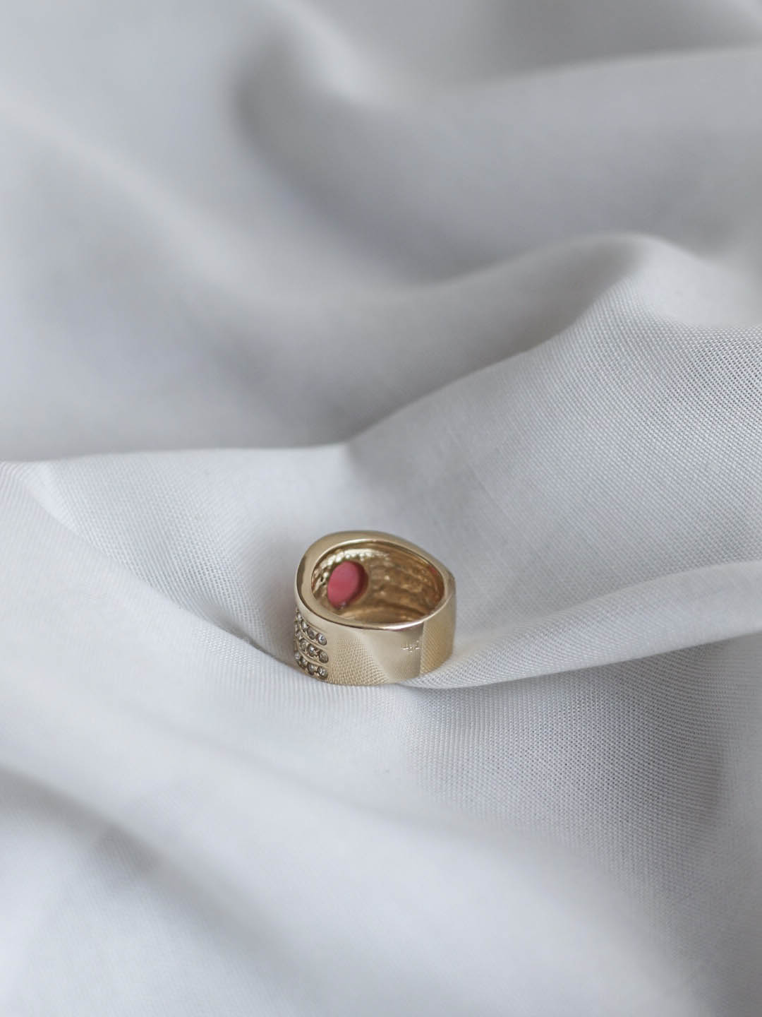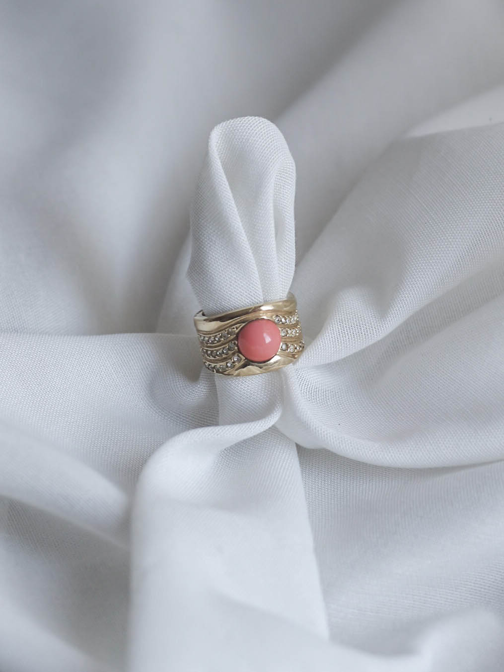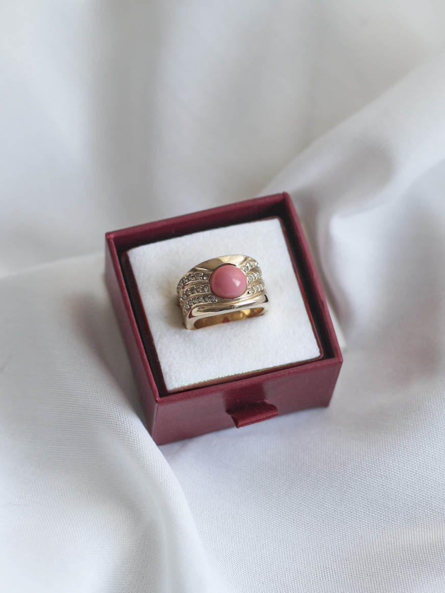 Diseño con volumen y estructura envolvente, con piedra central en tono coral y varias líneas de circonitas engastadas que aportan brillo y textura a la pieza.