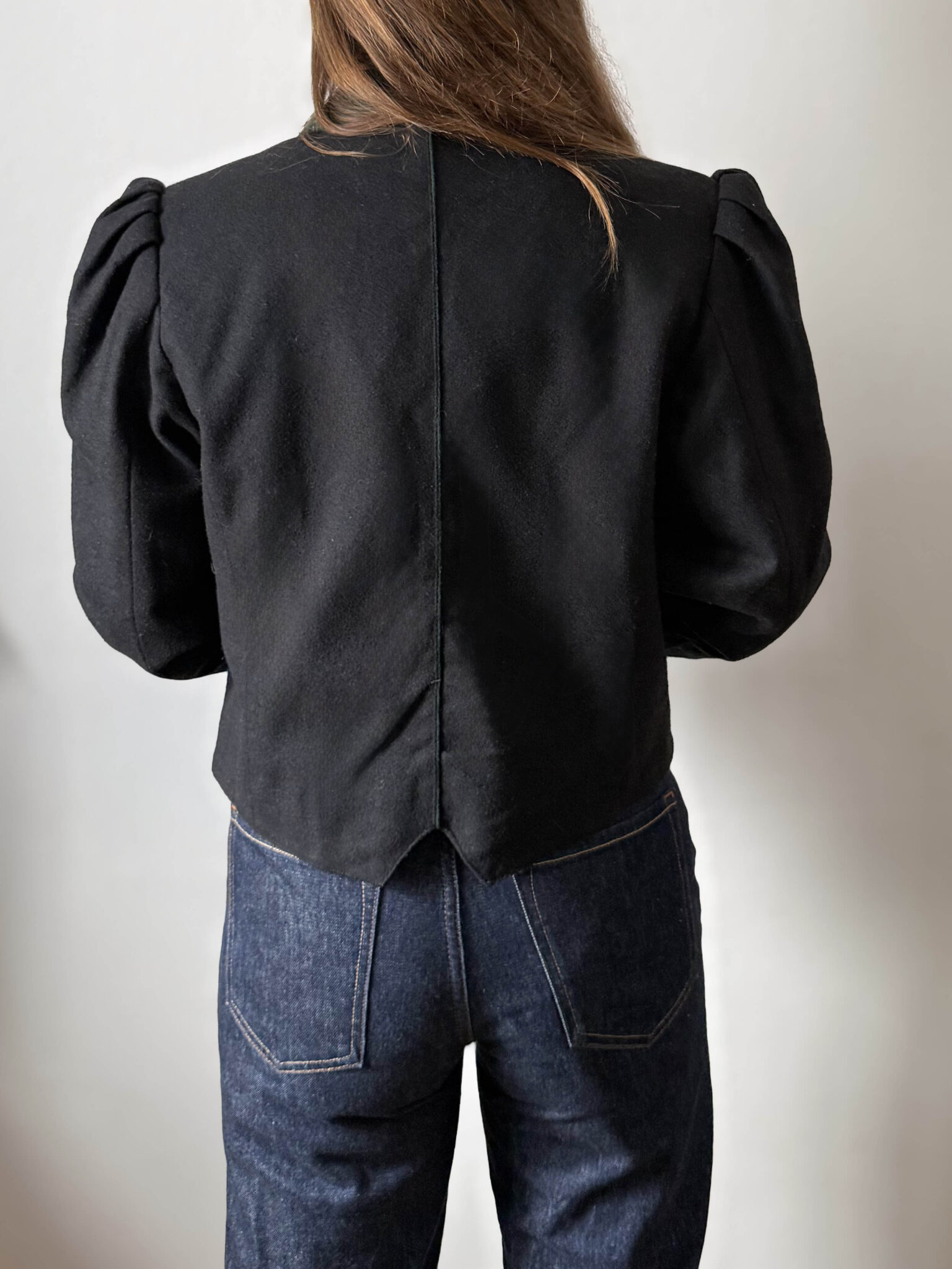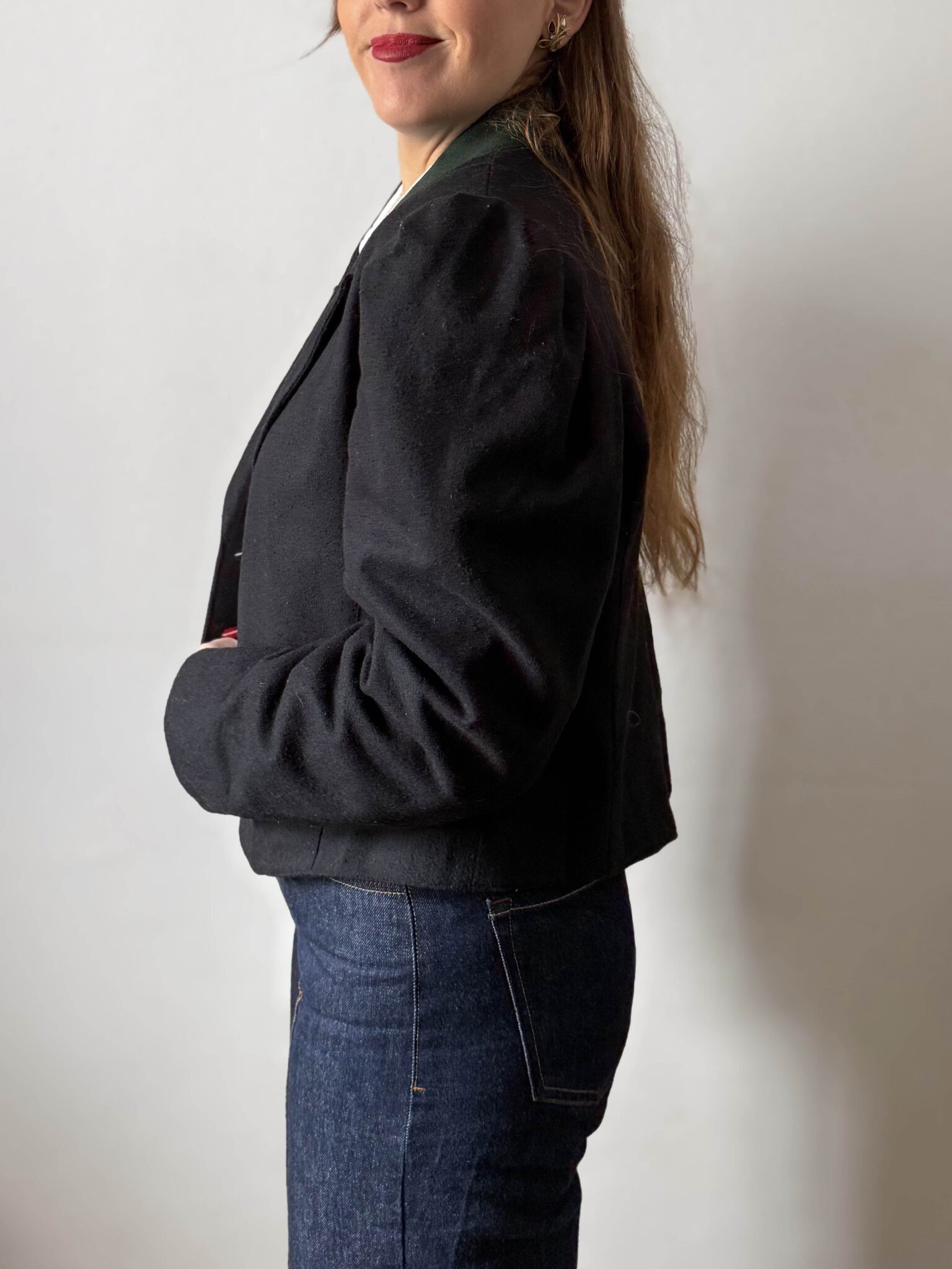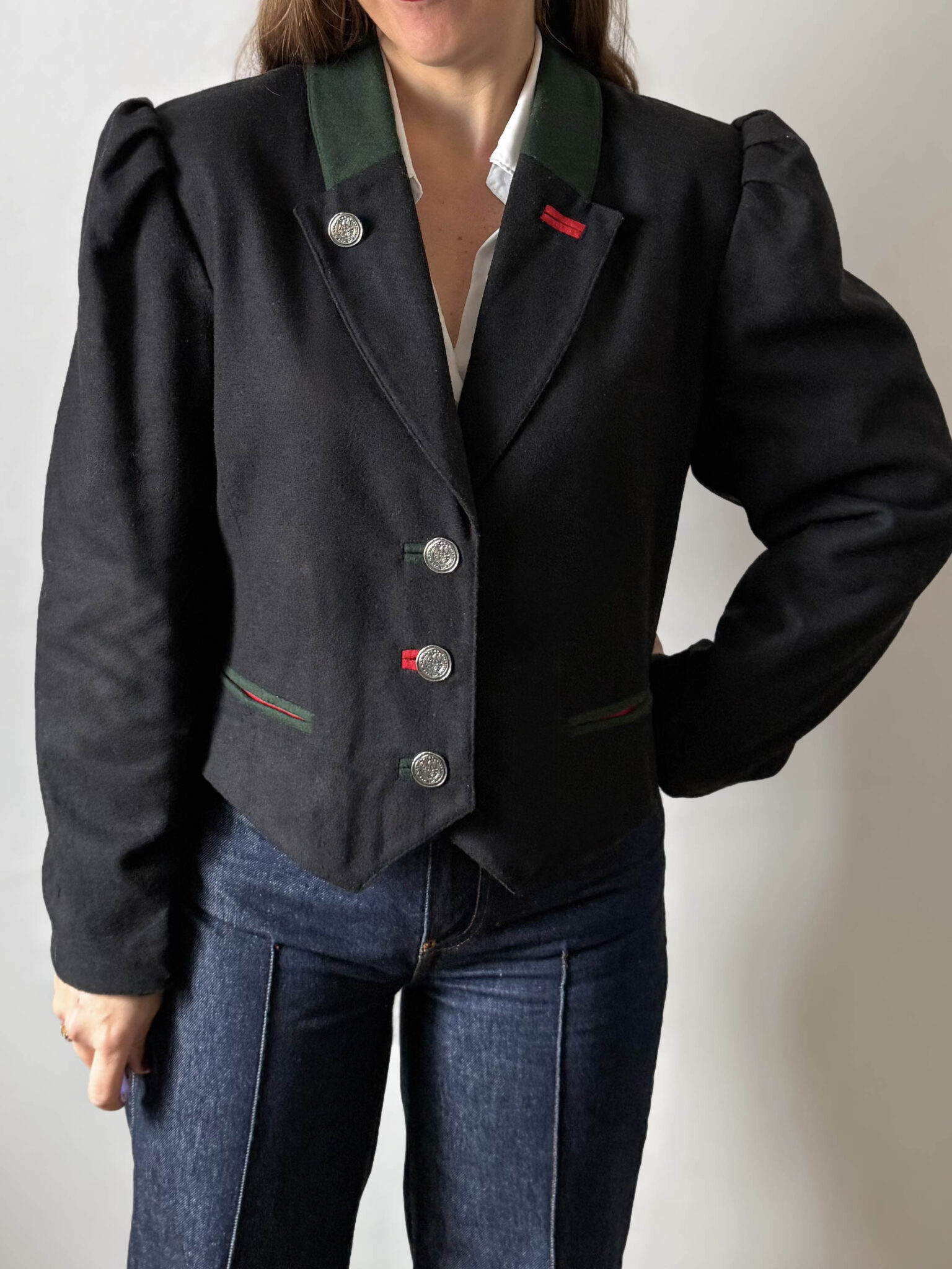 Austriaca mangas abullonadas color negra con hombreras marcadas y silueta estructurada. Detalles en verde y rojo y botones metálicos.
