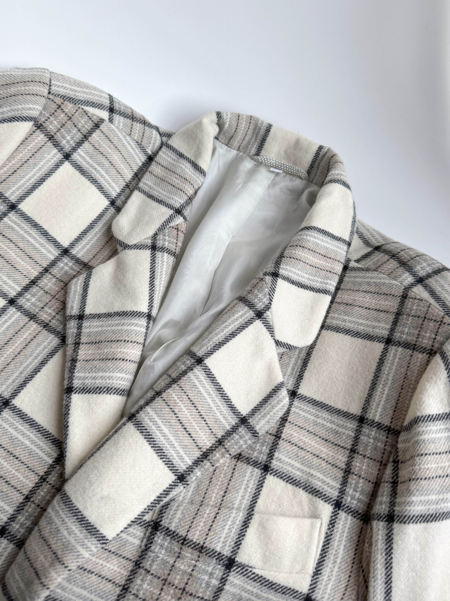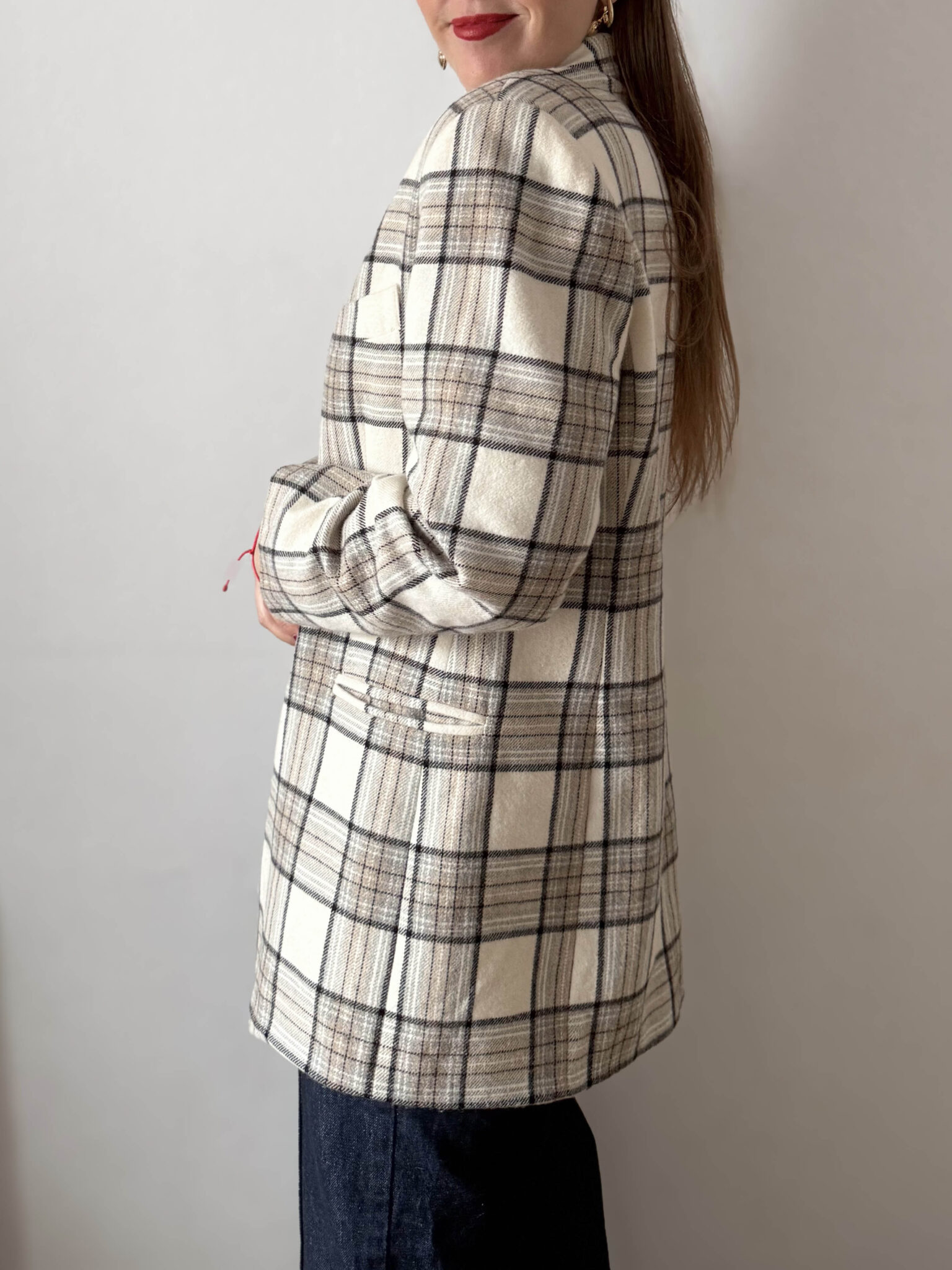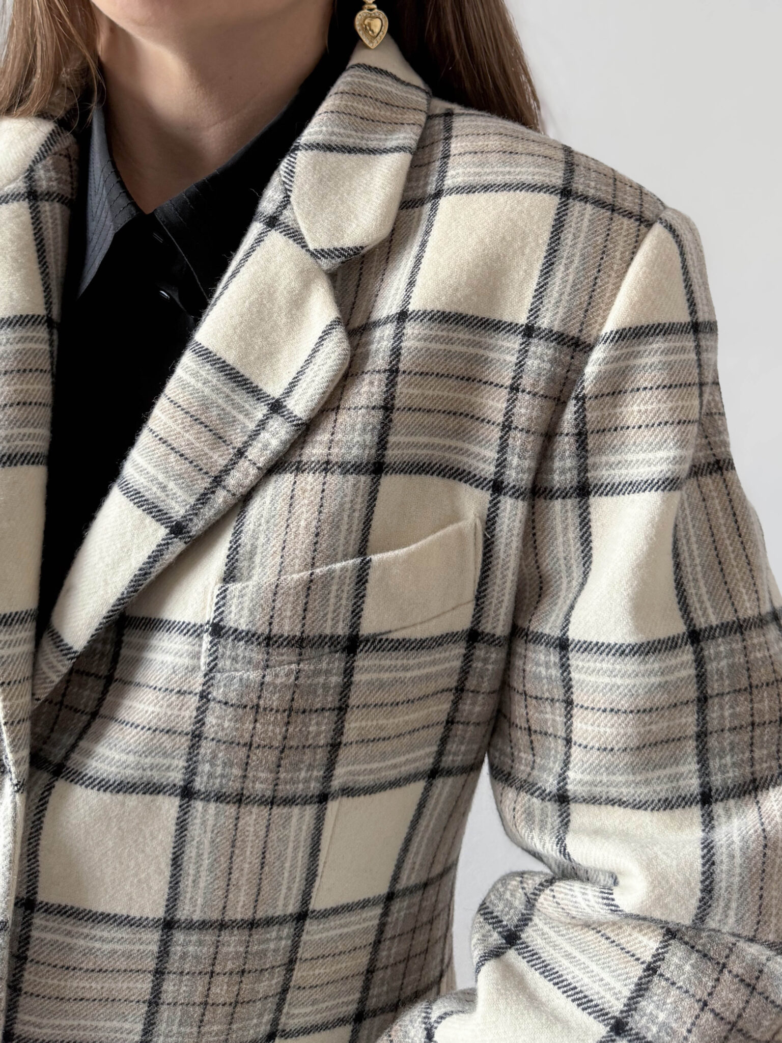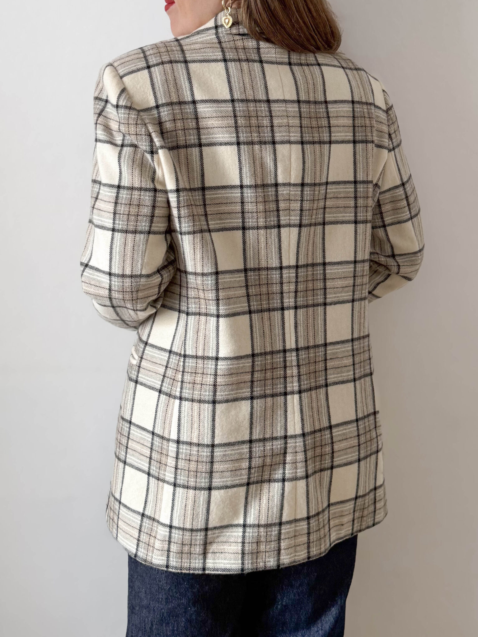 Blazer cuadros grises vintage. Tejido abrigado, hombros estructurados, corte recto y bolsillos. Muy fácil de combinar, fondo de armario.