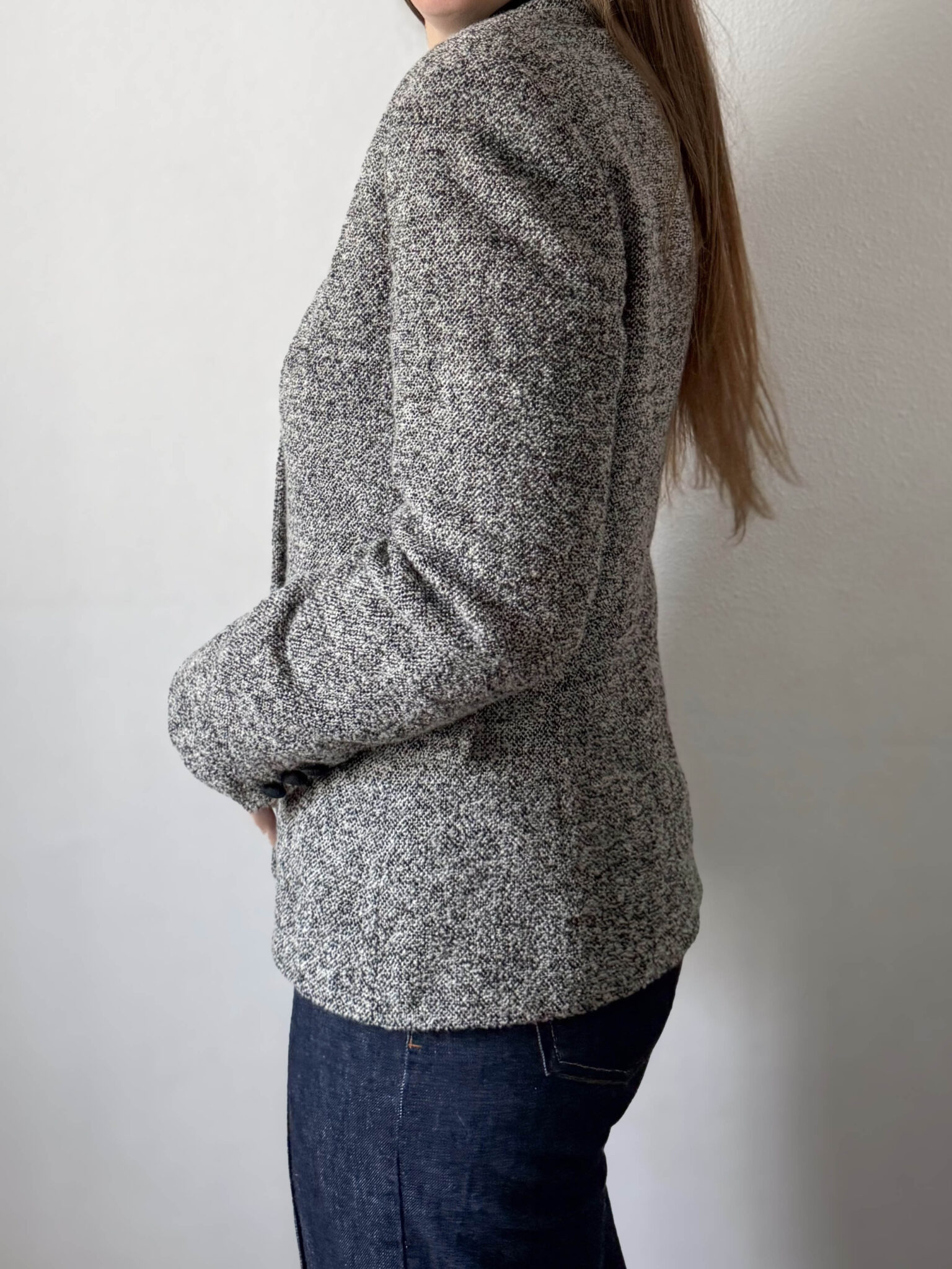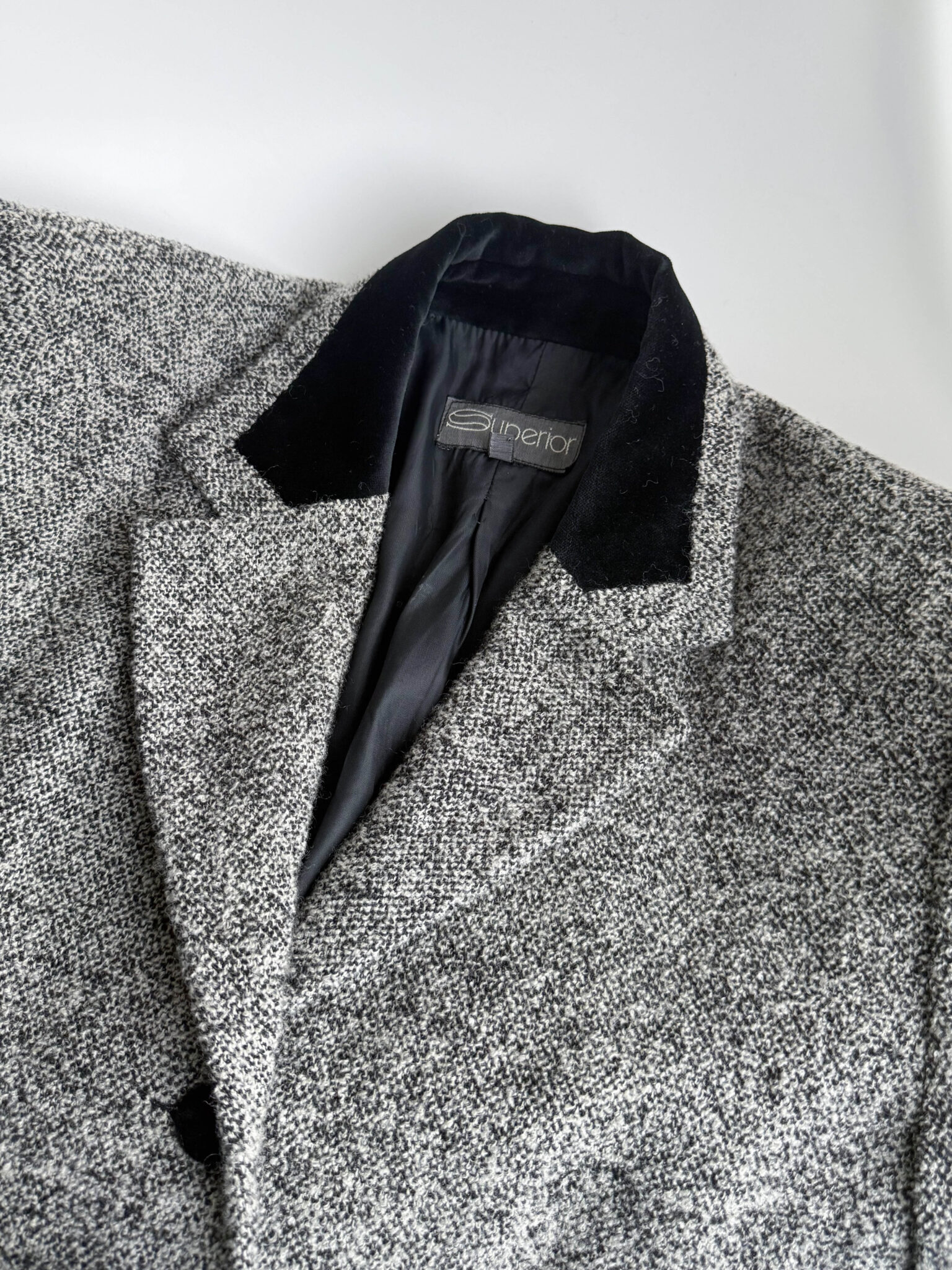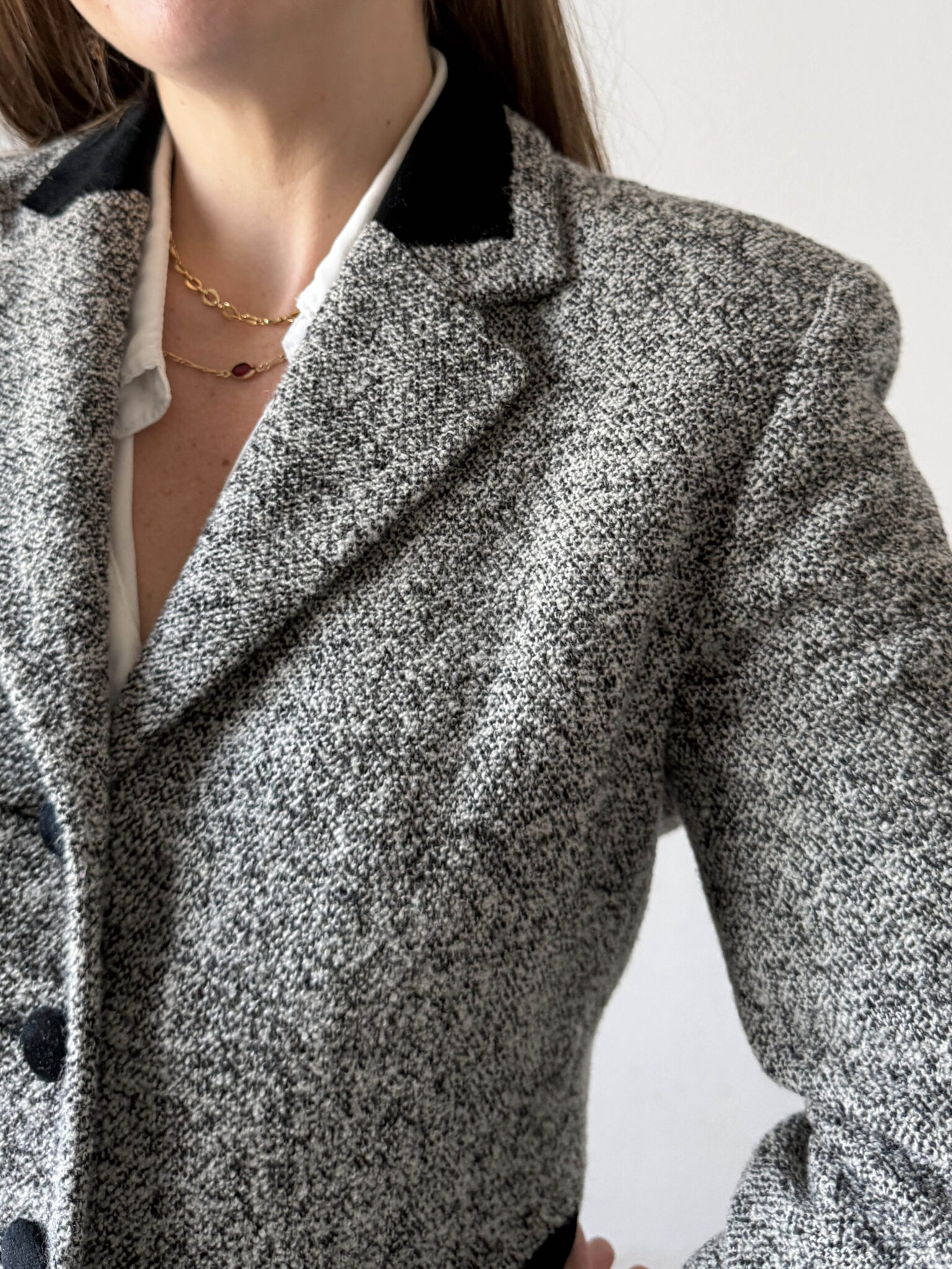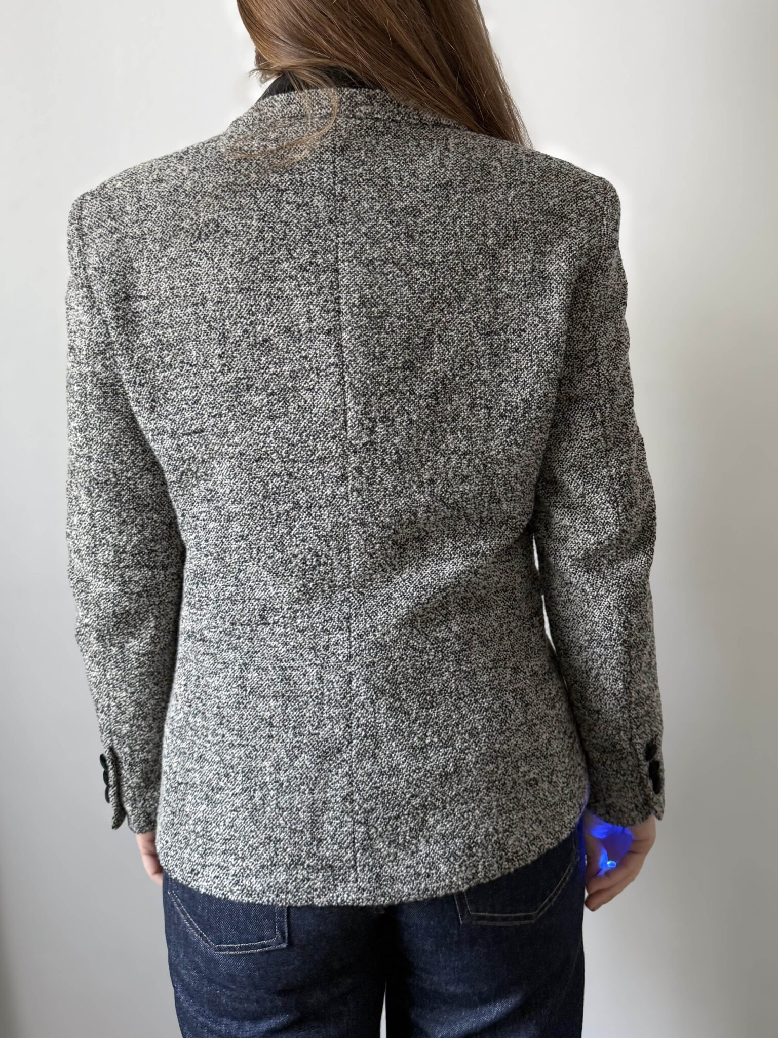 Blazer jaspeada vintage fabricada en Italia. Tejido en gris y negro. Hombros estructurados, silueta ligeramente entallada y detalles en terciopelo negro.