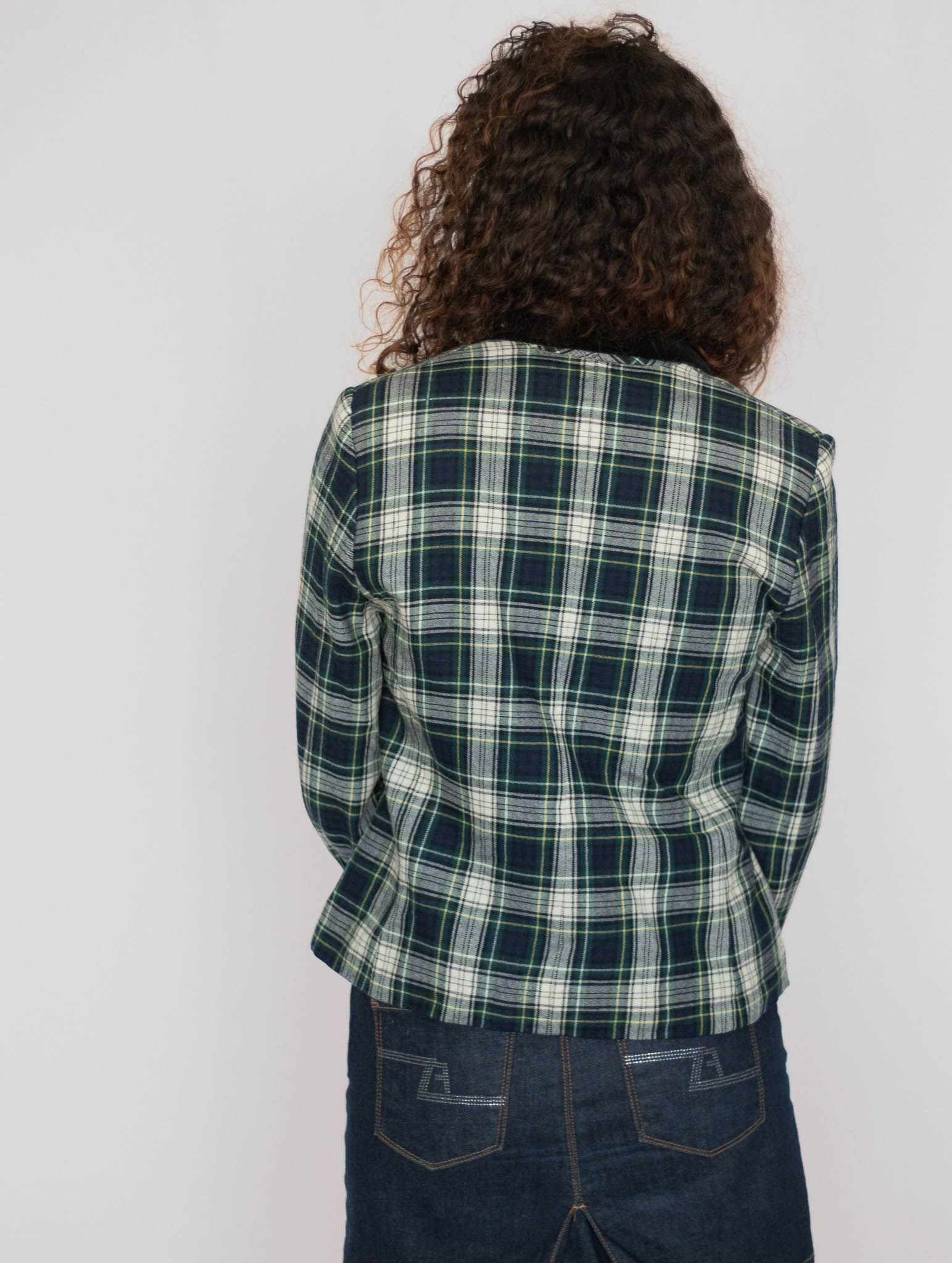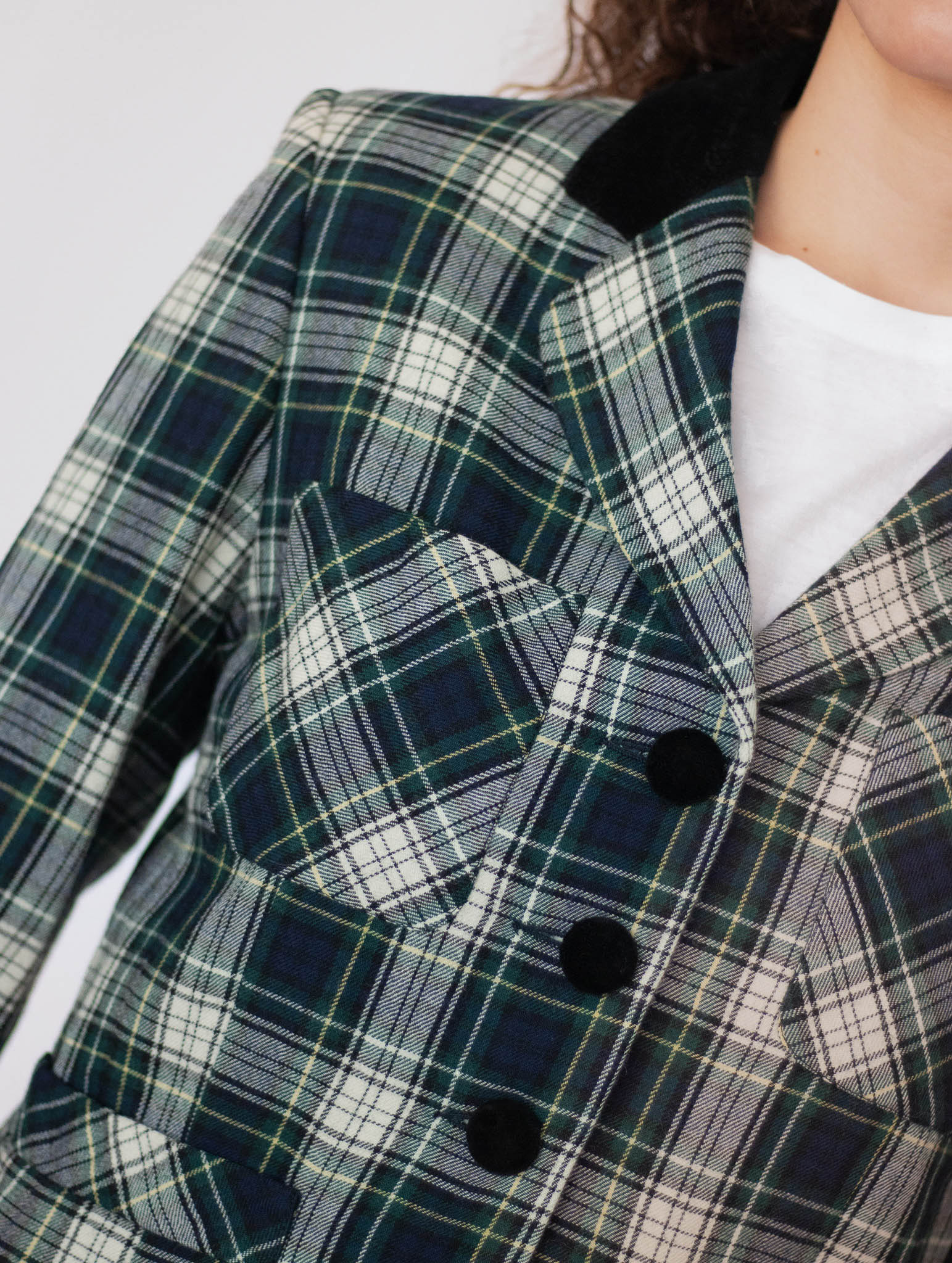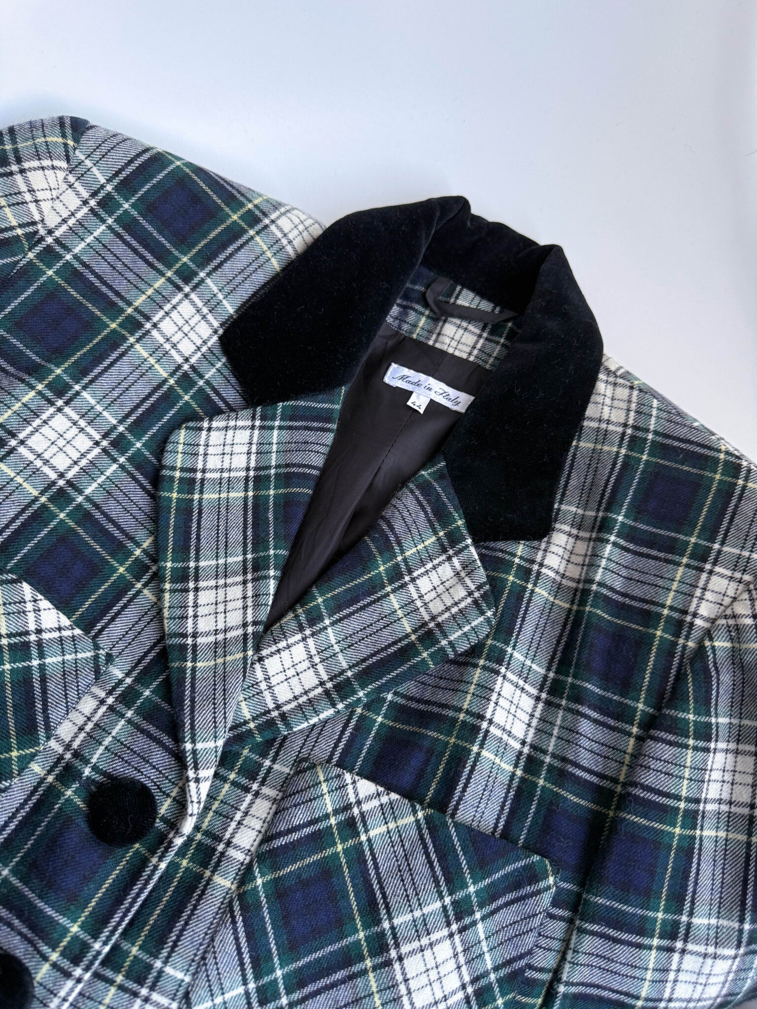 Blazer tartan vintage, tejido de cuadros en tonos verdes, azules y blancos. Detalles de solapa de cuello y botones en terciopelo color negro.
