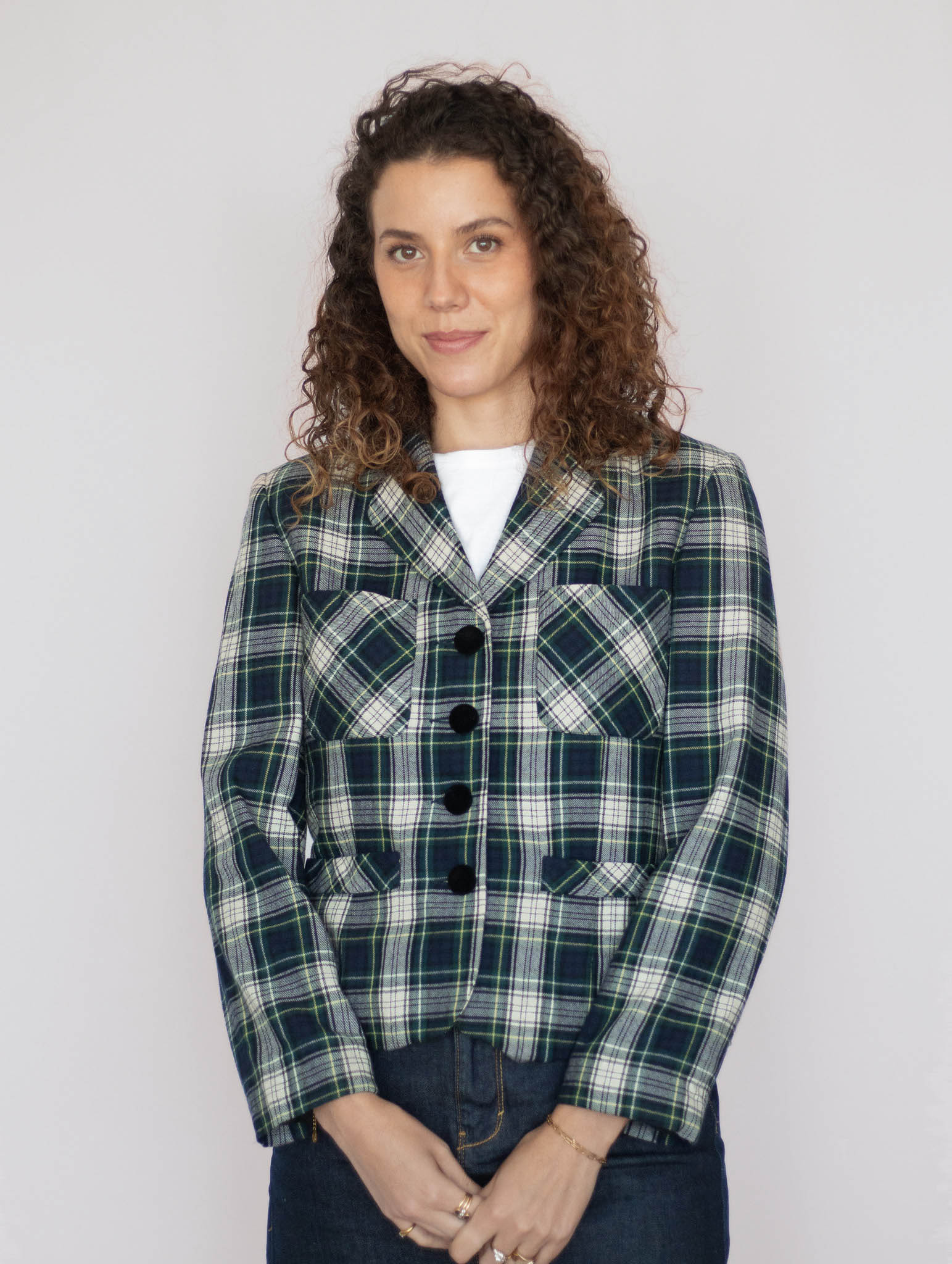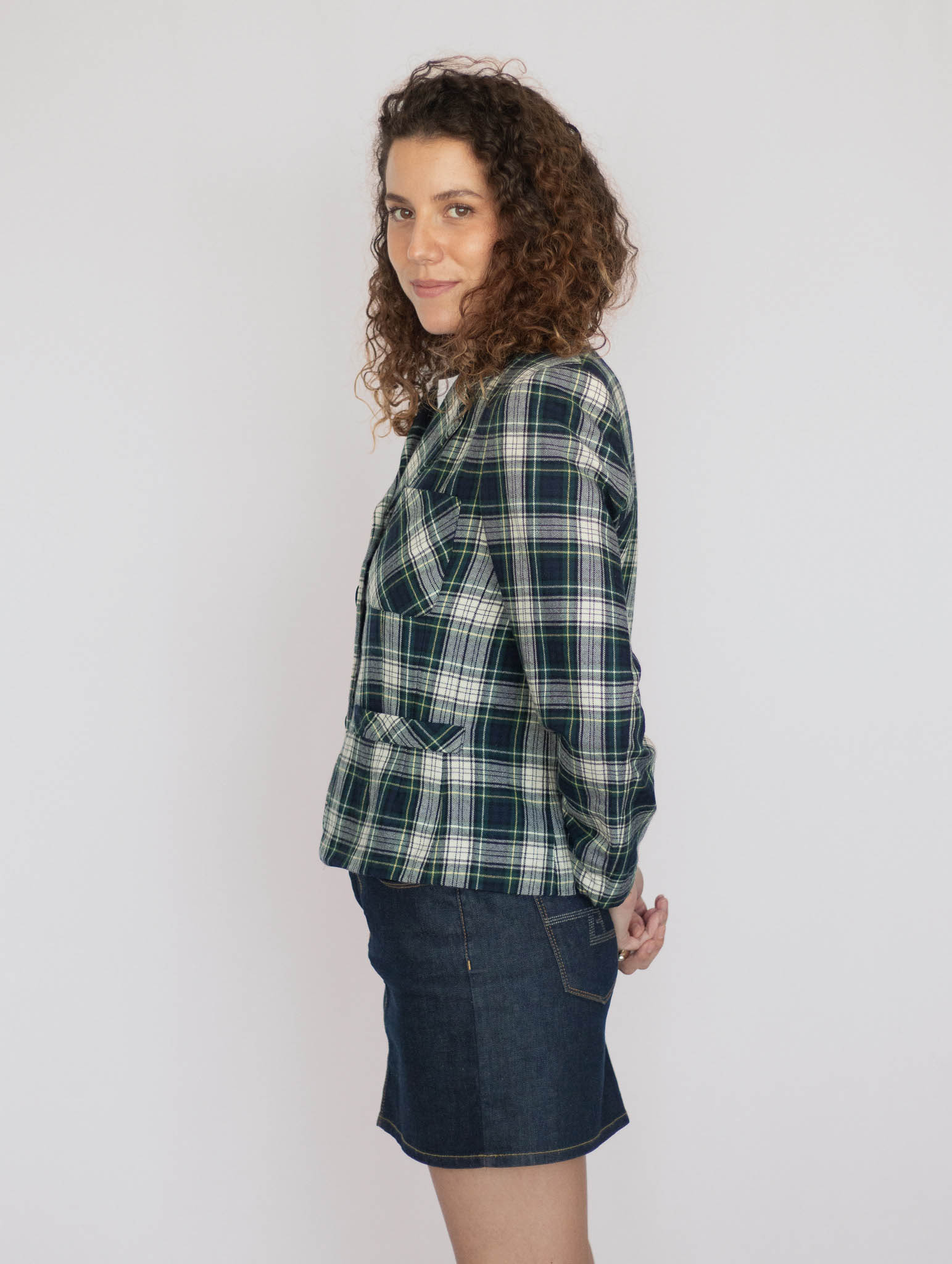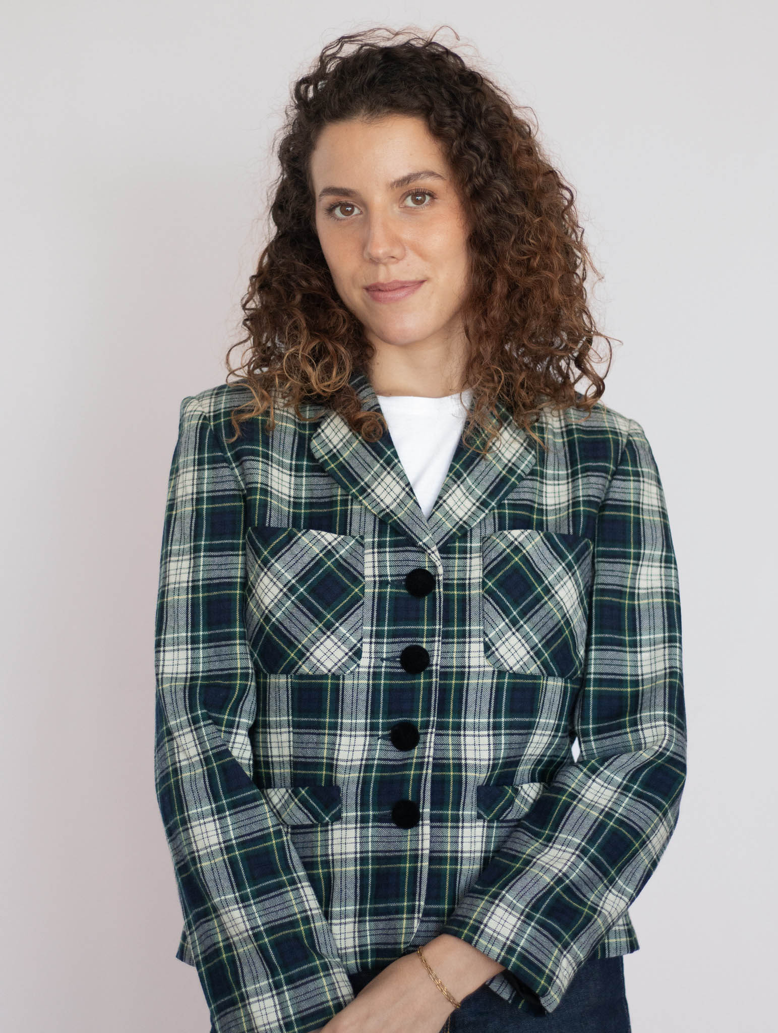 Blazer tartan vintage, tejido de cuadros en tonos verdes, azules y blancos. Detalles de solapa de cuello y botones en terciopelo color negro.