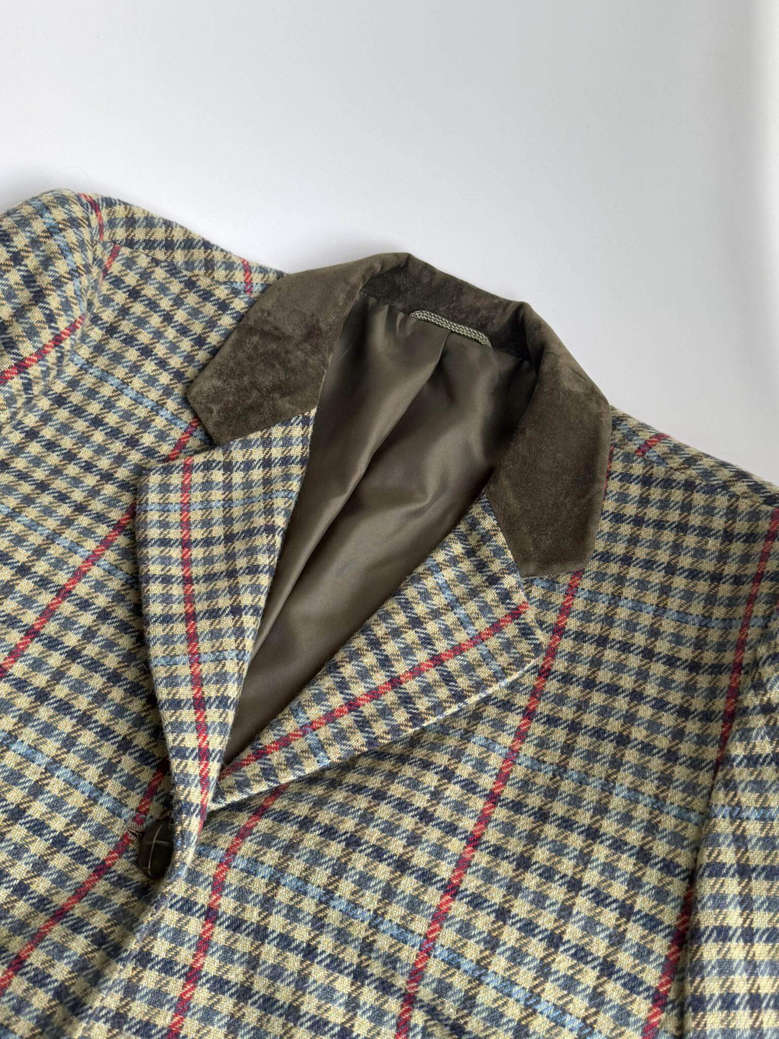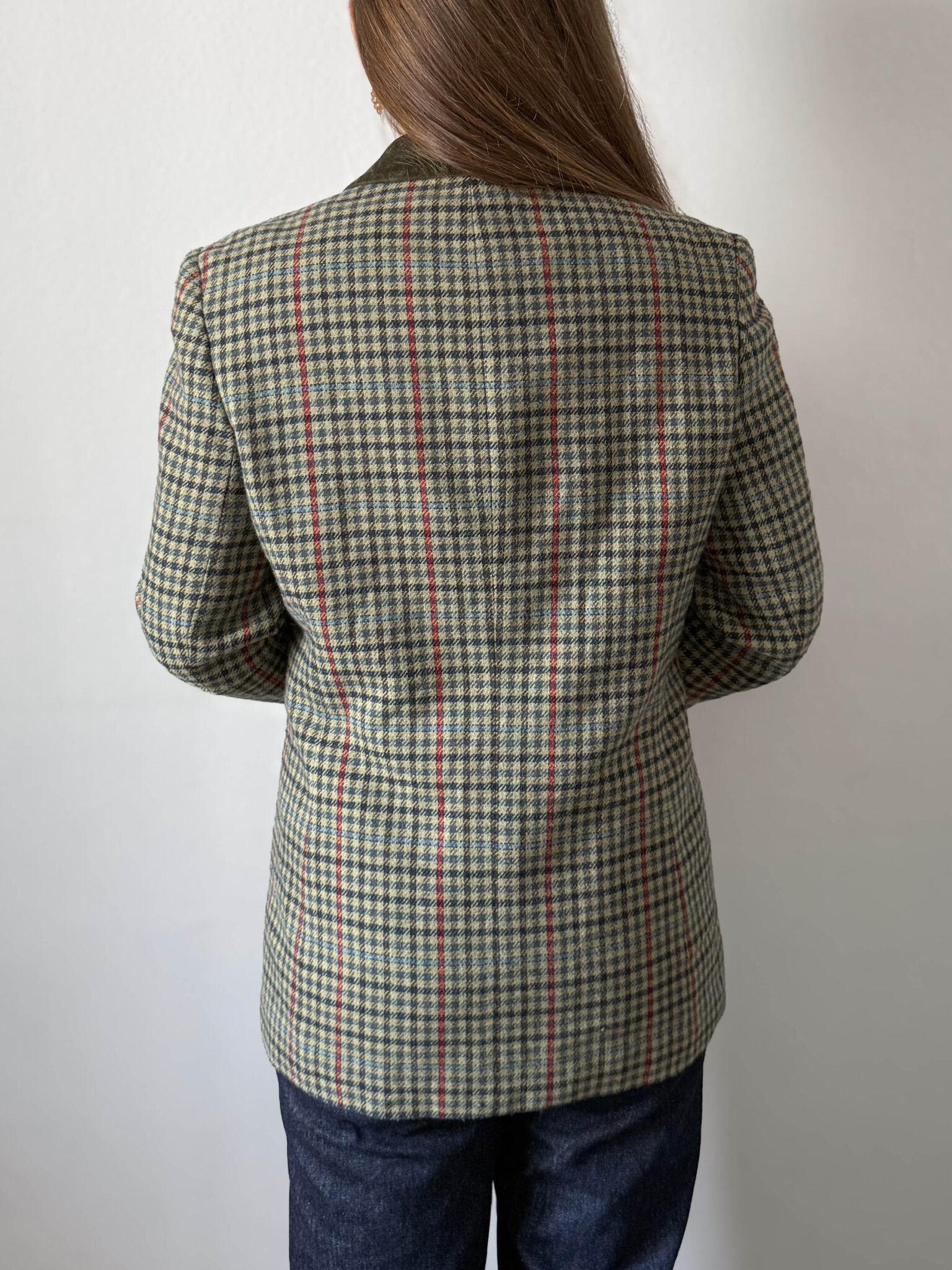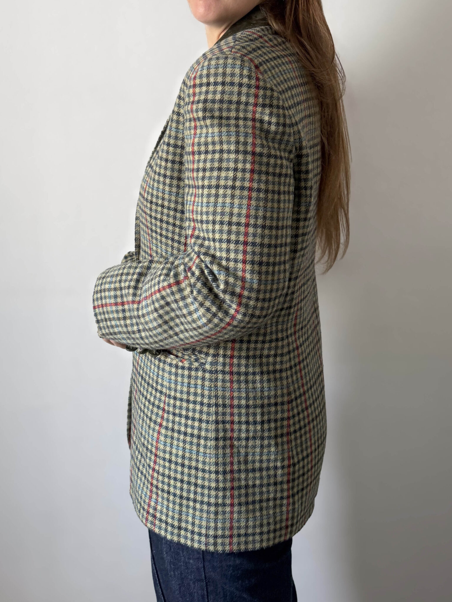 Blazer vichy verde combinado con rojo y celeste. Corte recto, hombreras y detalle de solapa de cuello en antelina verde. Tiene bolsillos.