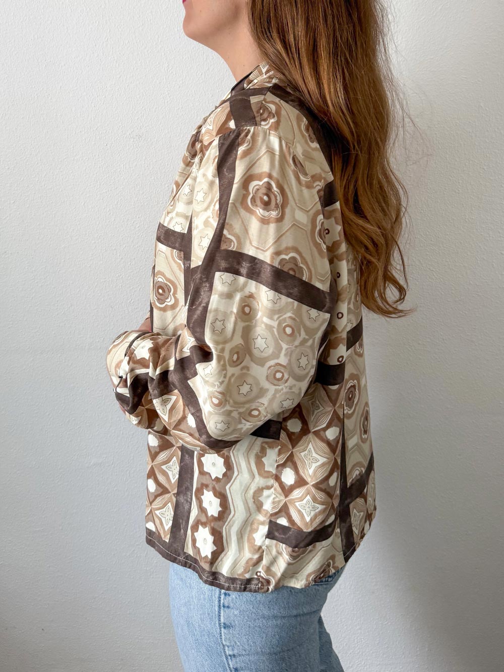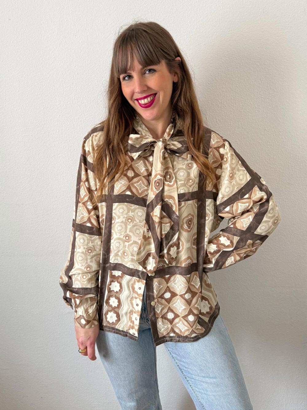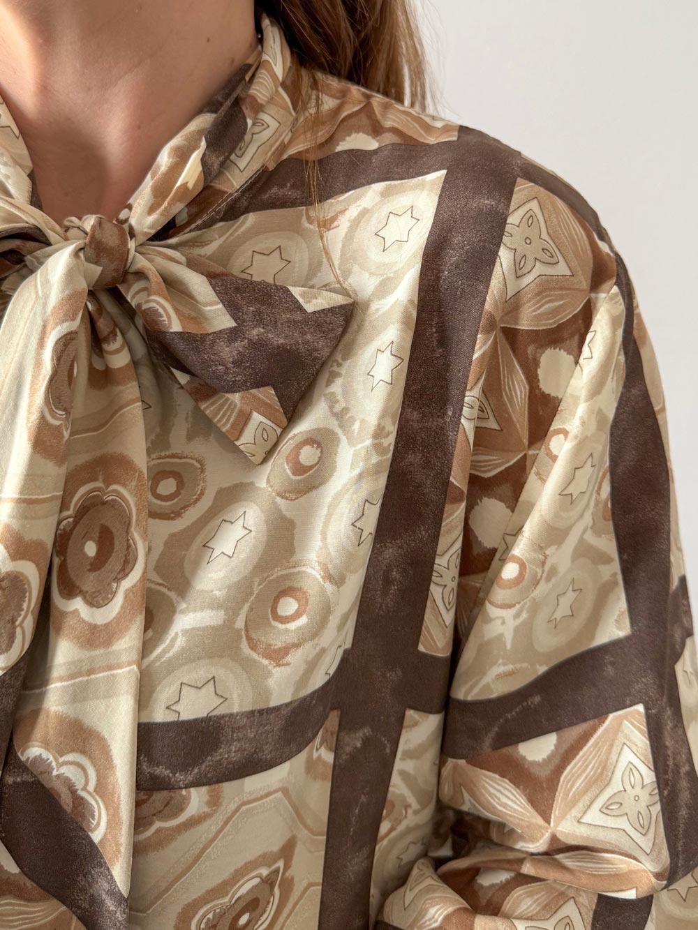 Blusa beige con lazada en escote. Estampado con formas geométricas y florales en tonos beige y marrones. Bonita caída.
