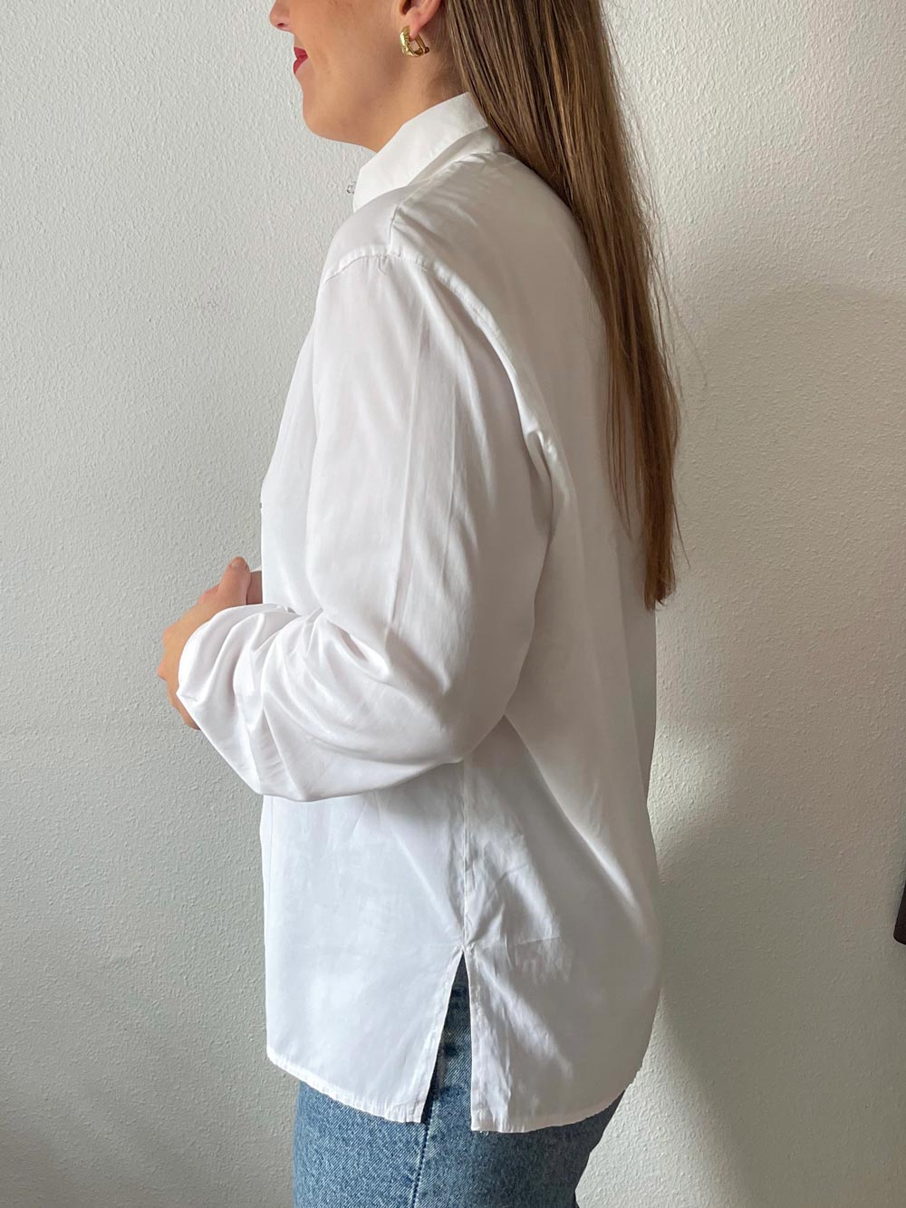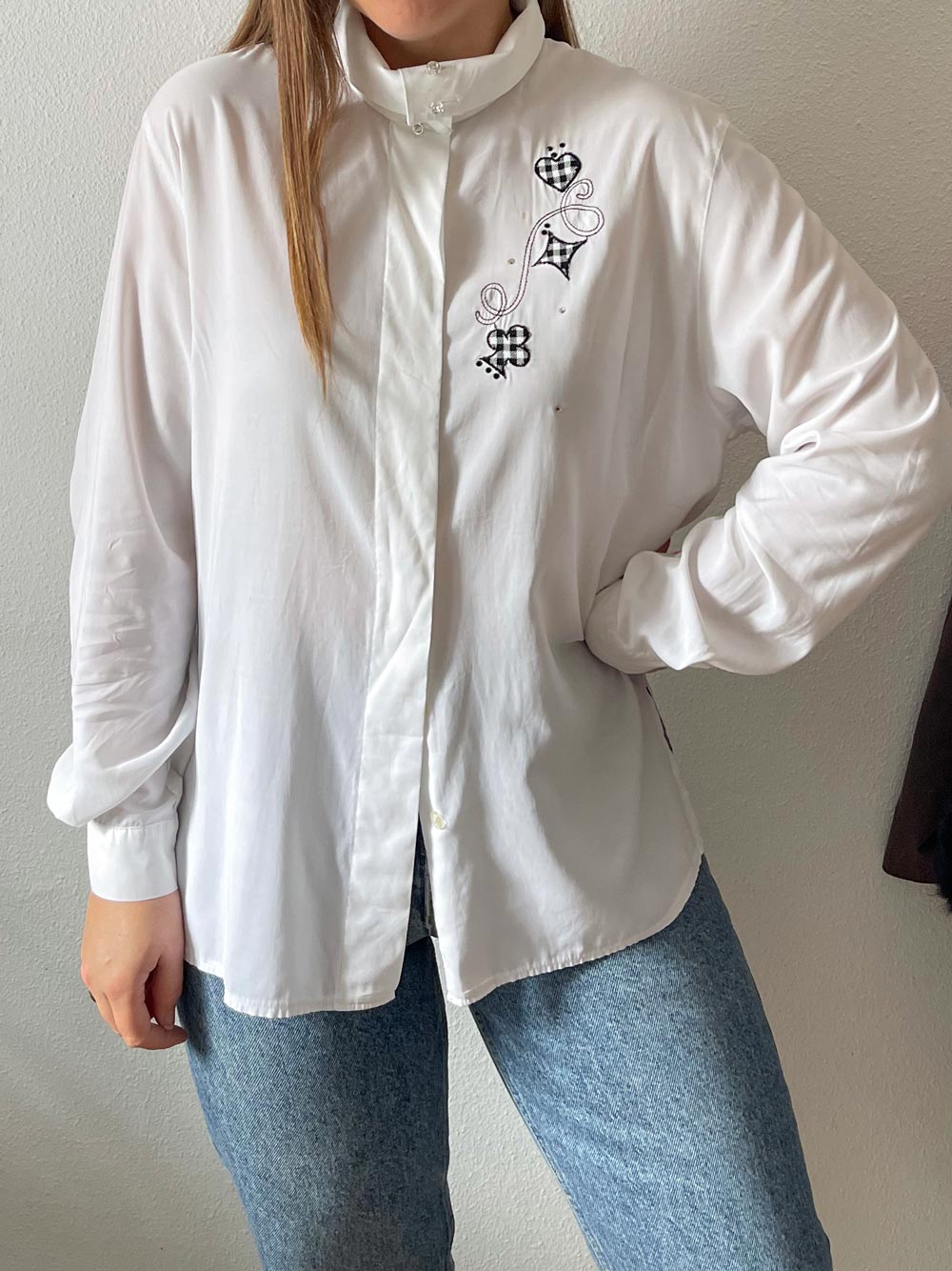 Blusa con cuello vuelto en color blanco. Detalle bordado en negro a un lado con perlitas. Cierre de cuello con botones cristalinos ideales.