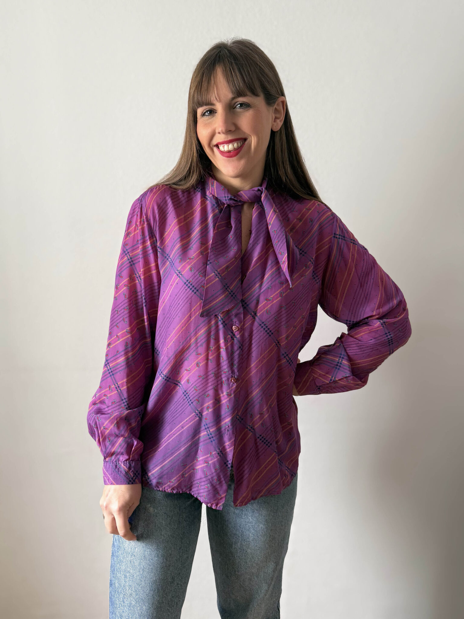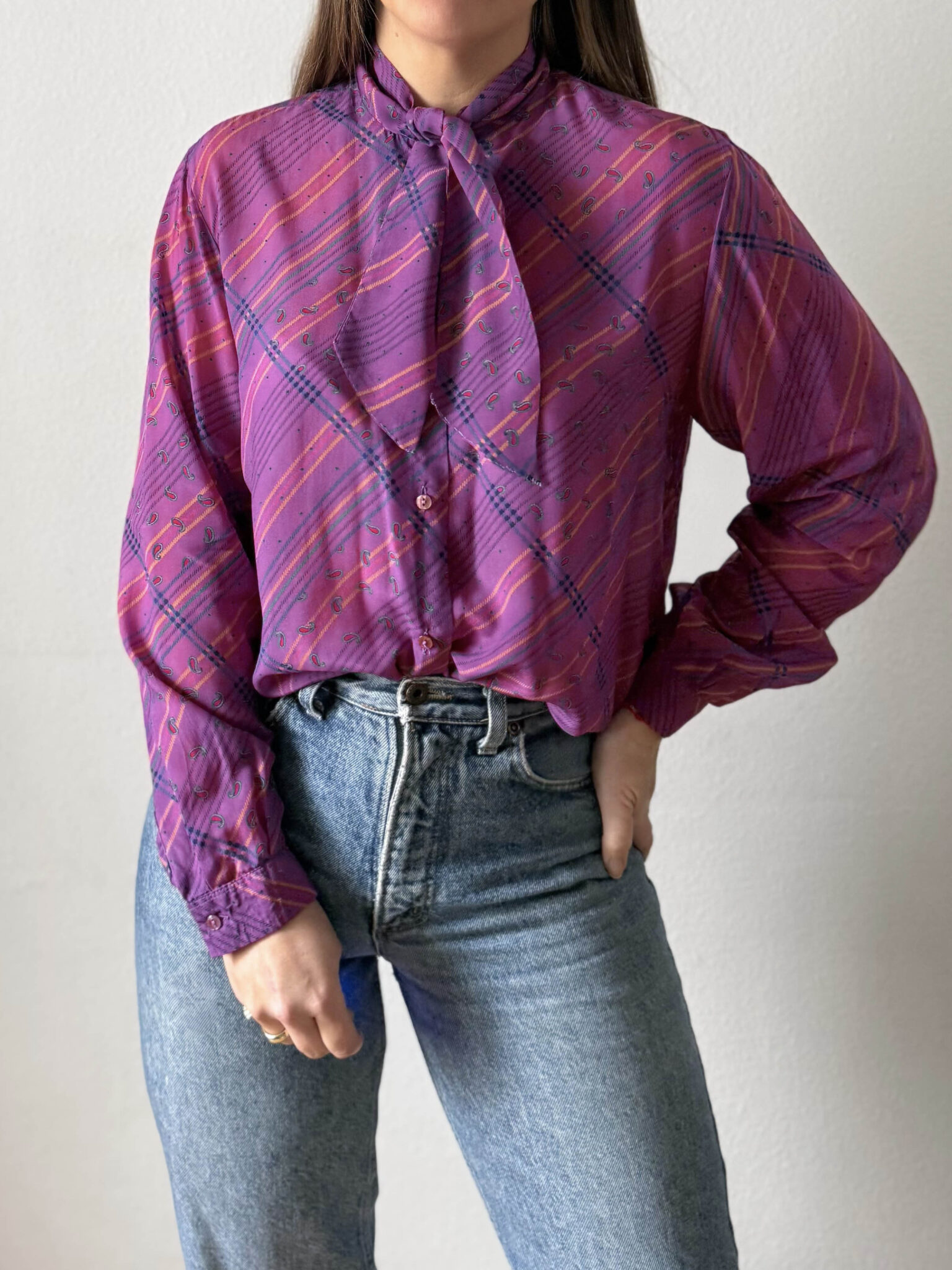 Blusa con lazada 70s. Color rosa con estampado a rayas y motivos paisley. Lazada en cuello, tejido sedoso. Fabricada en Italia.