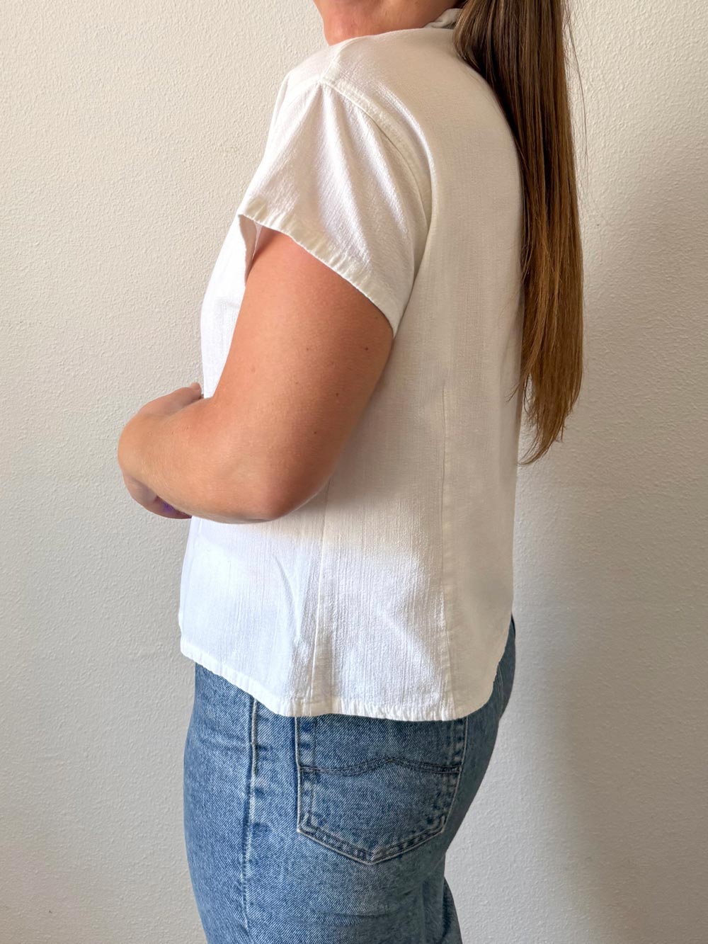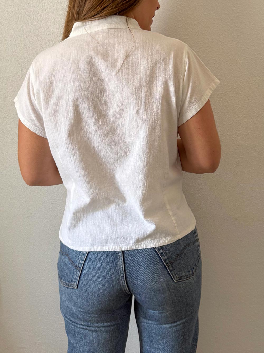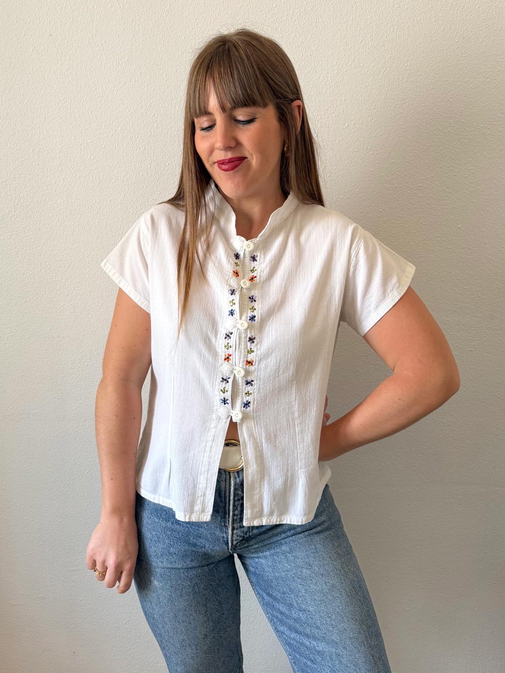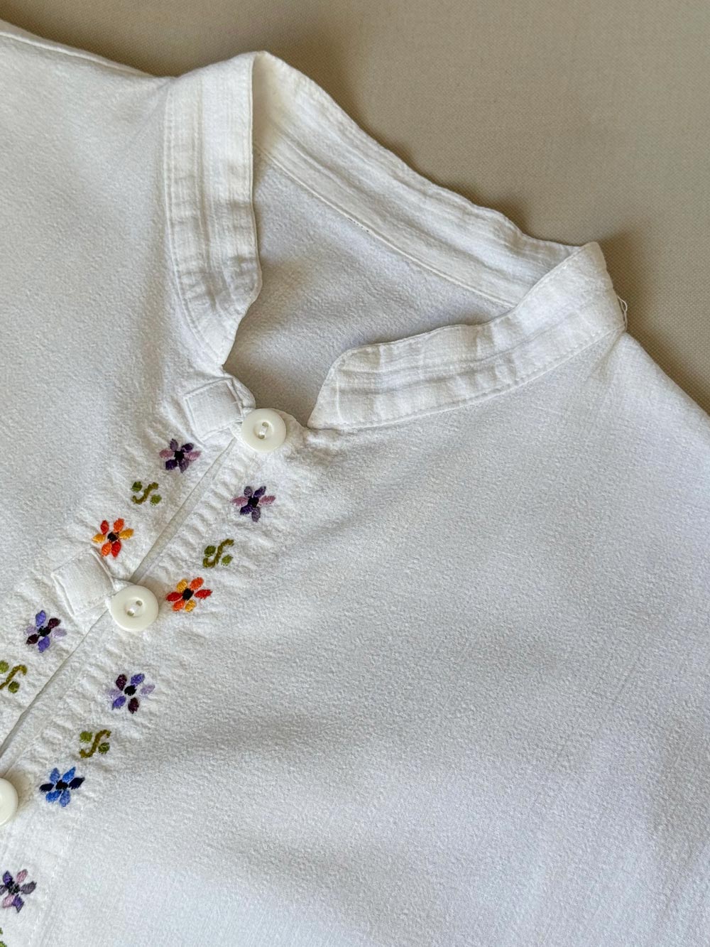 Blusa corte oriental vintage. Color blanco con cuello tipo mao y tejido tipo bambula. Detalles florales bordados en cierre delantero.