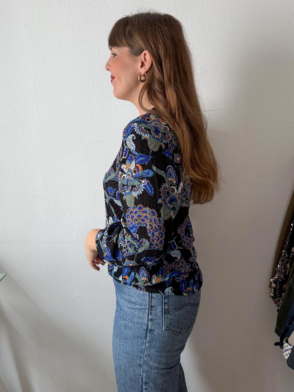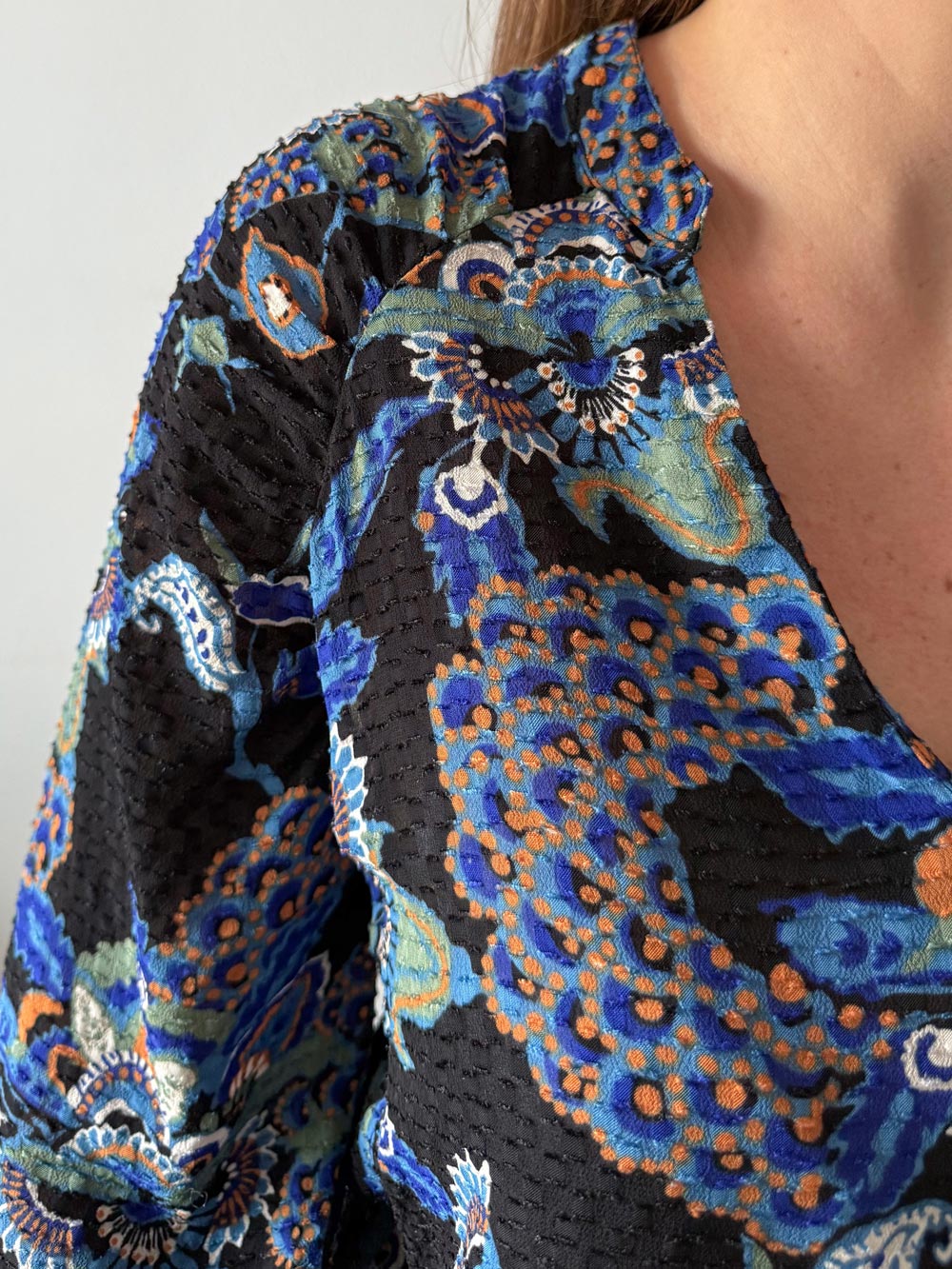 Blusa escote V con estampado floral y tejido semi transparente en tonos azules, mostazas y blancos sobre fondo negro. Manga 3/4