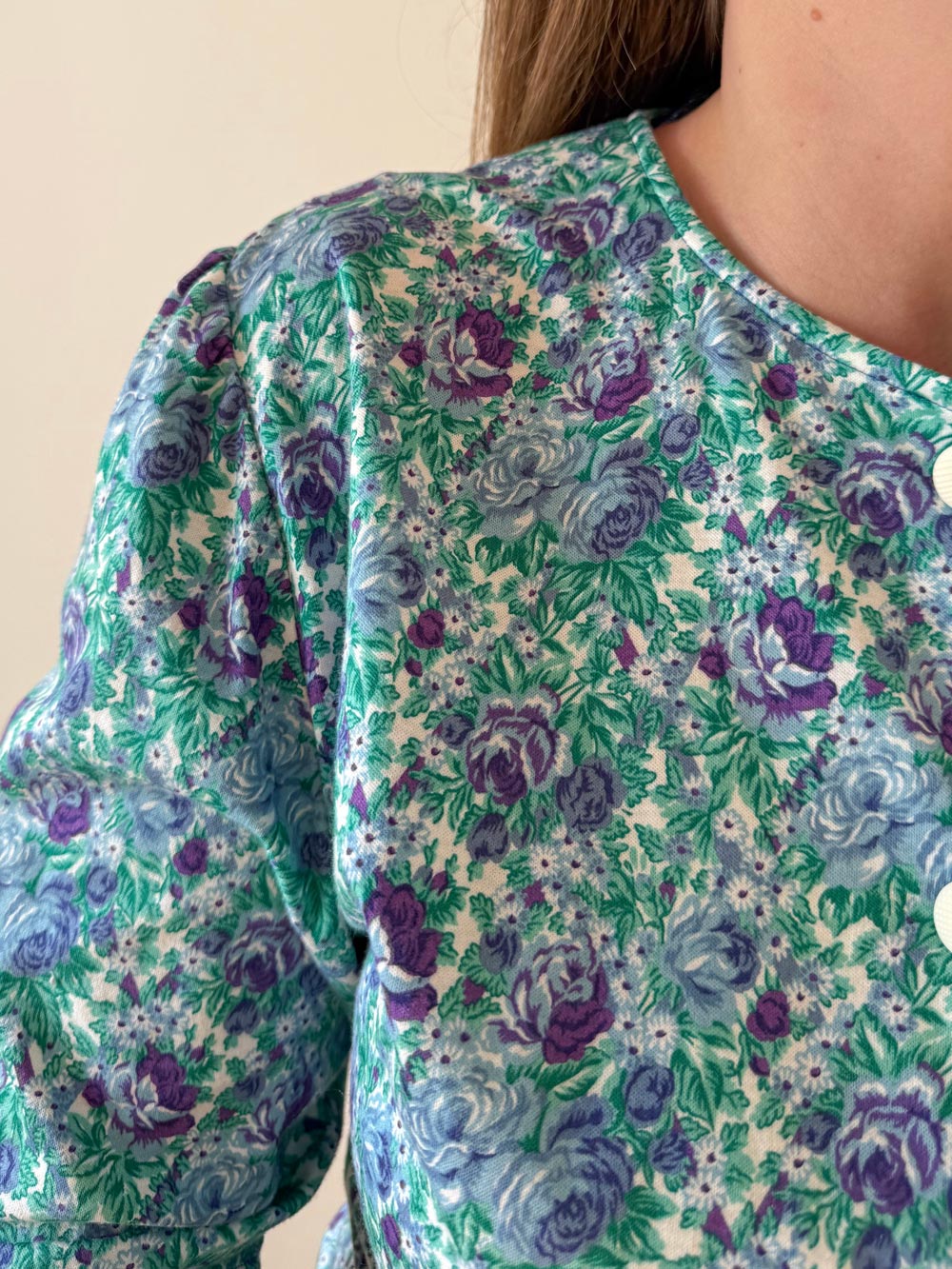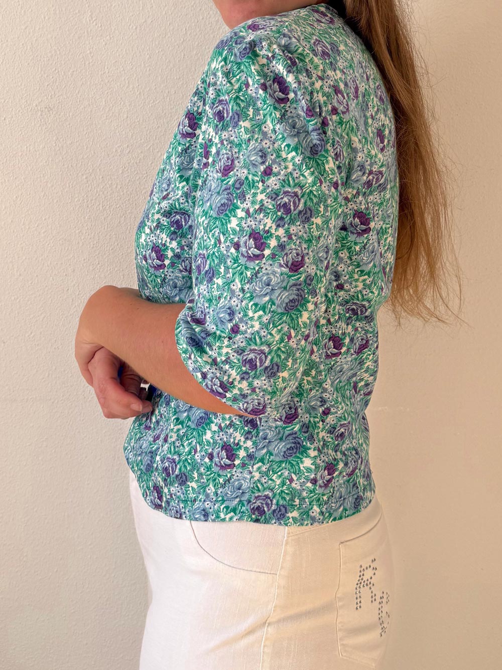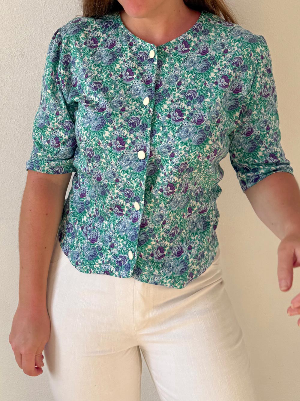 Blusa flores aguamarina vintage. Tejido elástico, estampado de rosas en tonos azules y verdes. Botones blancos. Lleva pinzas en cintura.