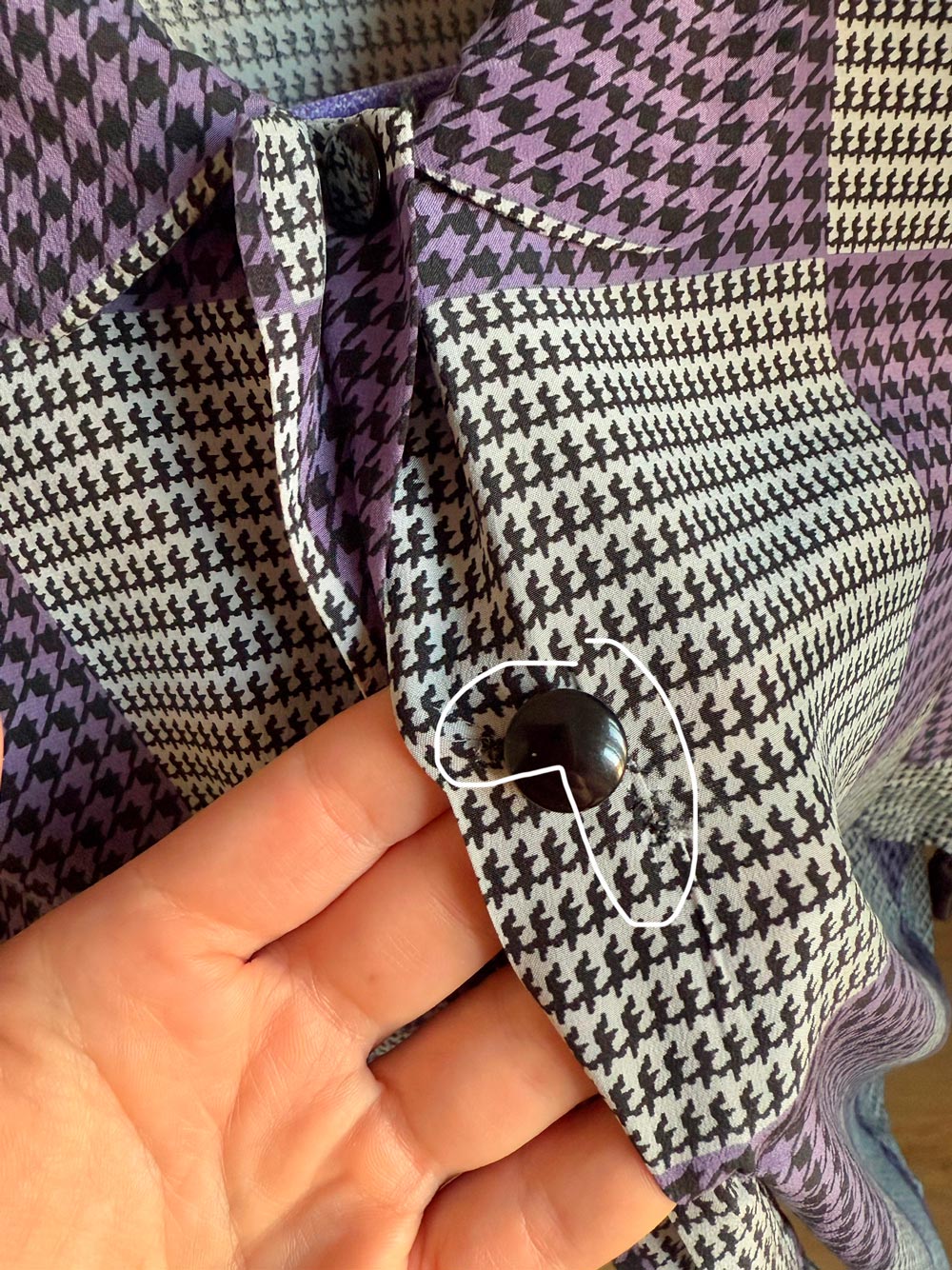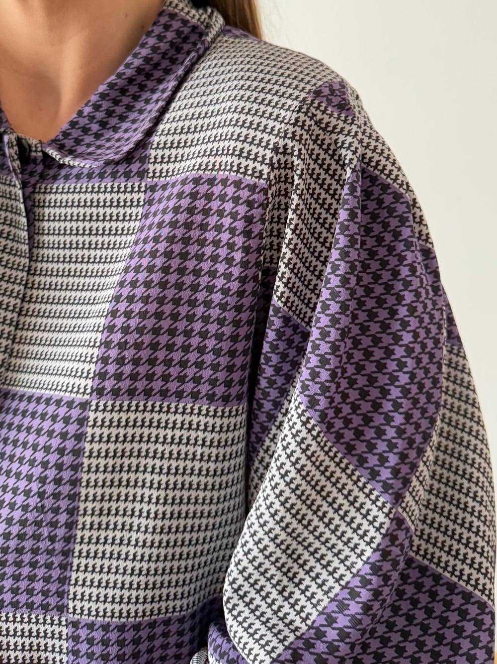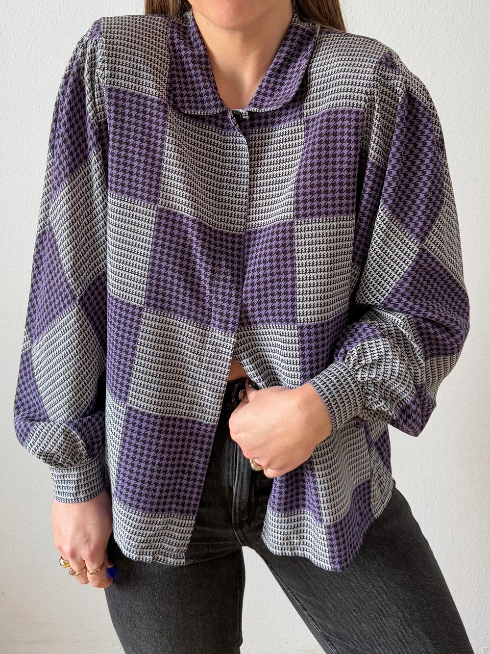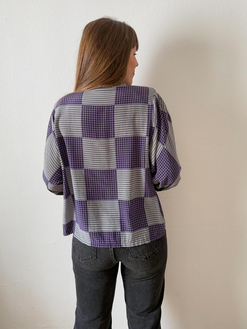 Blusa fluida gasa con estampado pata de gallo en colores morado, negro y blanco. Hombreras y amplias mangas muy favorecedoras.