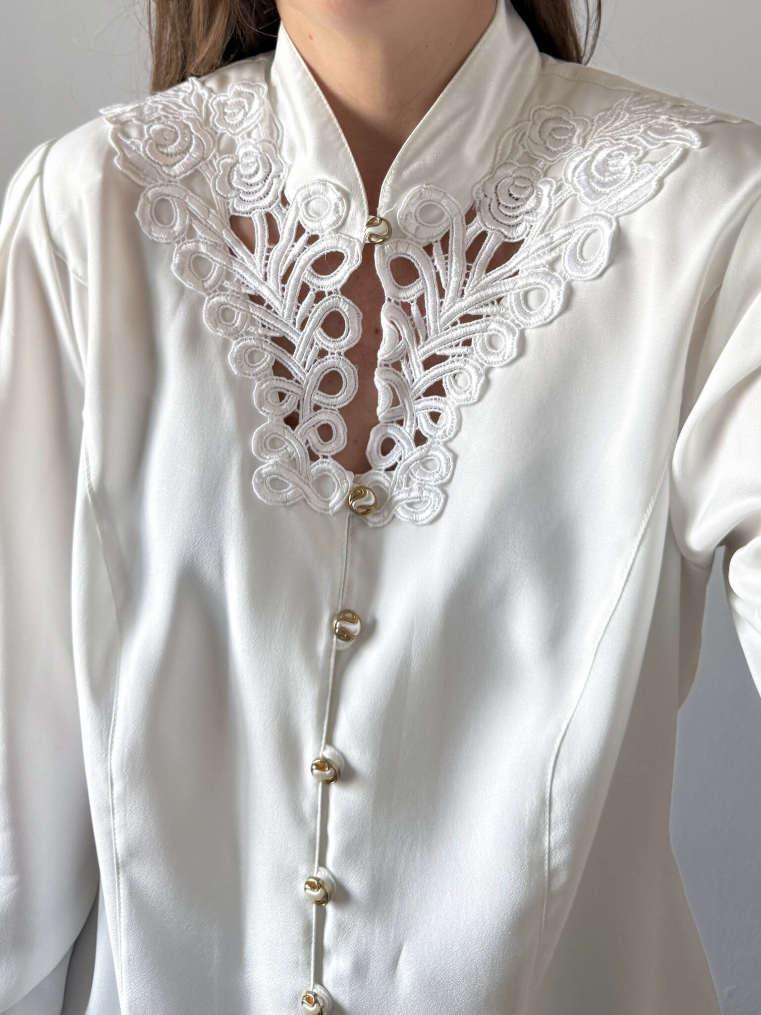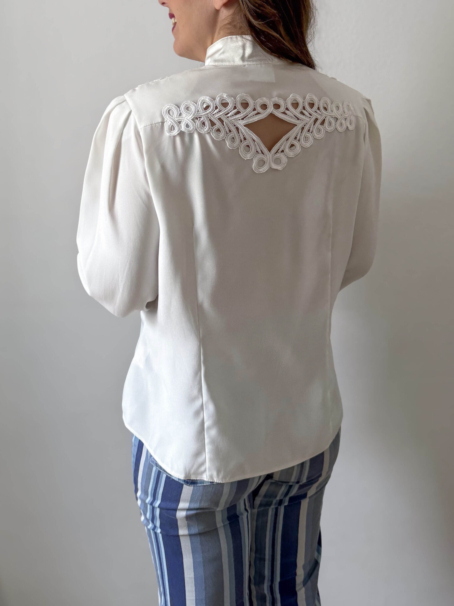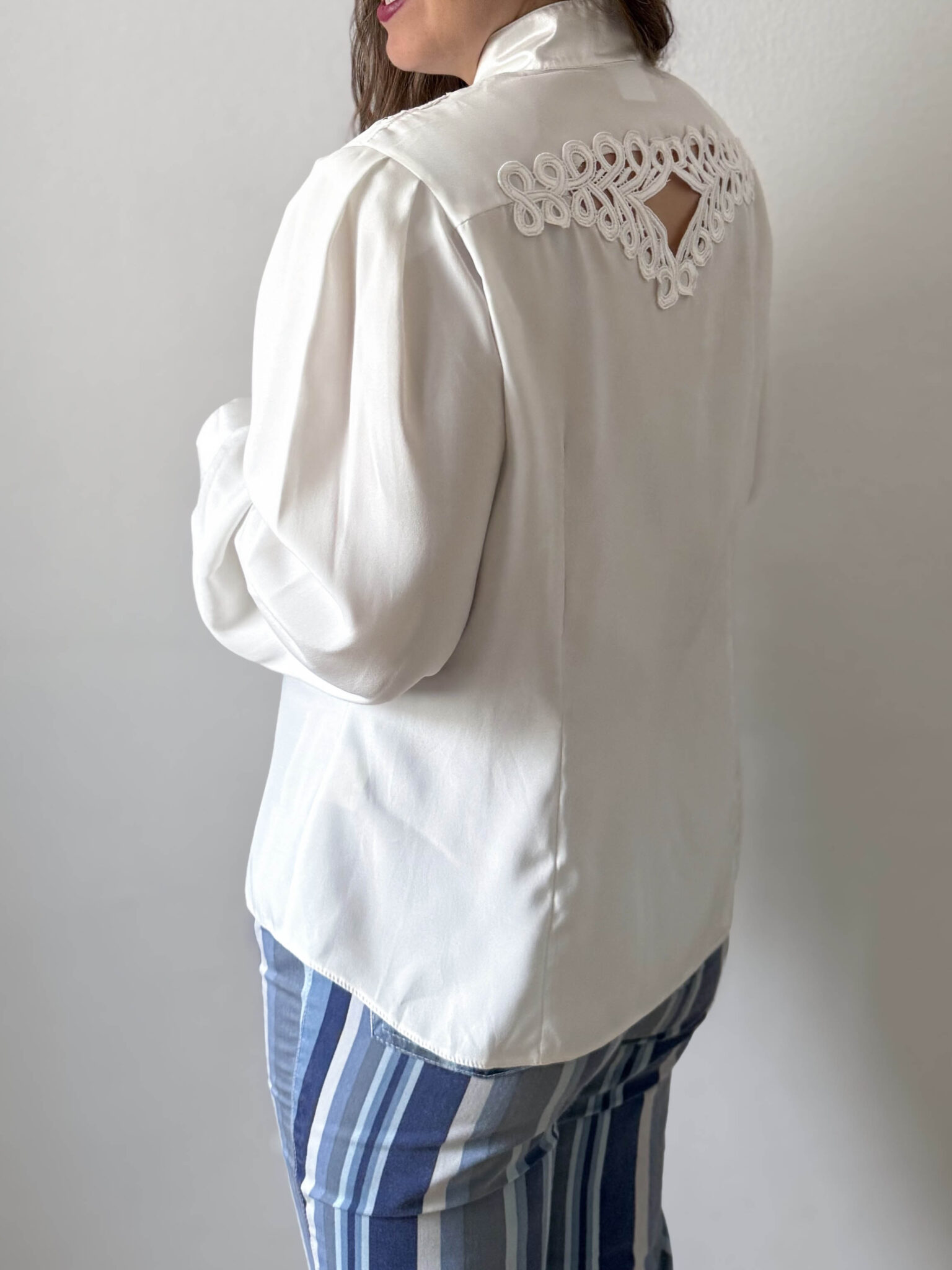 Blusa marfil bordada vintage años 80. Detalle bordado ornamental en escote y espalda de lo más especial. Botones joya y tejido satinado con bonita caída.