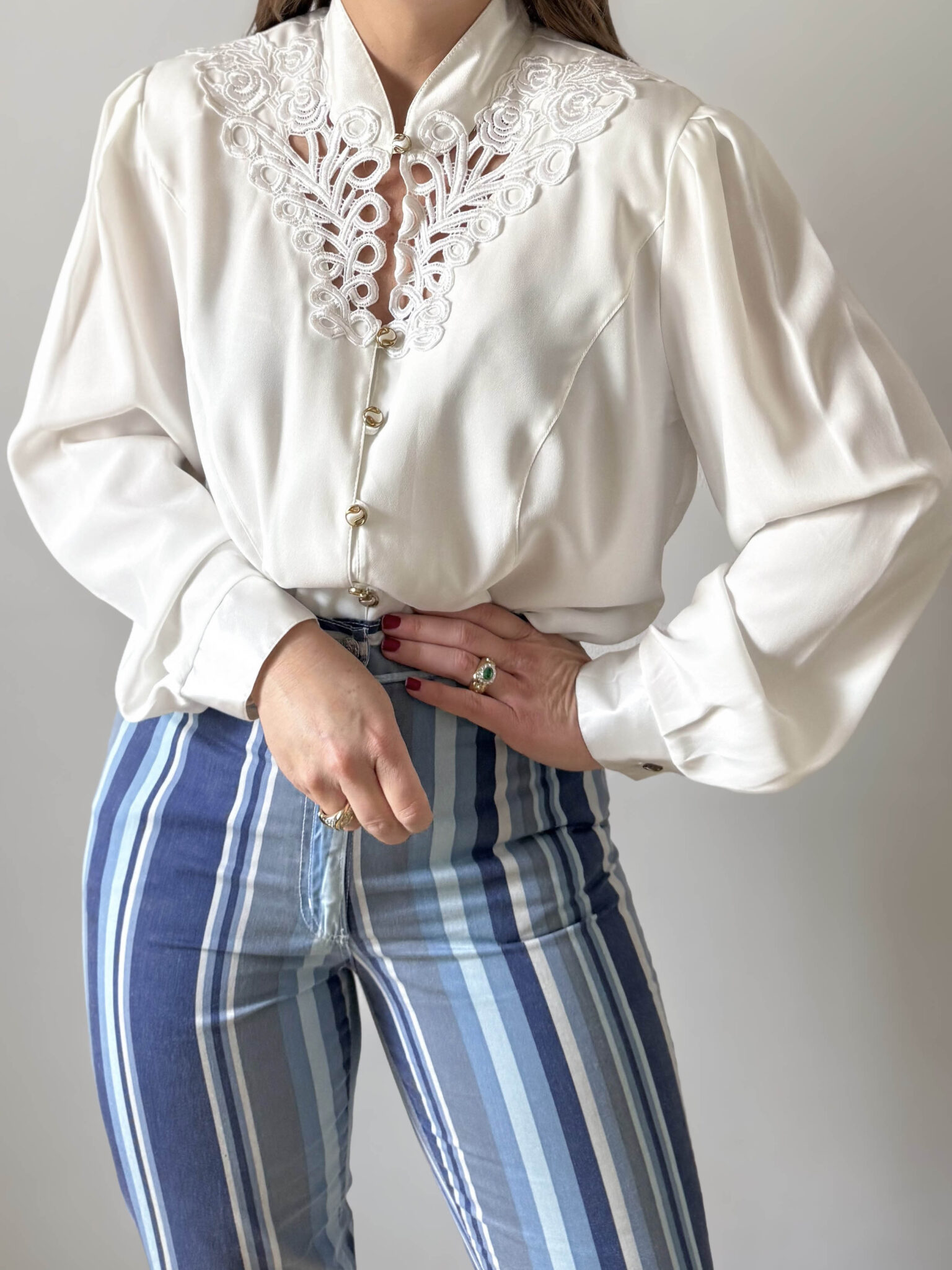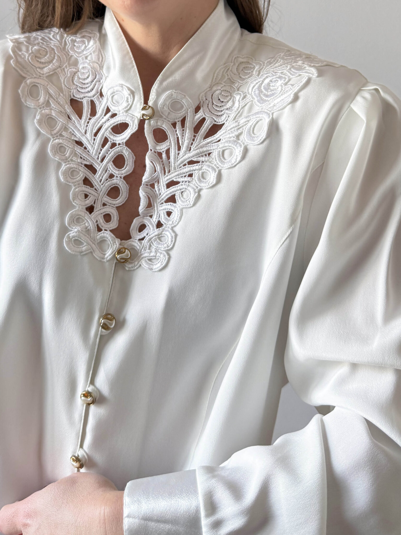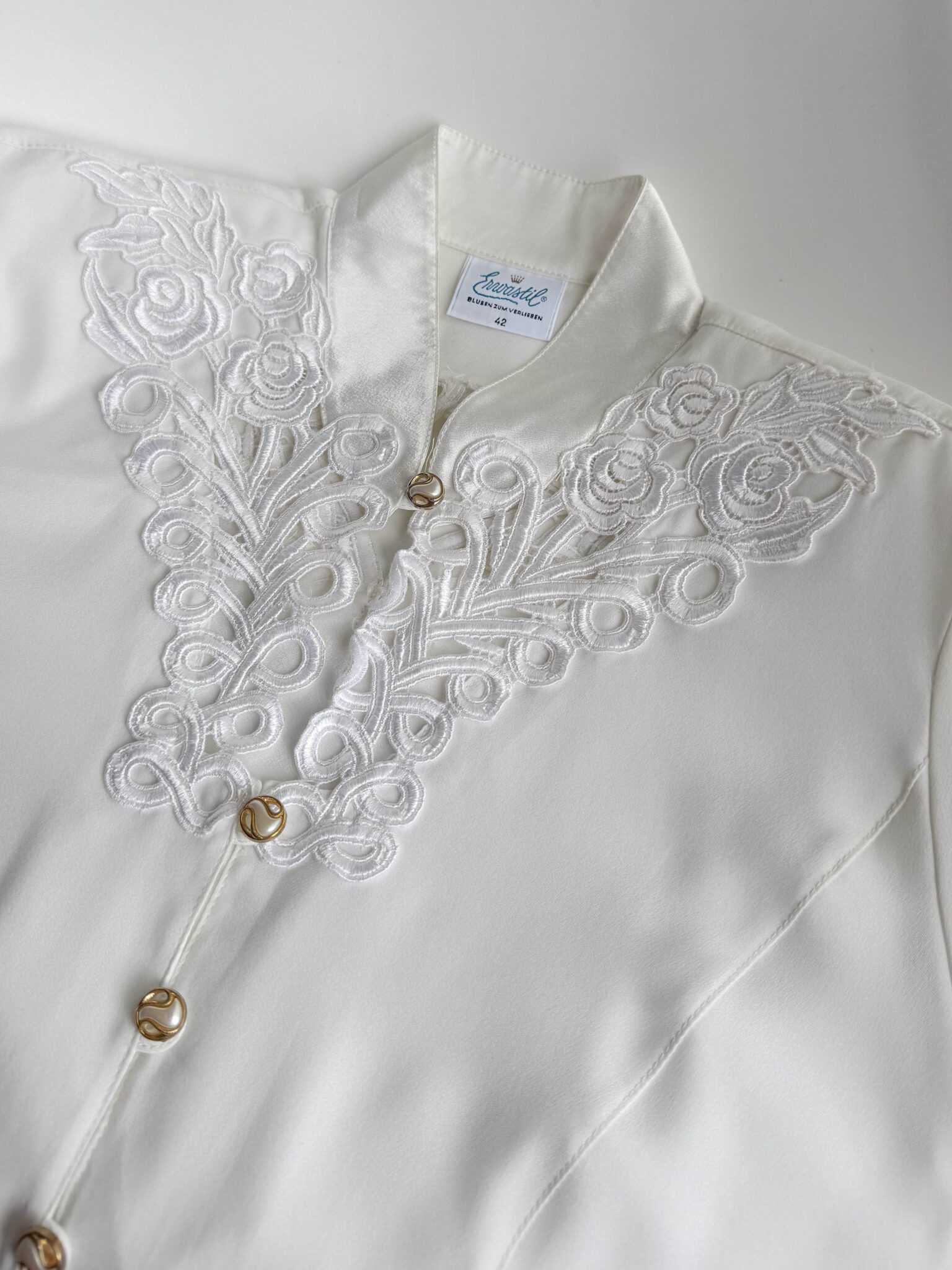 Blusa marfil bordada vintage años 80. Detalle bordado ornamental en escote y espalda de lo más especial. Botones joya y tejido satinado con bonita caída.