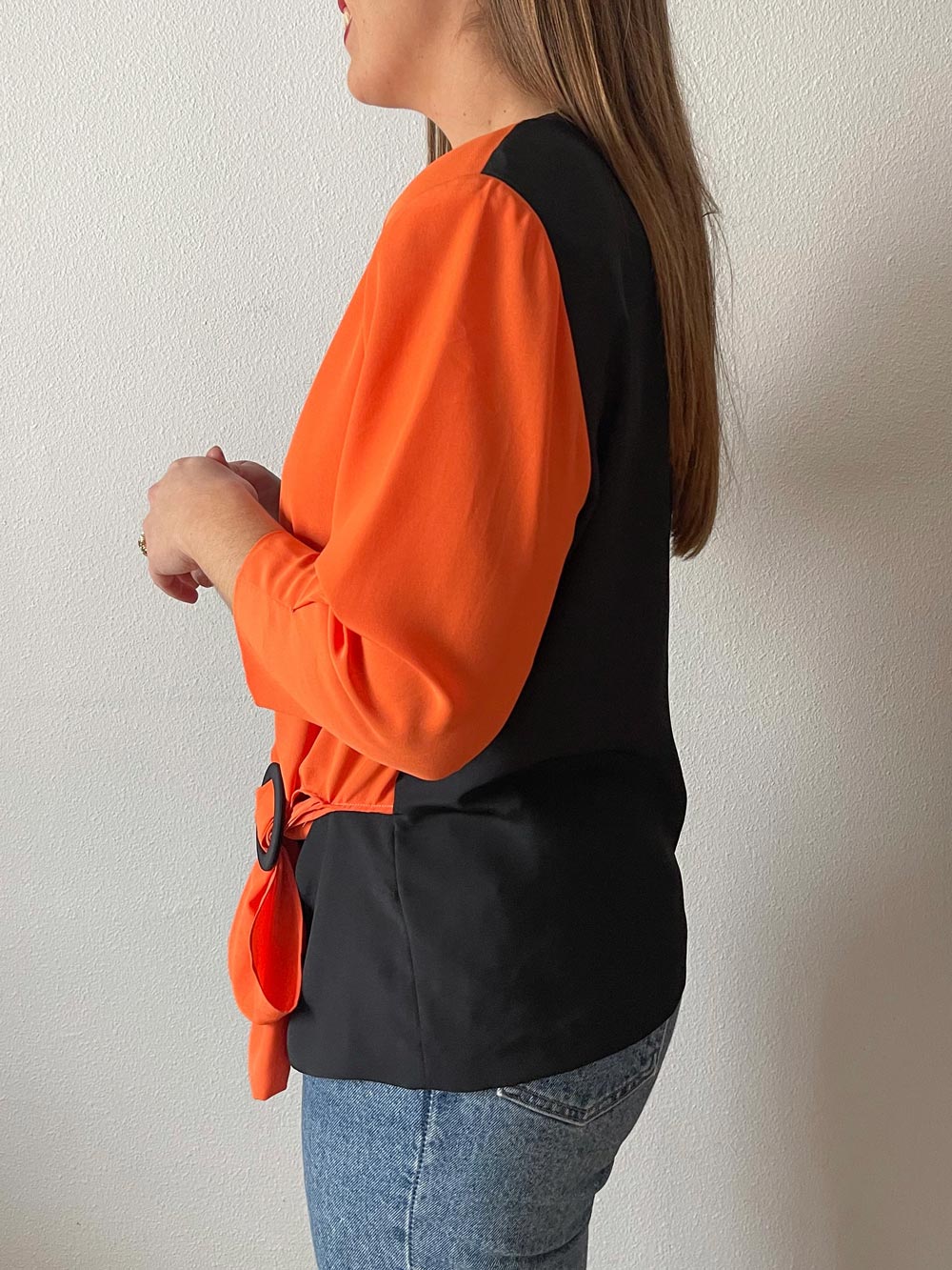 Blusa Pierre Cardin bicolor en tono negro y naranja. Tejido de gran fluidez, hombreras marcadas y lazada inferior a un lado. Muy elegante.