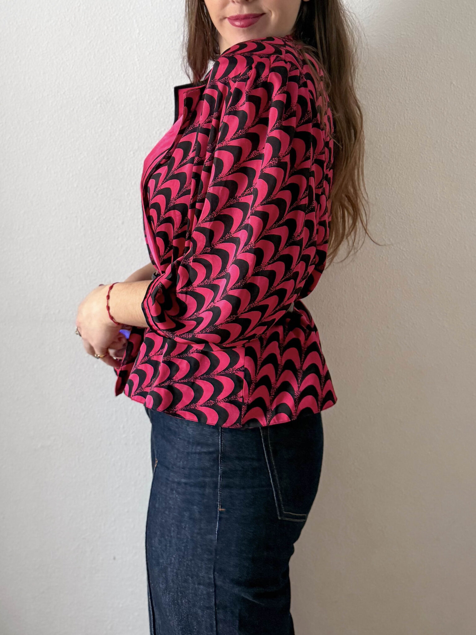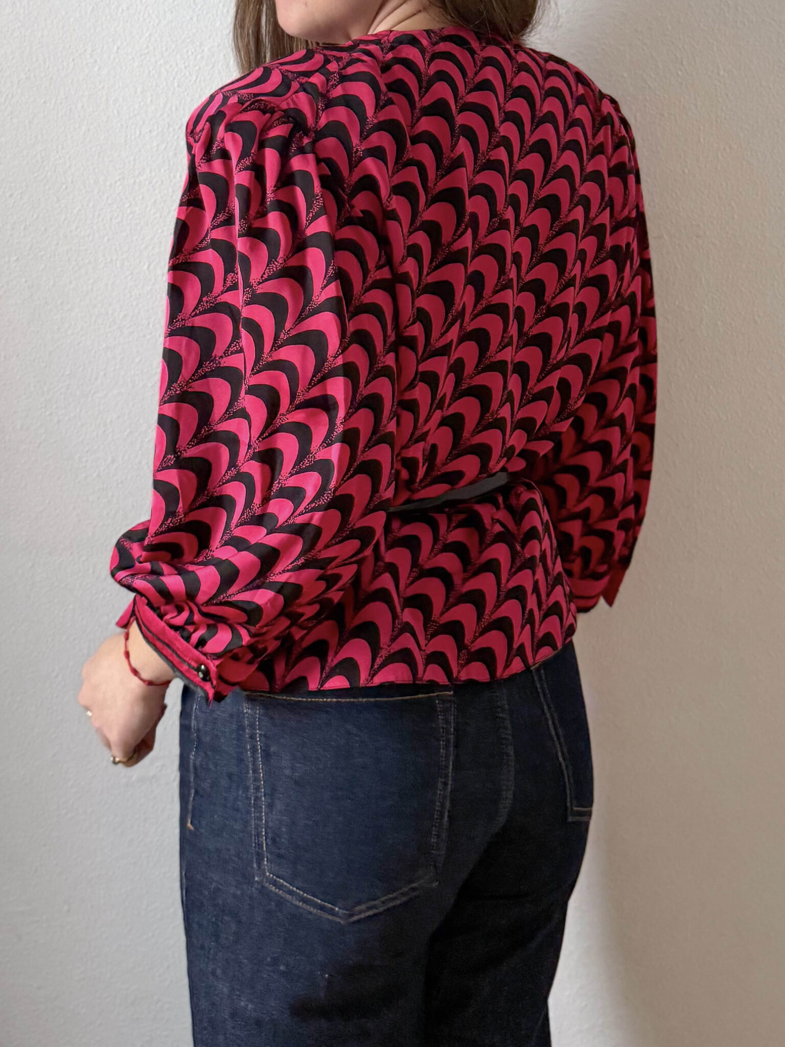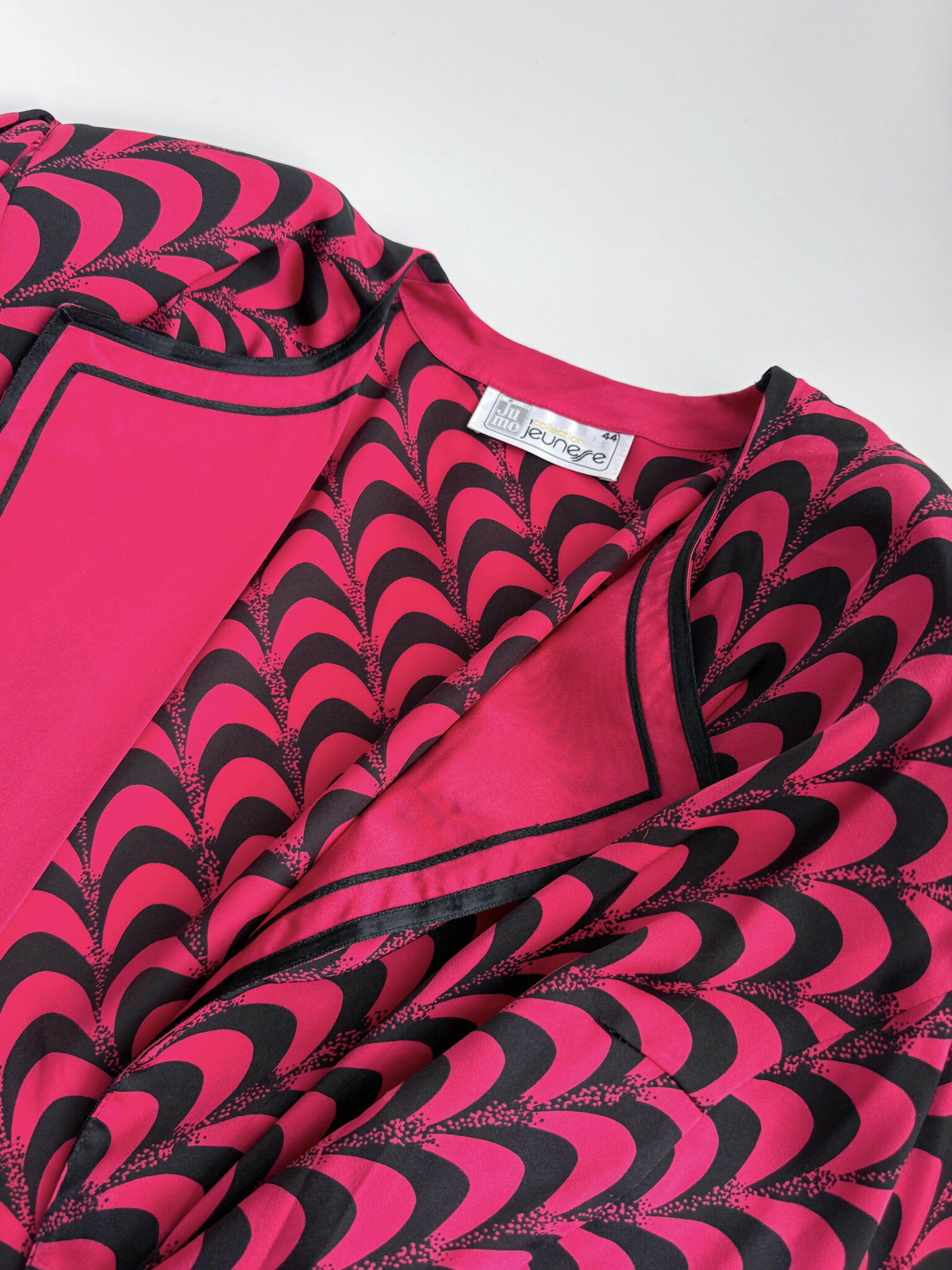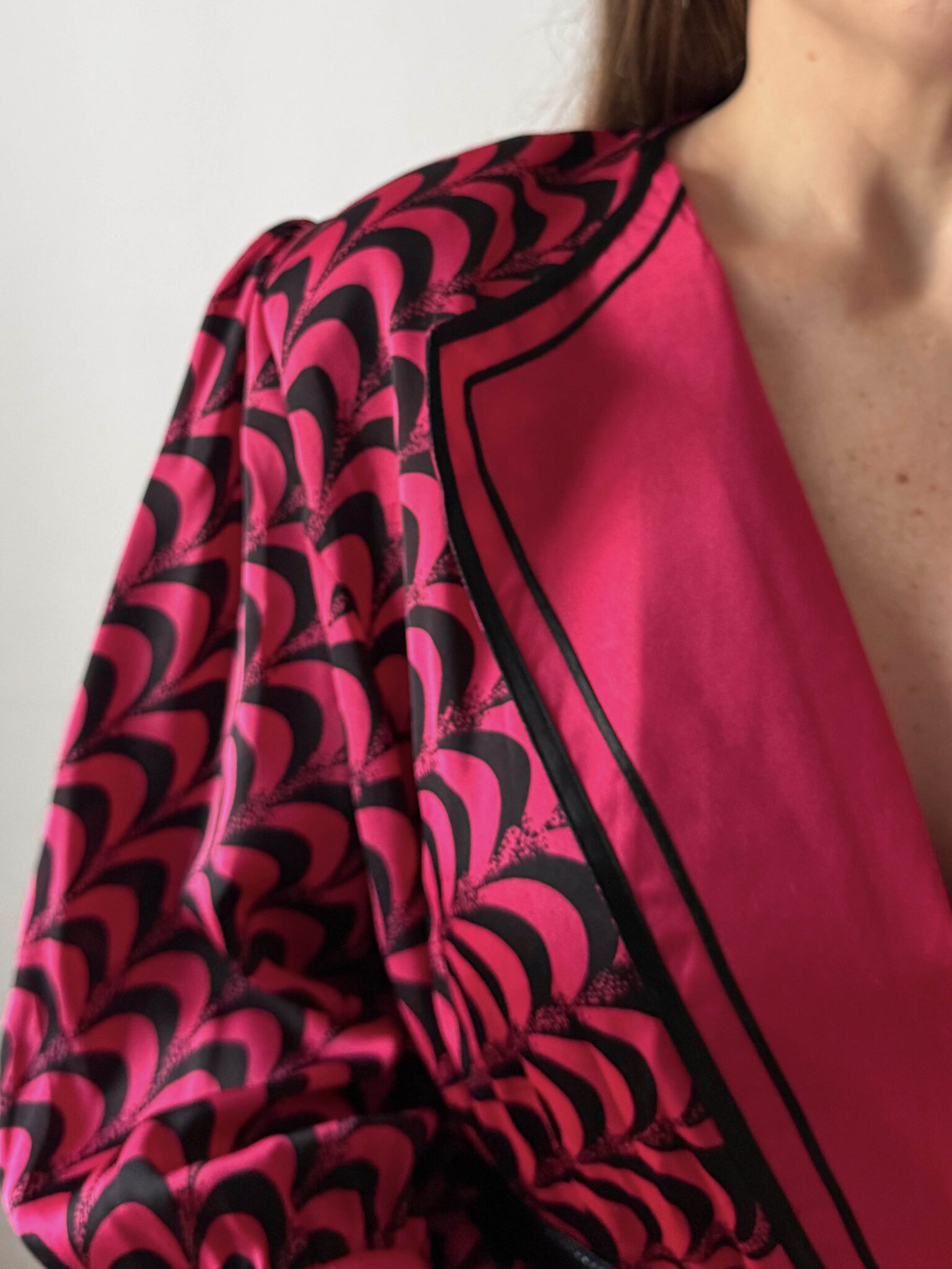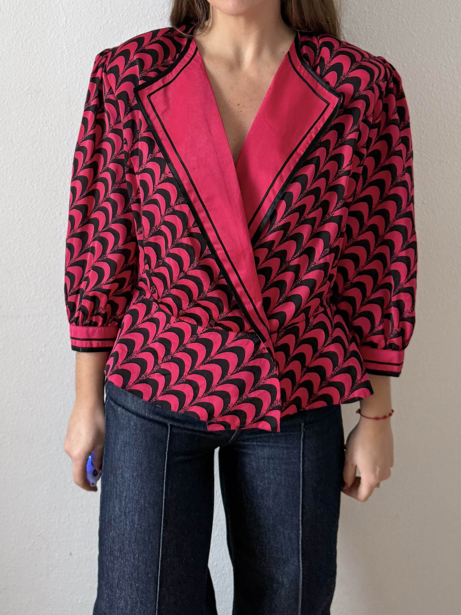 Blusa satinada bicolor en rosa fucsia y negro. Escote en v con solapa, mangas farol y corte en cintura con peplum para entallar con cinturón. Prenda años 80