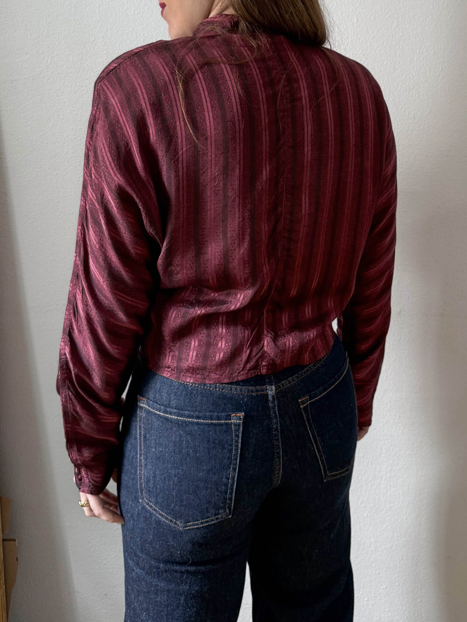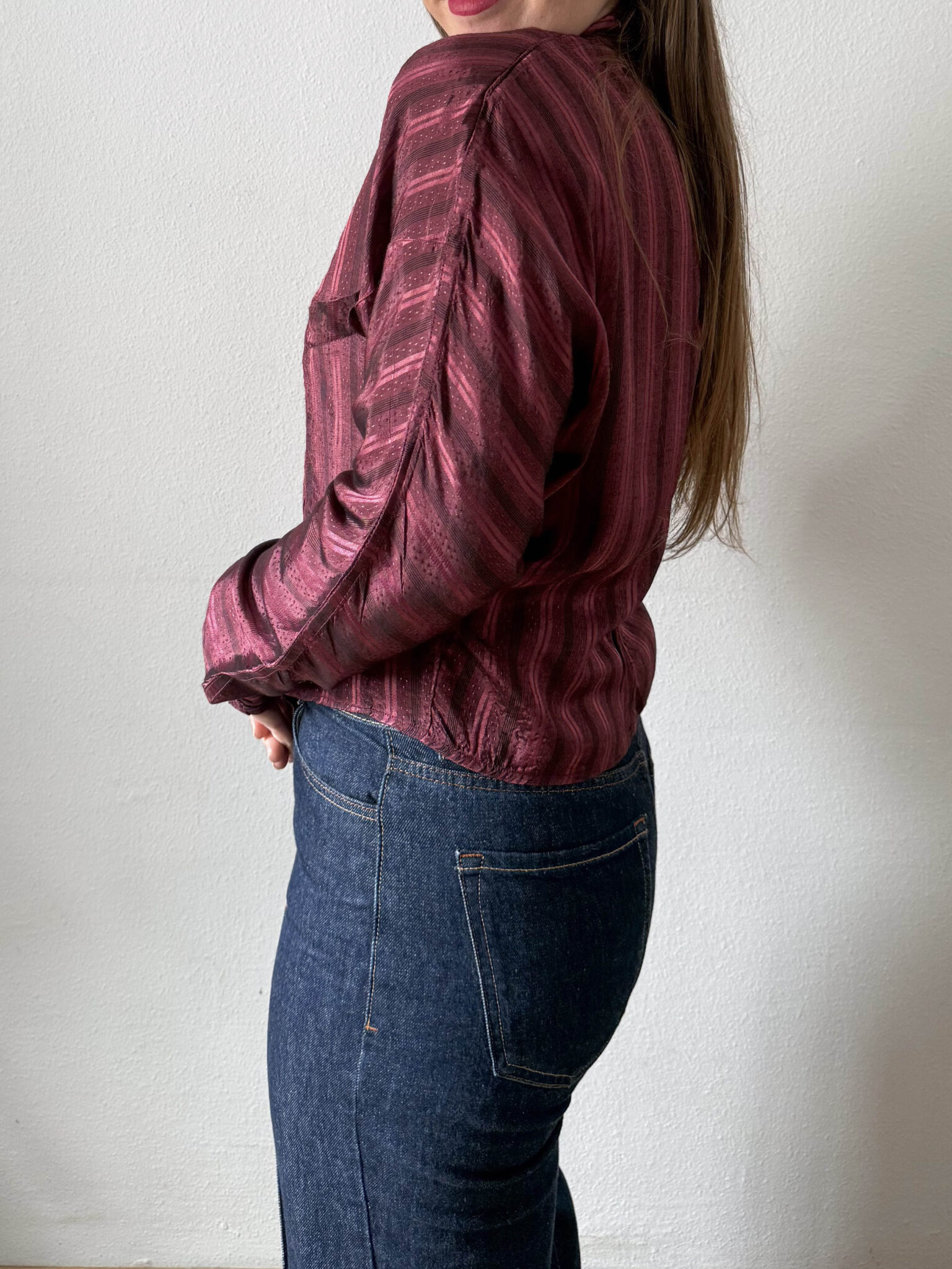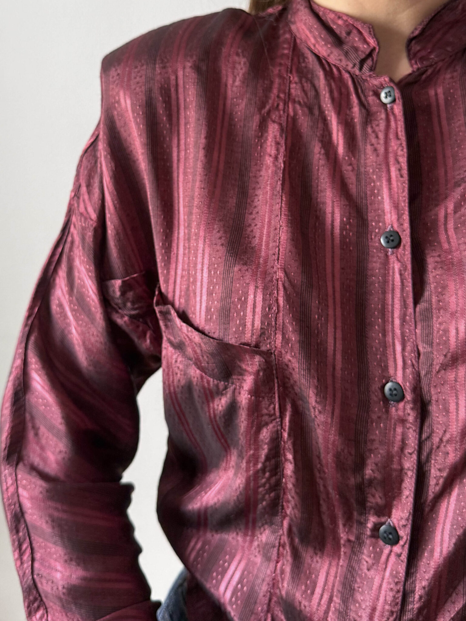 Blusa satinada cuello mao color vino. Hombreras marcadas, tejido a rayas verticales, bolsillo delantero y mangas tipo murciélago entallada en cintura.