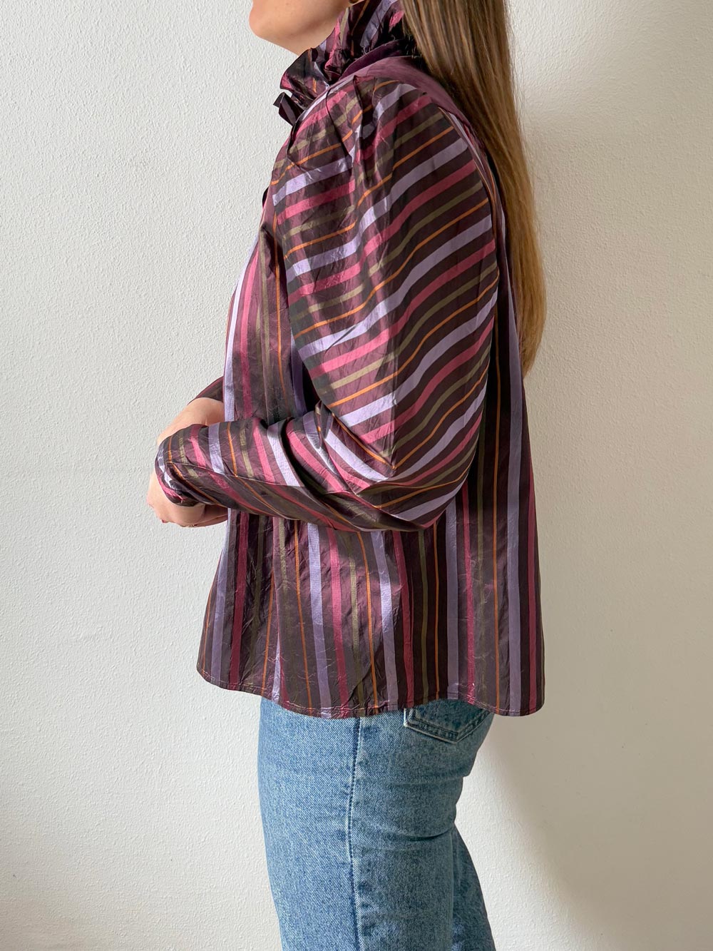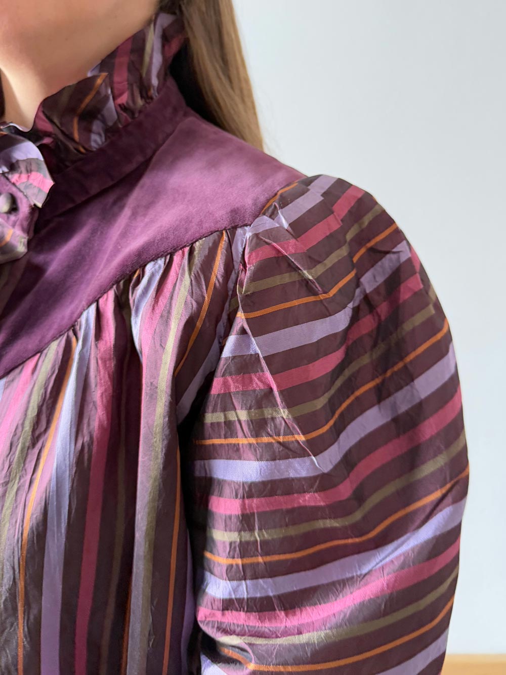 Blusa satinada rayas vintage. Original prenda con detalles en terciopelo en hombros marcados con hombreras de gran volumen. Tejido similar seda salvaje.