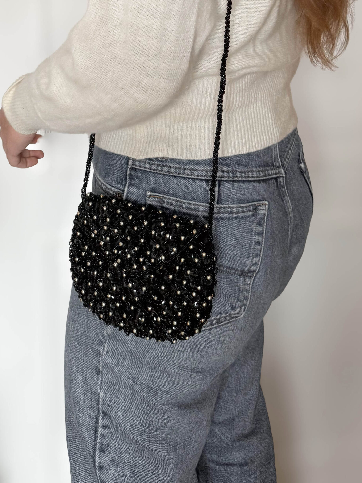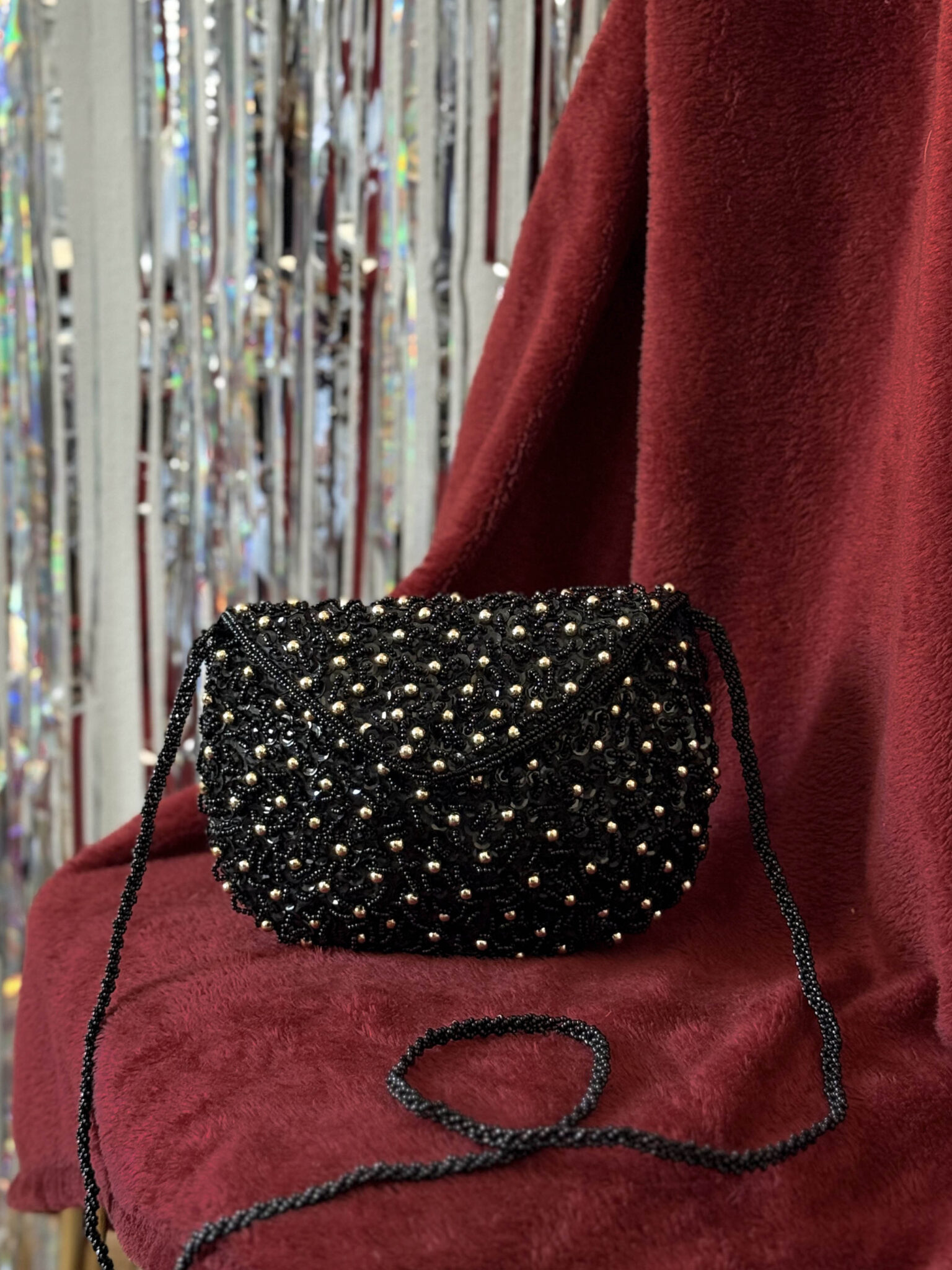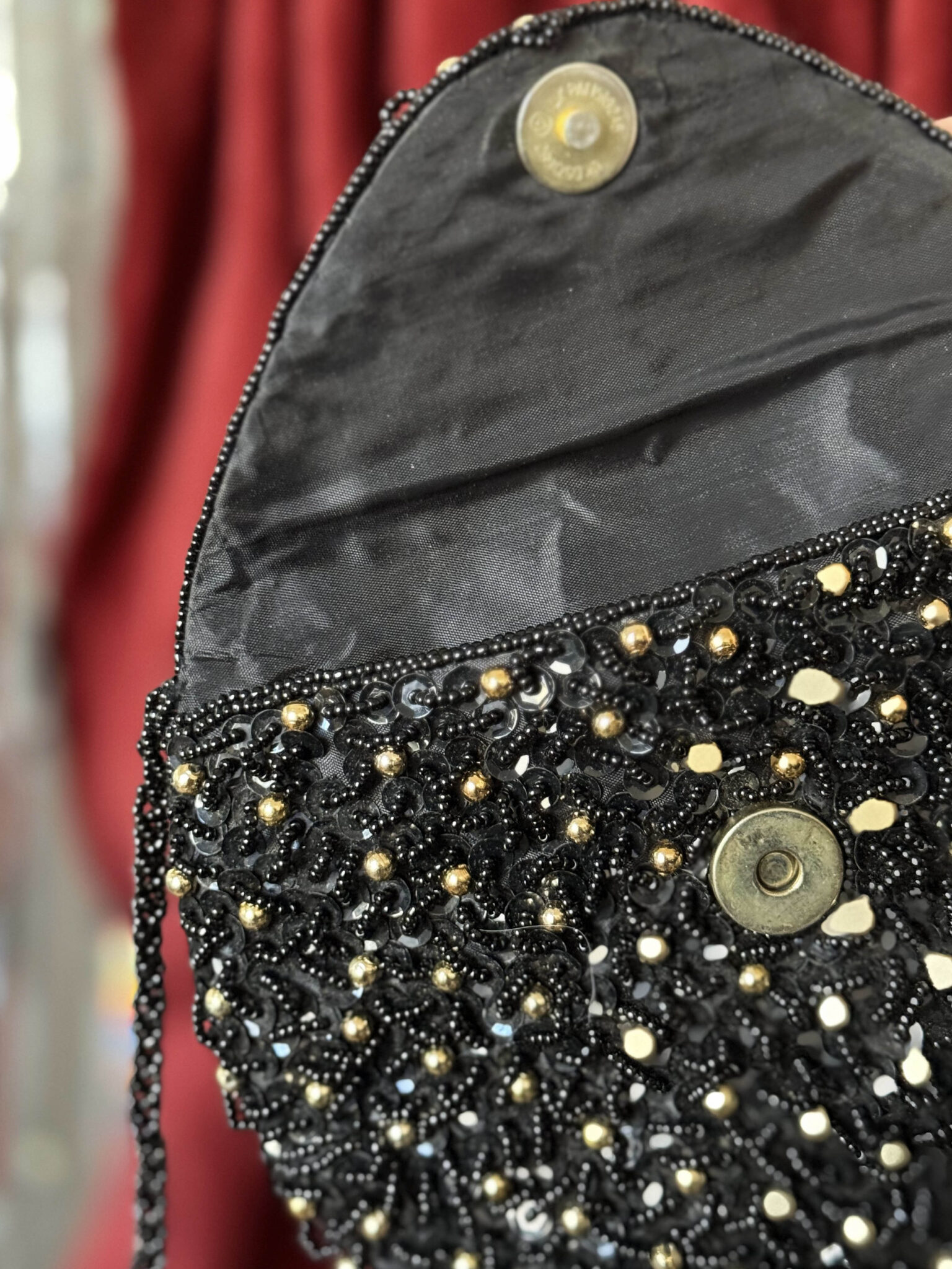 Bolso abalorios vintage. Bolso de fiesta bordado a mano con cuentas negras, bolitas doradas y lentejuelas. Asa para colgar.