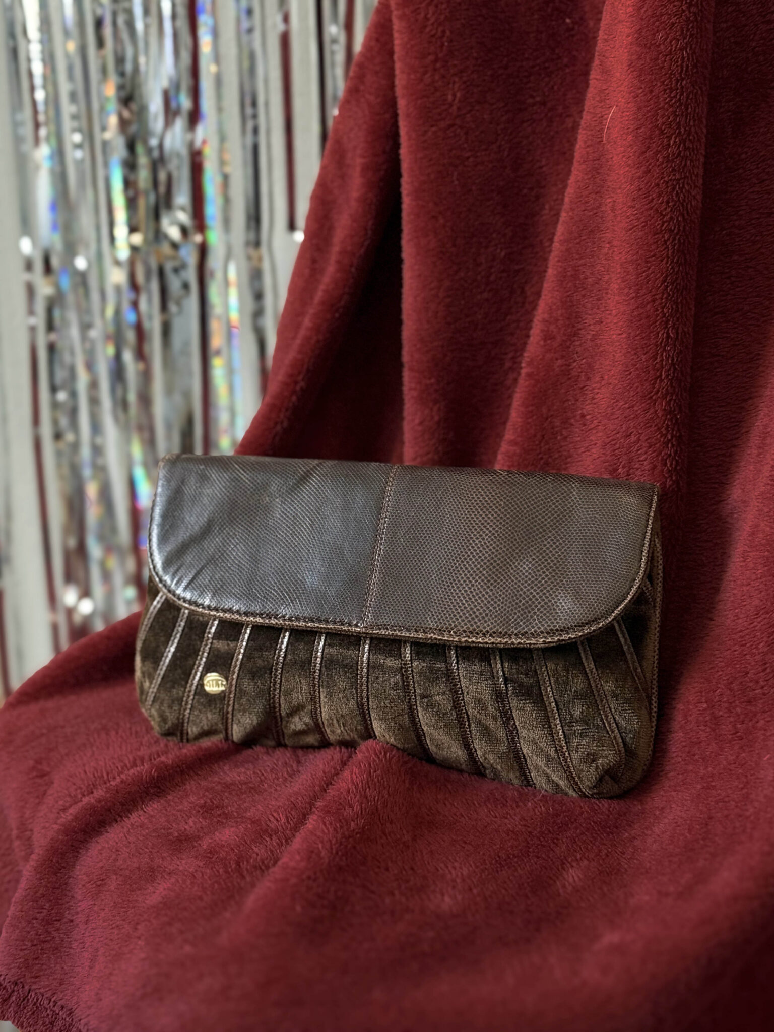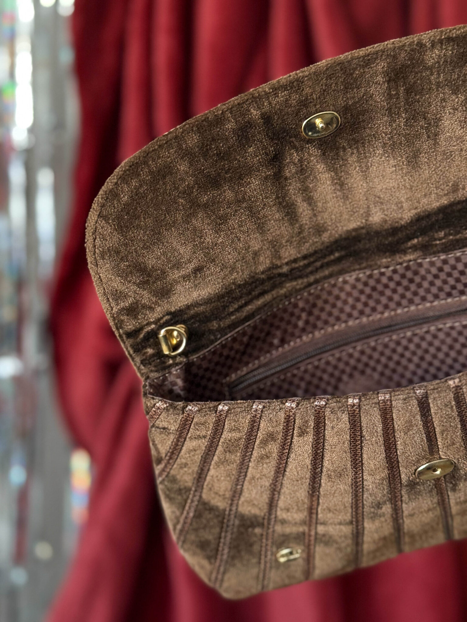 Bolso años 70 en tejido de color marrón. Solapa rígida en tejido de piel y cuerpo en terciopelo acolchado. Lleva trabillas para poner cadena de colgar.
