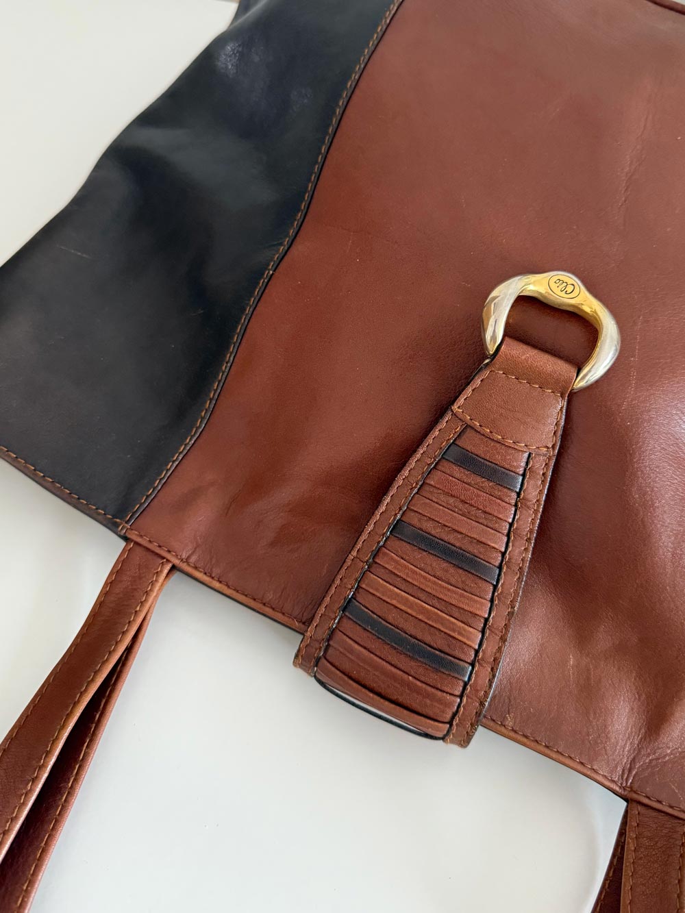 Bolso de piel bicolor camel y marrón chocolate con gran capacidad de almacenaje. Detalle en asa central de cierre con hebilla dorada. Asas para llevar al hombro