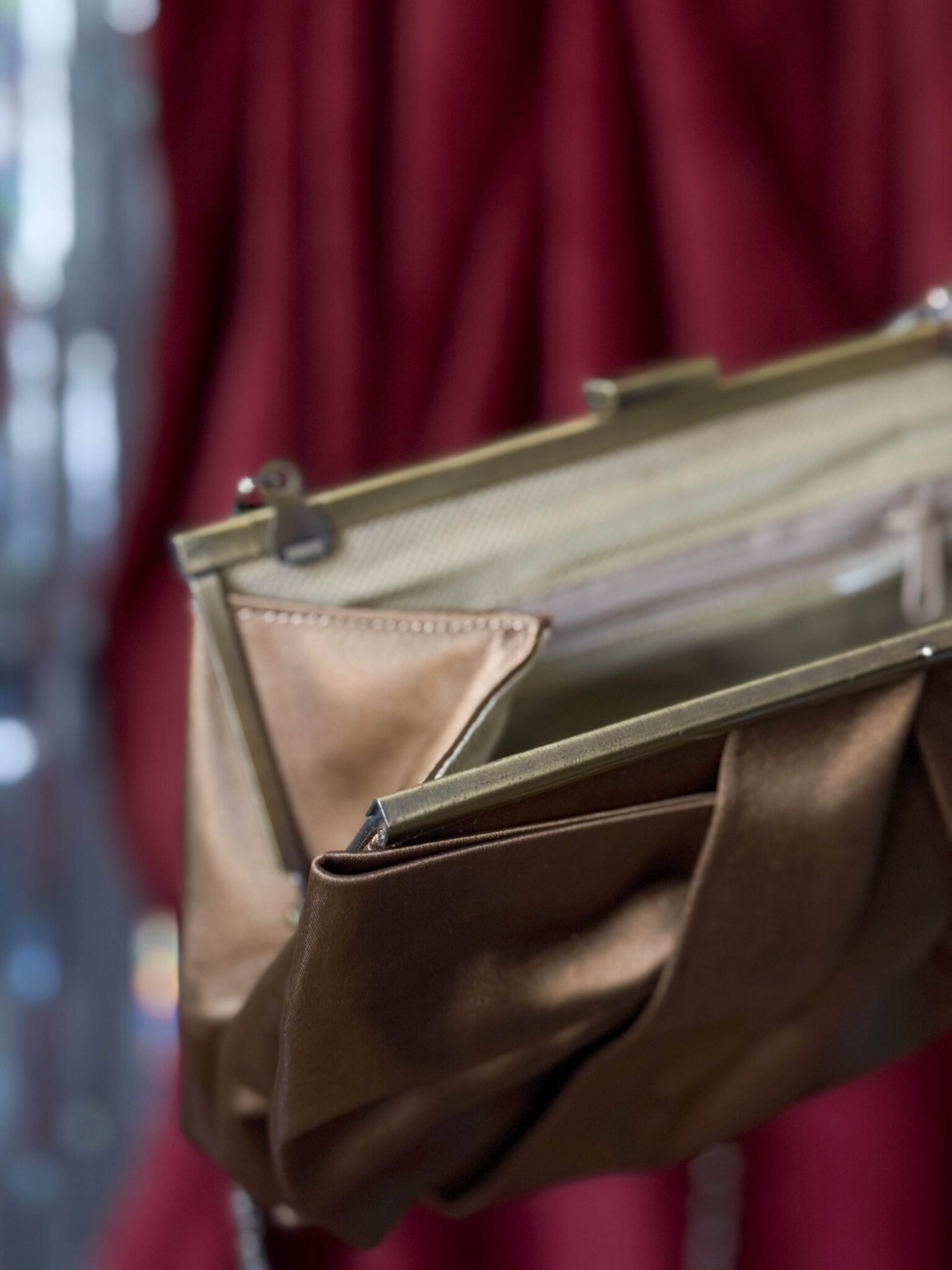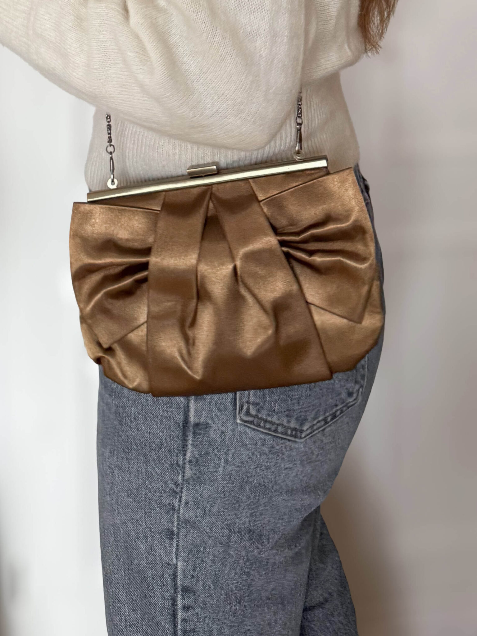 Bolso fiesta bronce. Bolso para eventos con tejido satinado plisado, cierre metálico y asa para colgar. En perfecto estado.