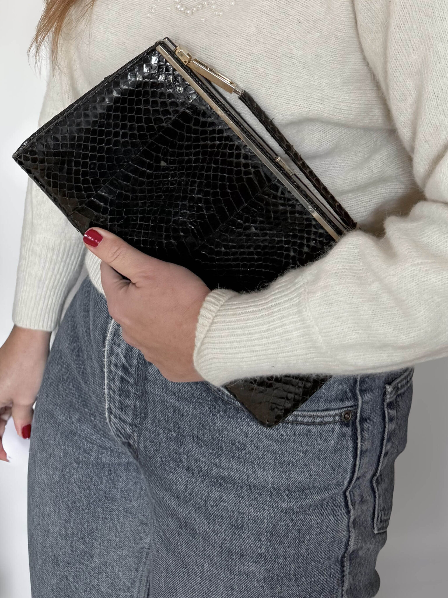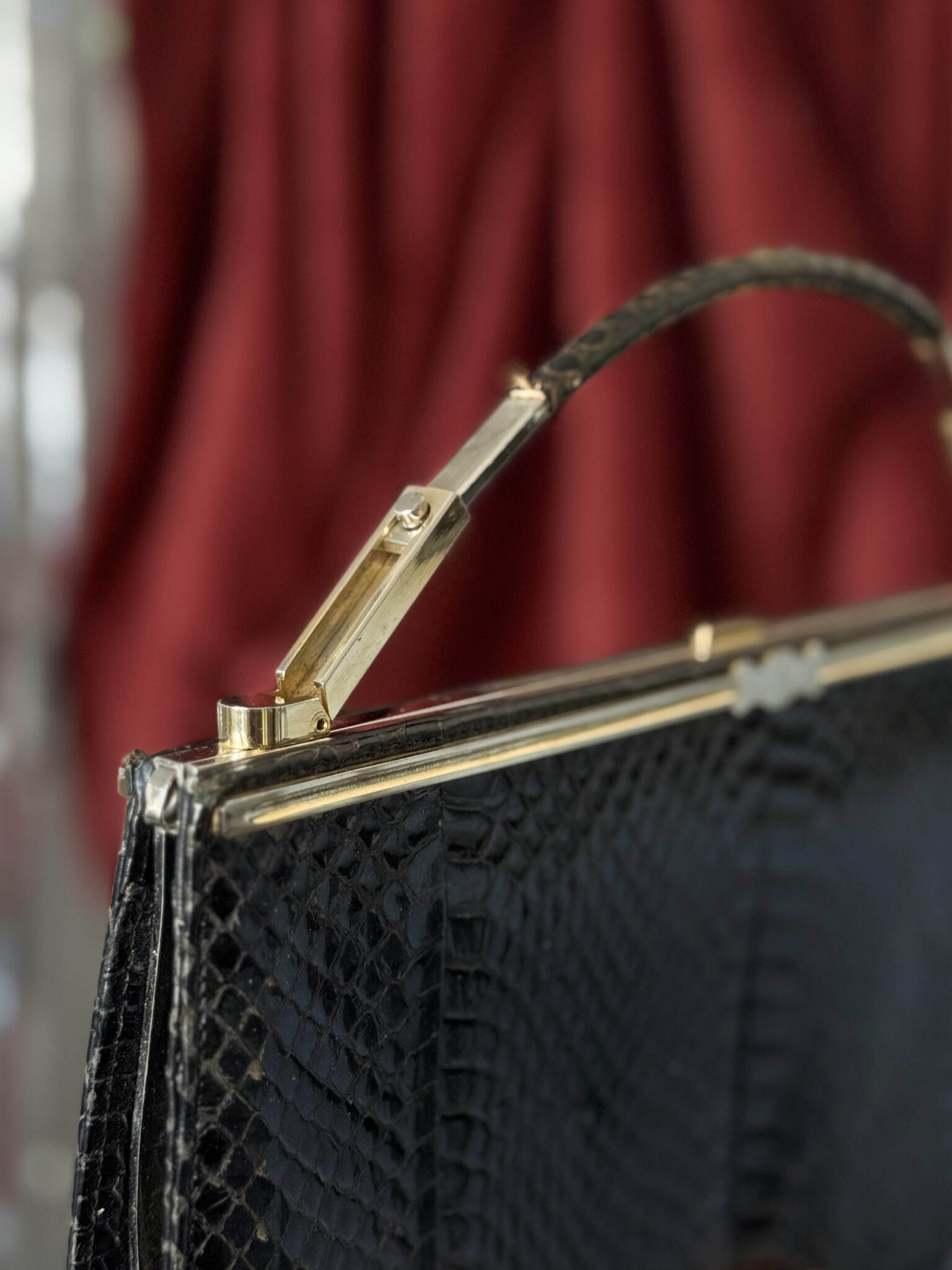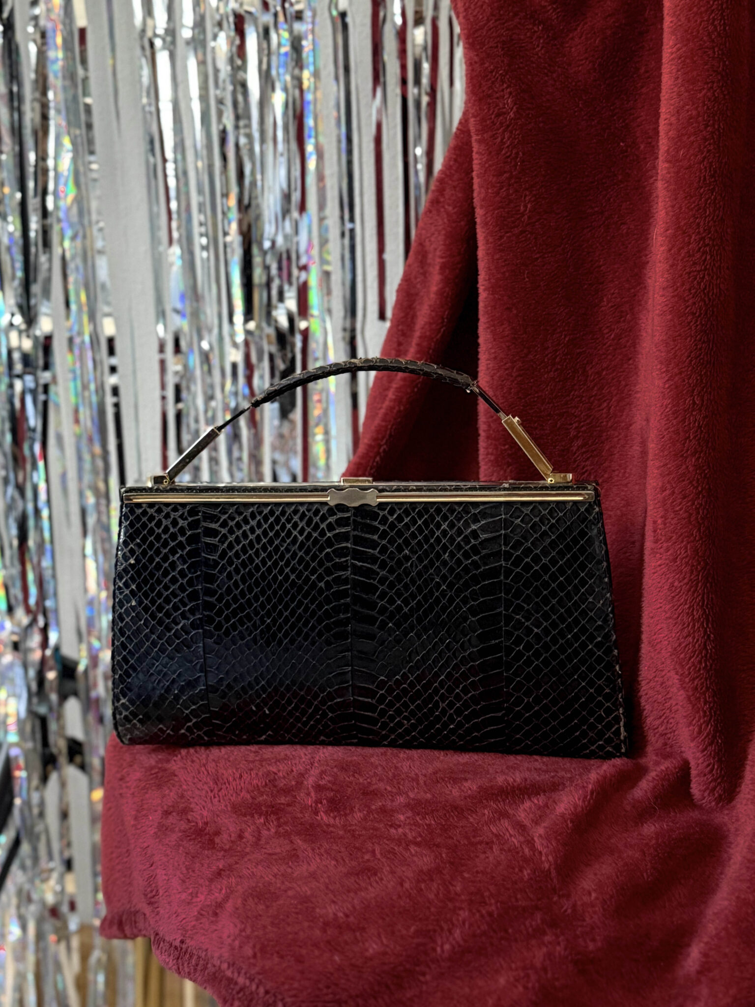 Bolso piel años 50 en color negro. una auténtica joya con estructura rígida, cierre metálico y espejo abatible incorporado. Piel de pitón auténtica.
