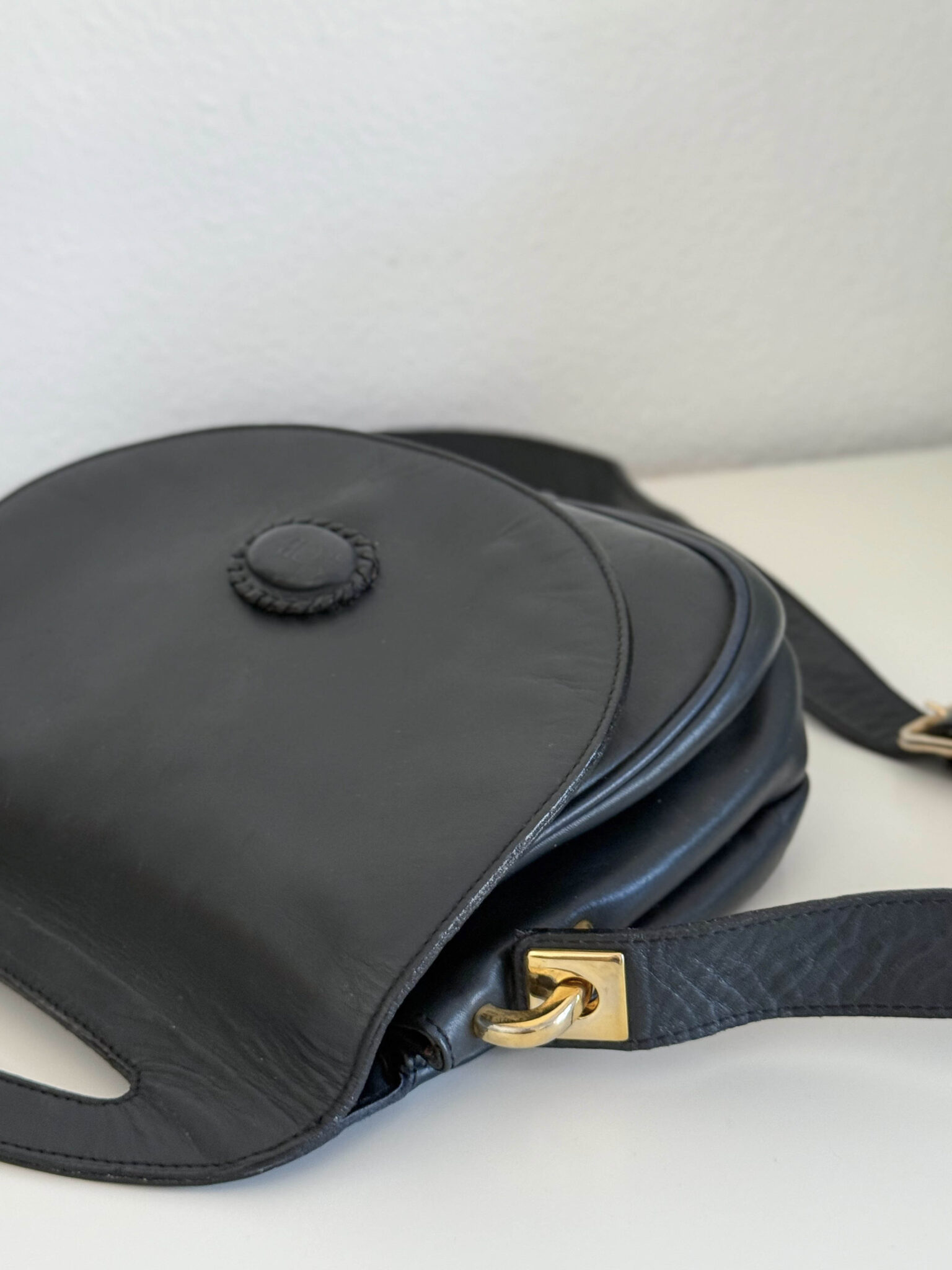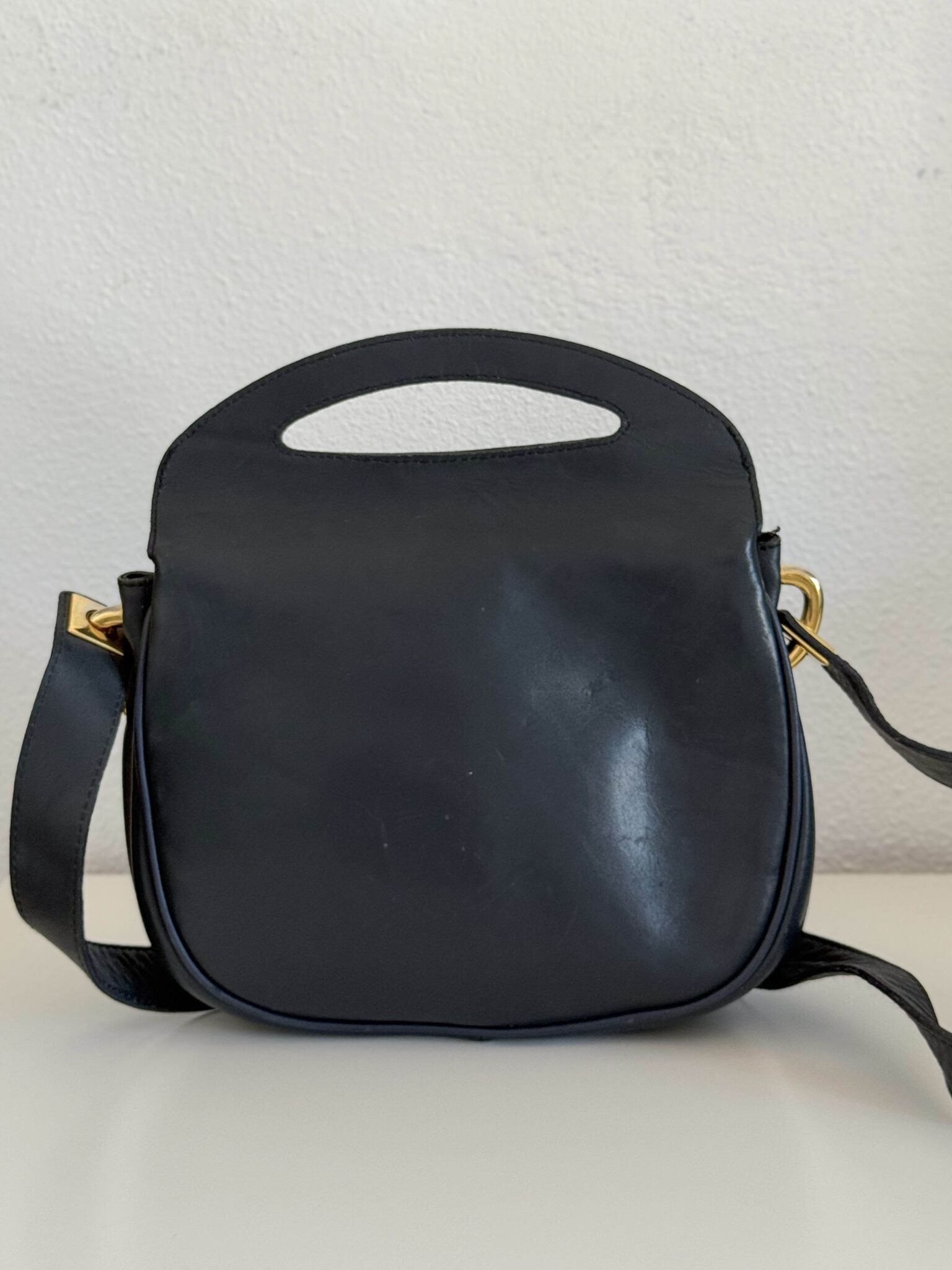 Bolso piel azul marino de gran calidad. Varios compartimentos, detalle de asa pequeña y enganches en color dorado. Se puede llevar cruzado.