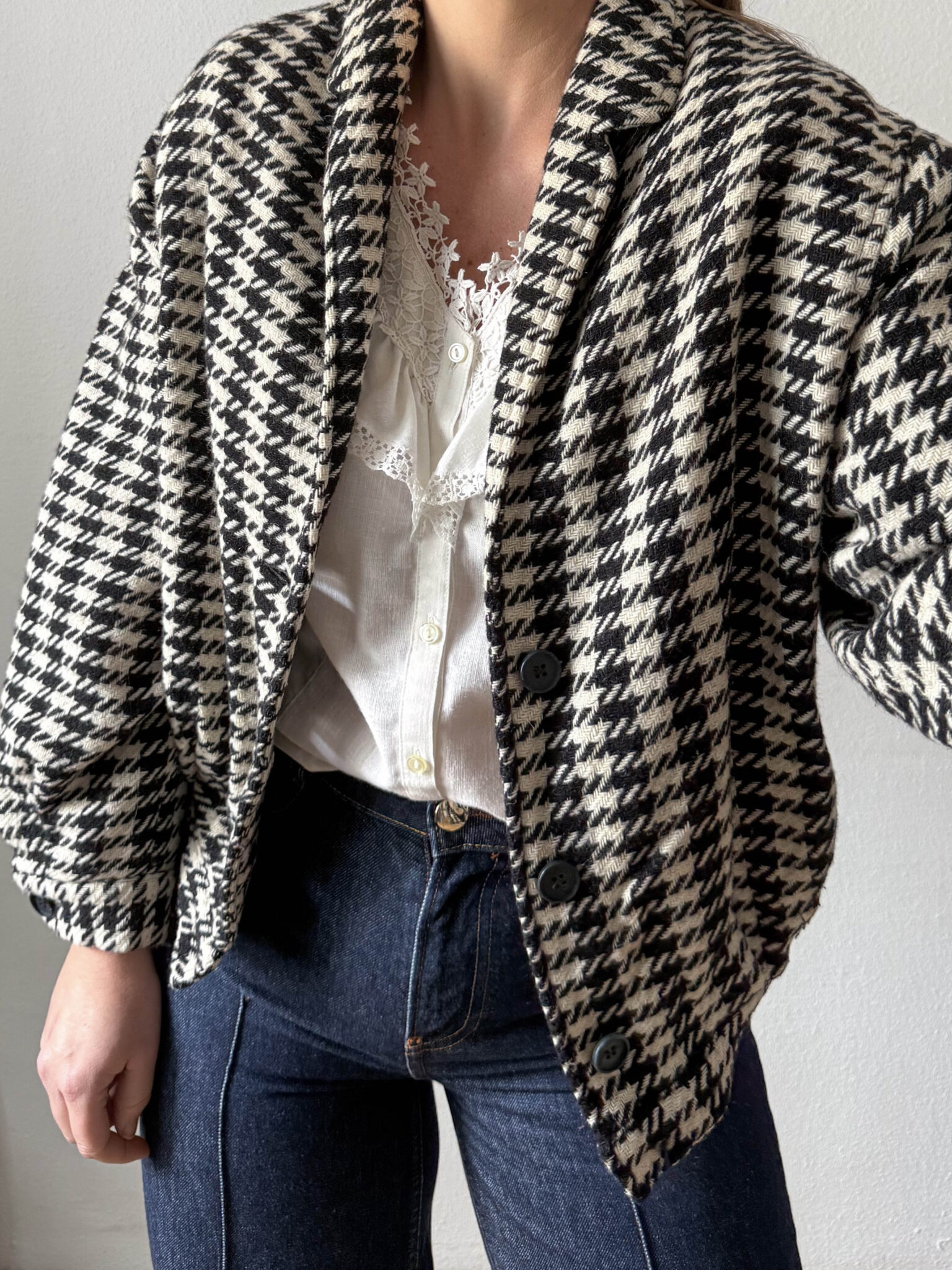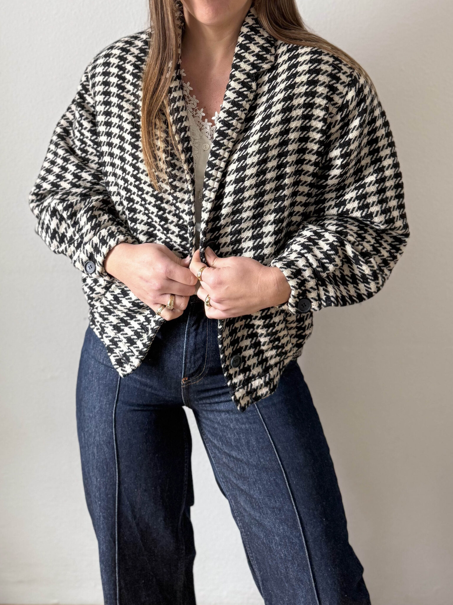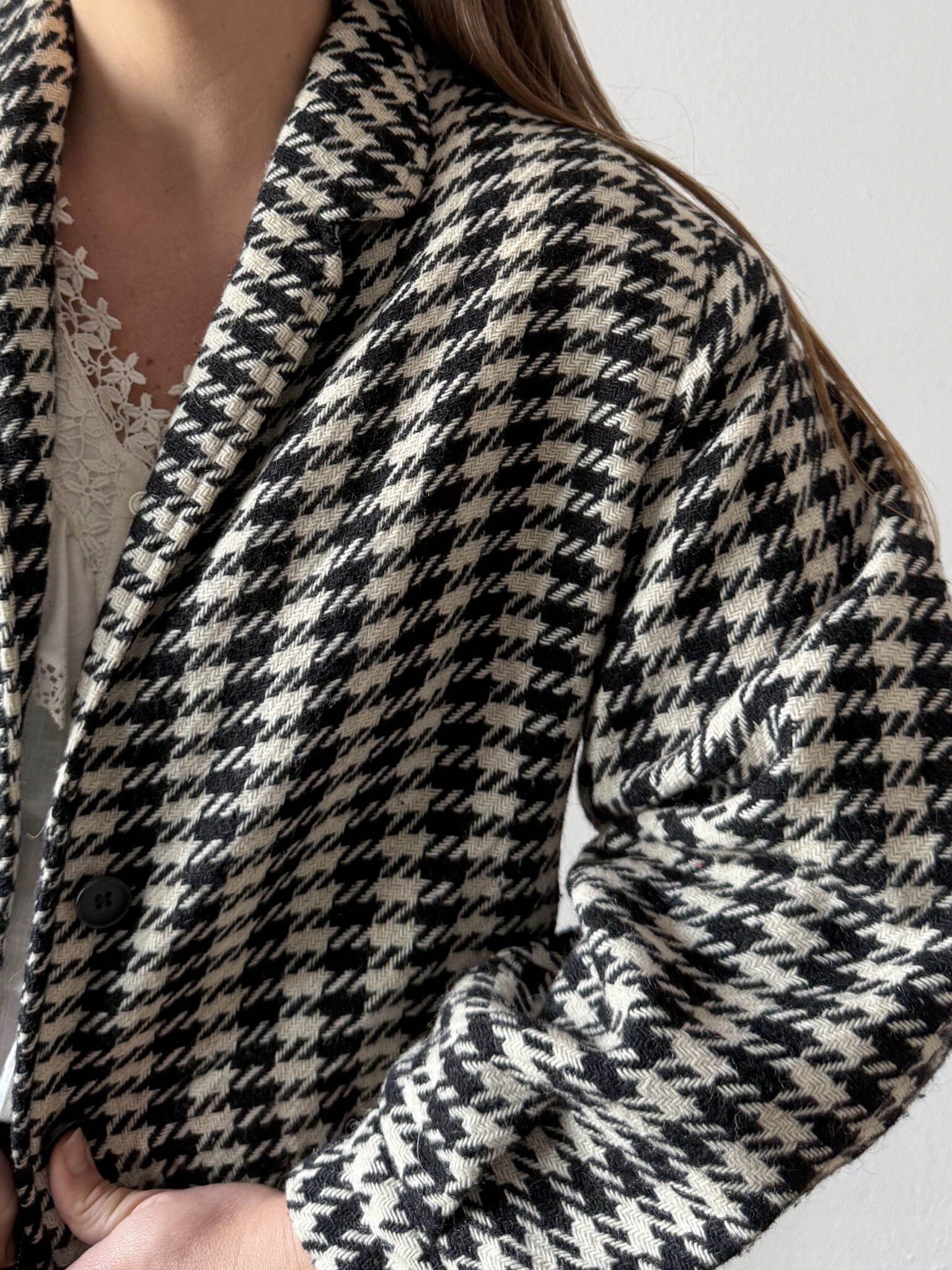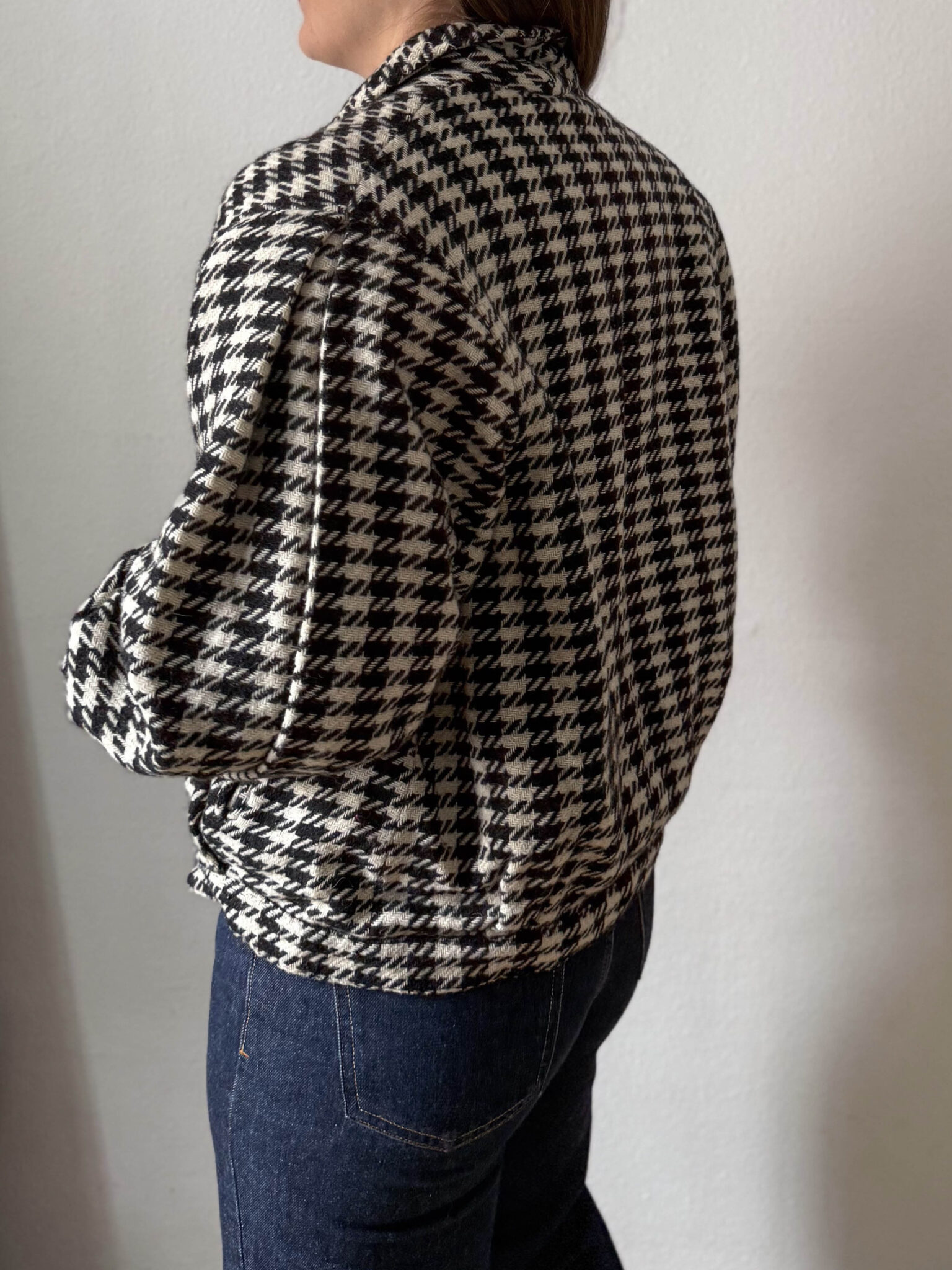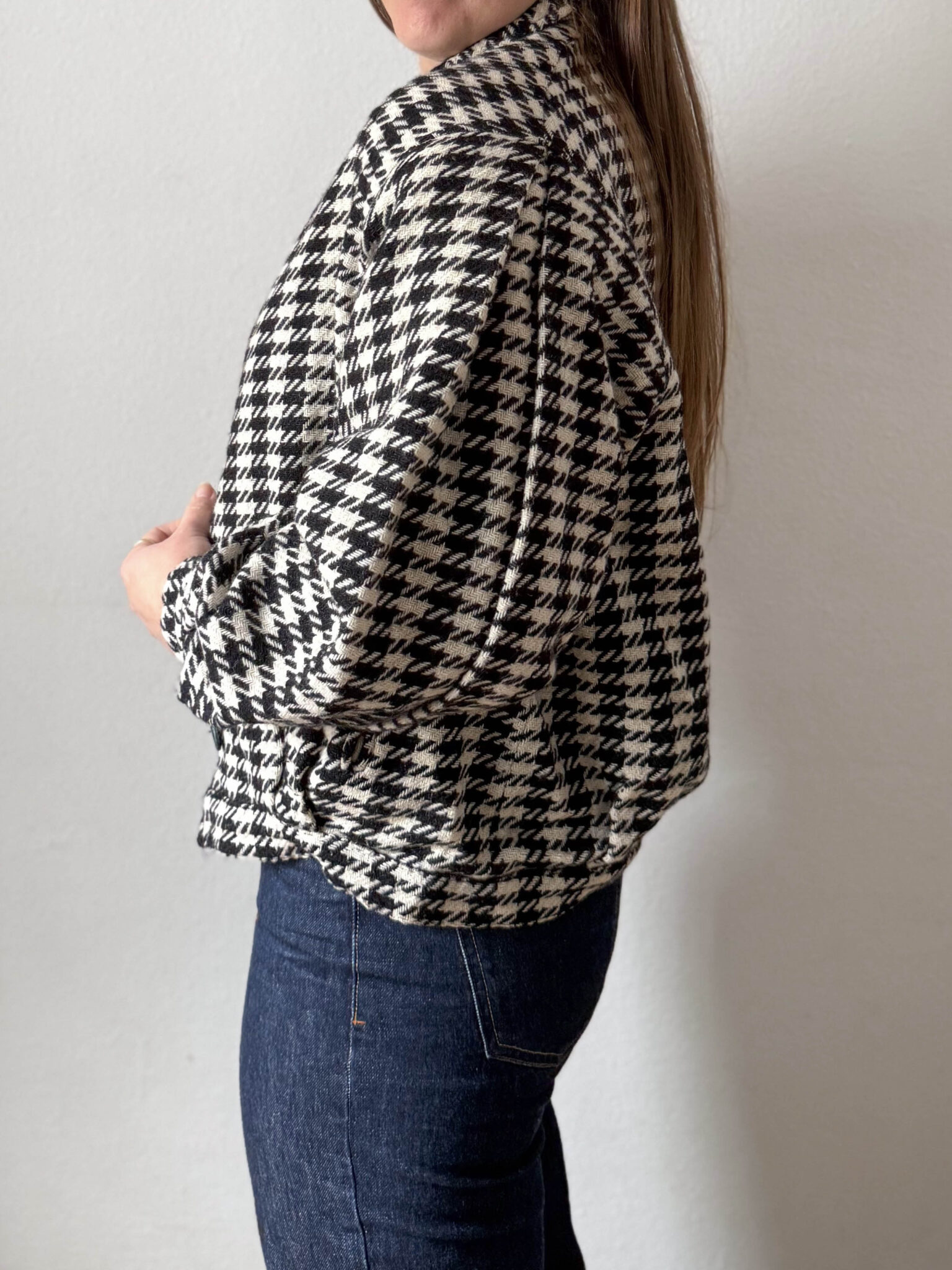 Bomber pata de gallo fabricada en Italia. Tejido de punto tipo bomber con hombreras y corte oversize con amplias mangas. Tiene mucho estilo.