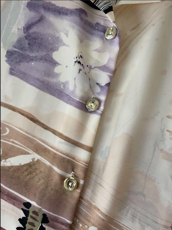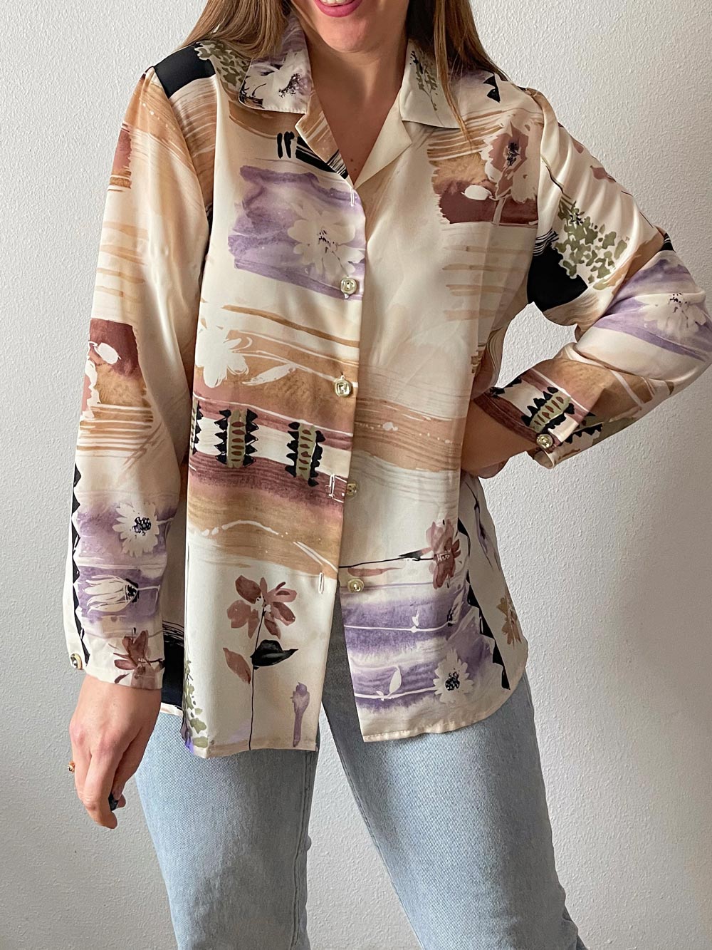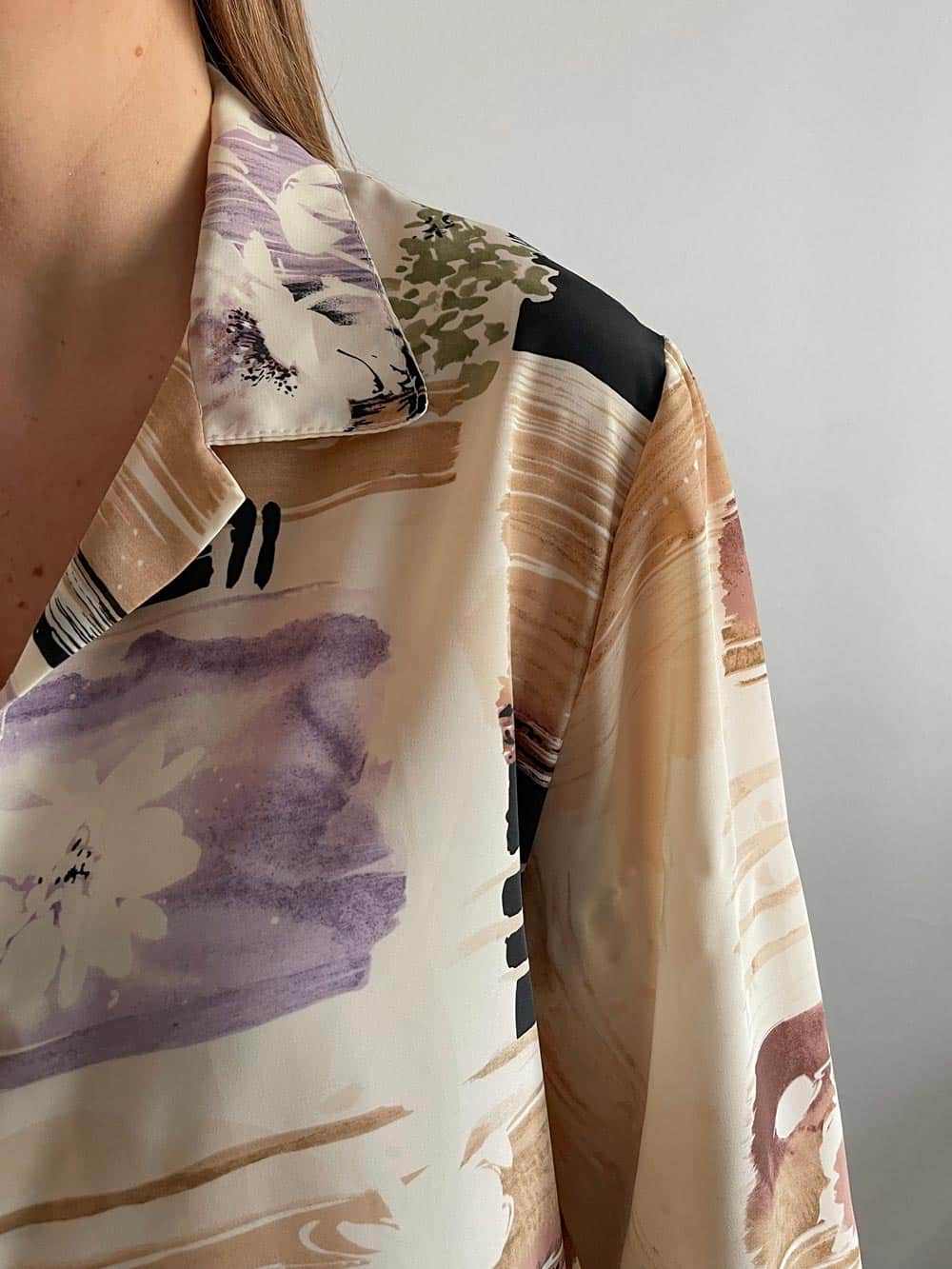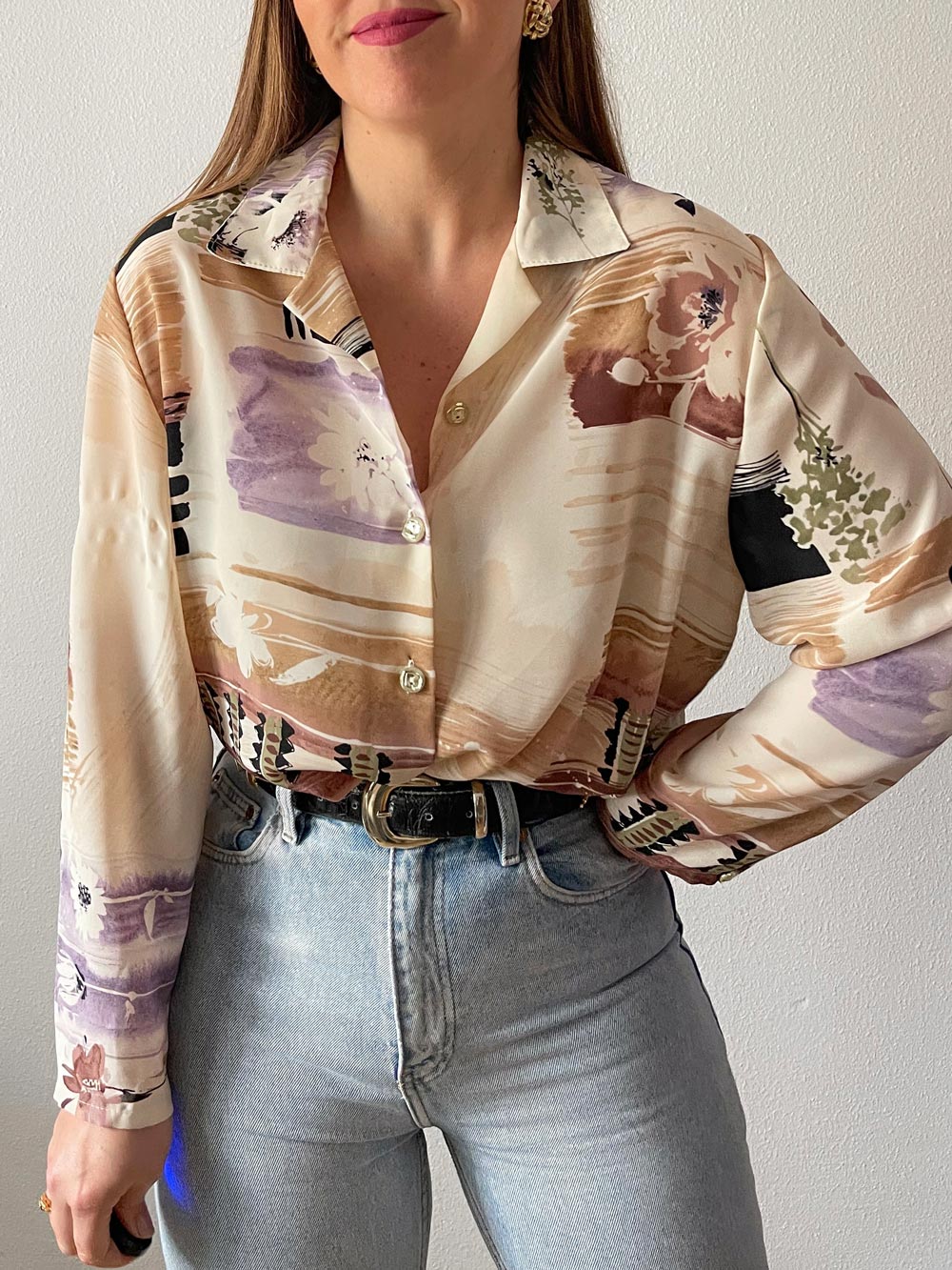 Camisa estampado combinado con flores en tonos beige, marrones y malvas.