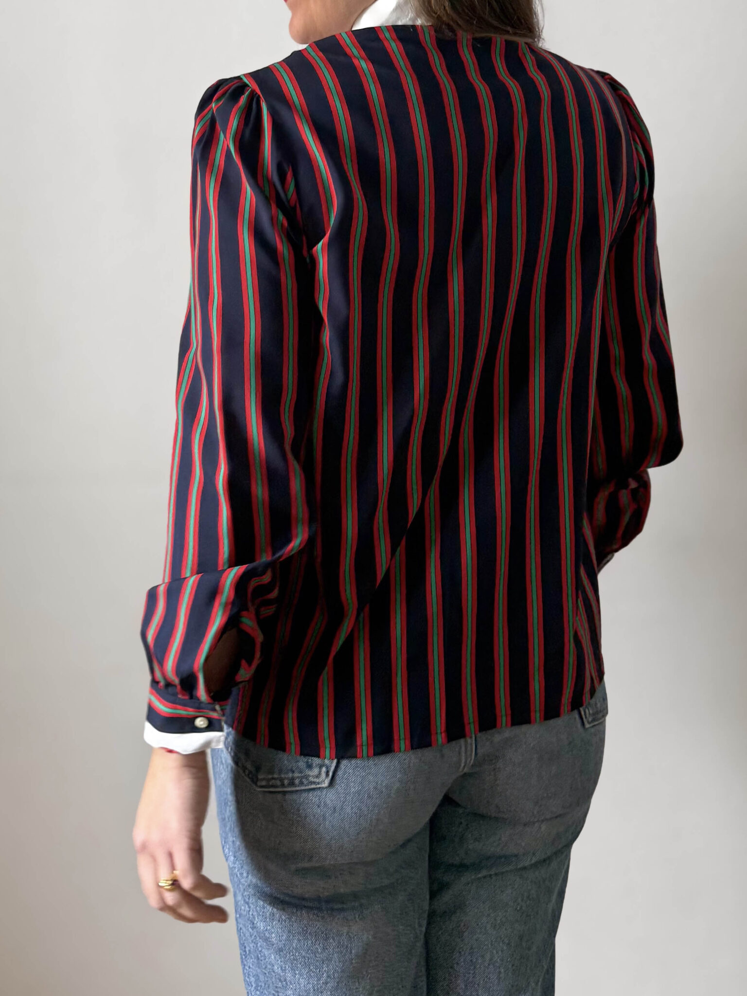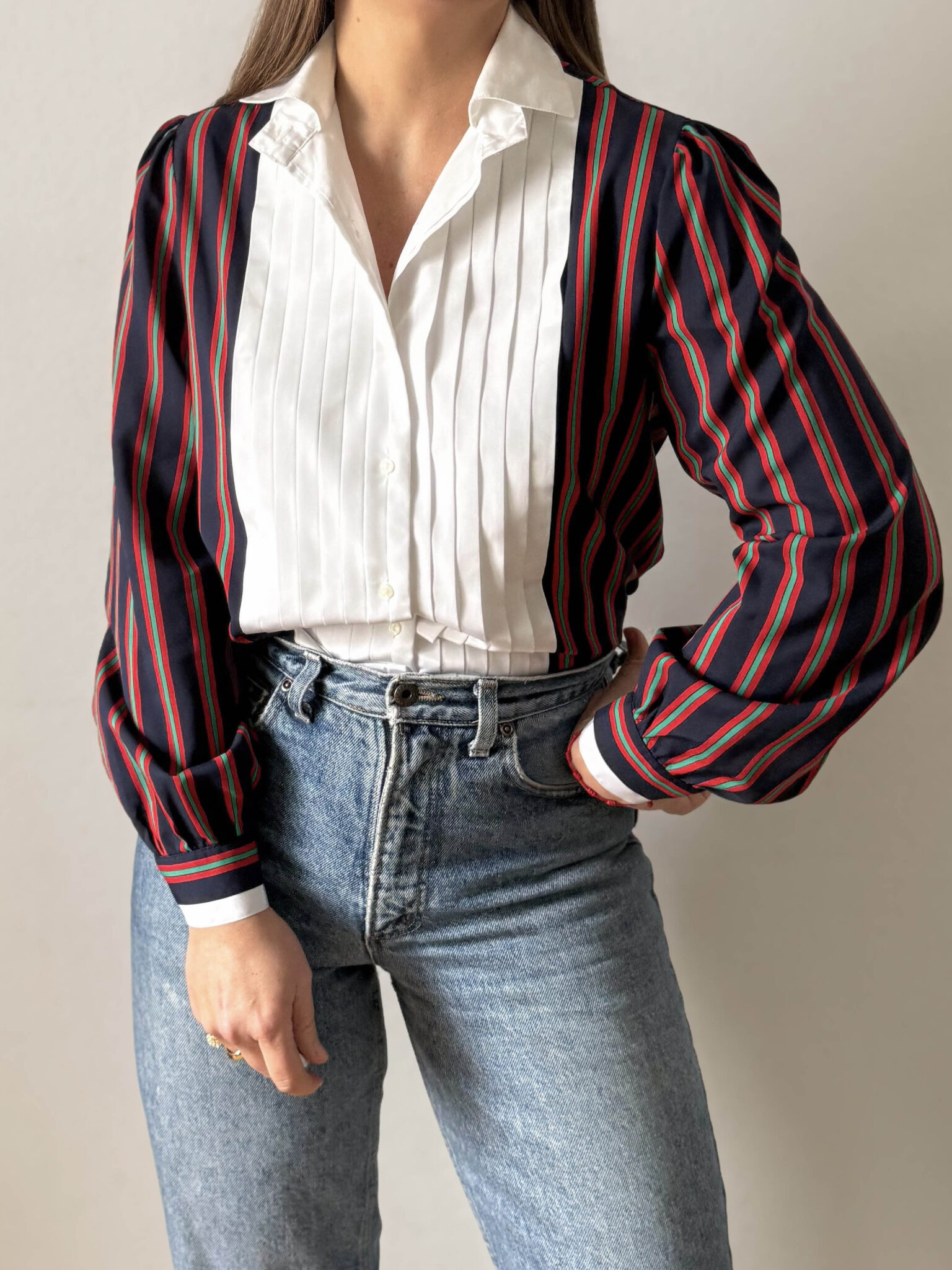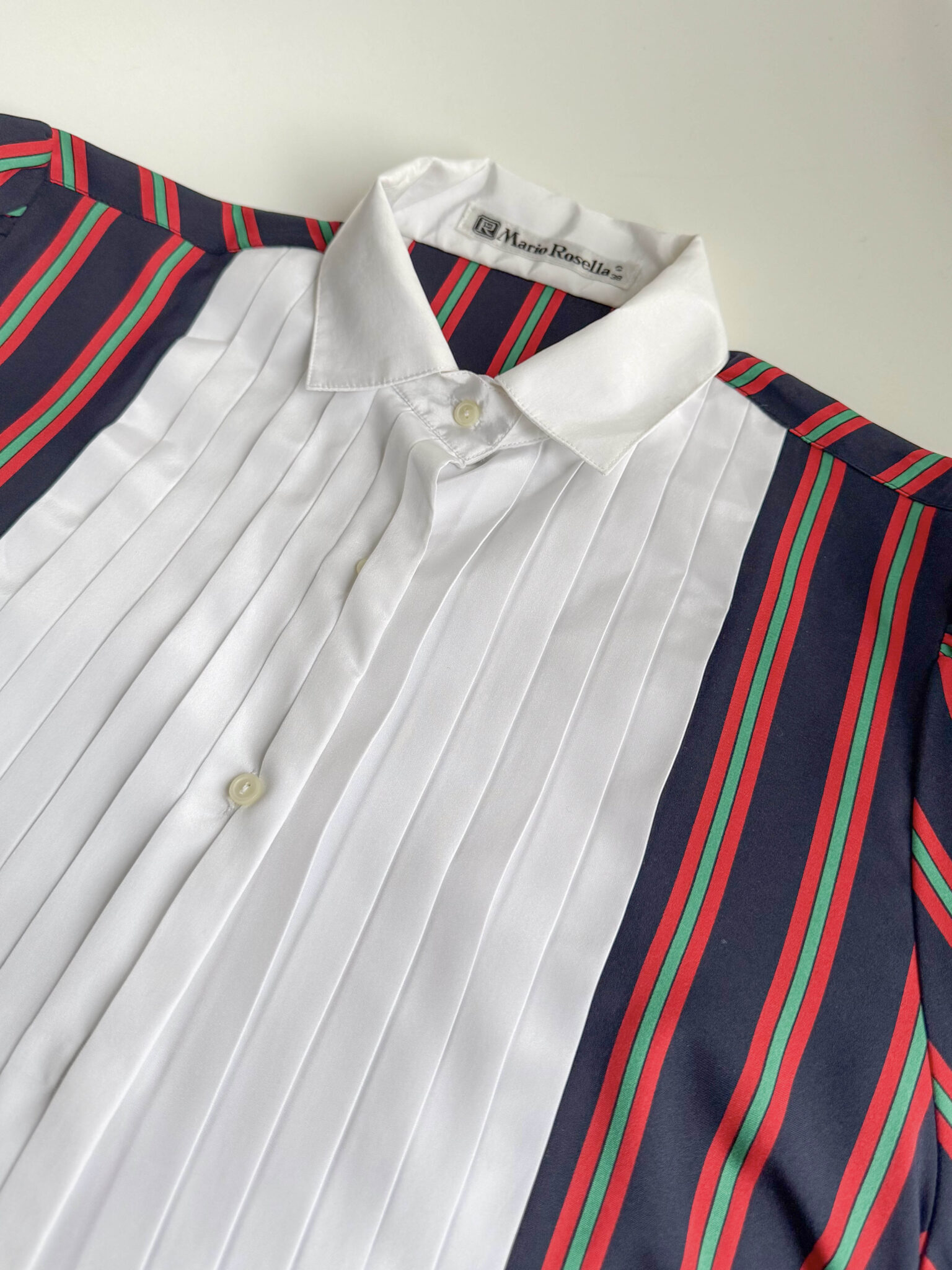 Camisa Mario Rosella, firma italiana de gran calidad. Camisa con pechera blanca tableada y cuerpo con tejido a rayas verticales en color azul, rojo y verde. Prenda muy original