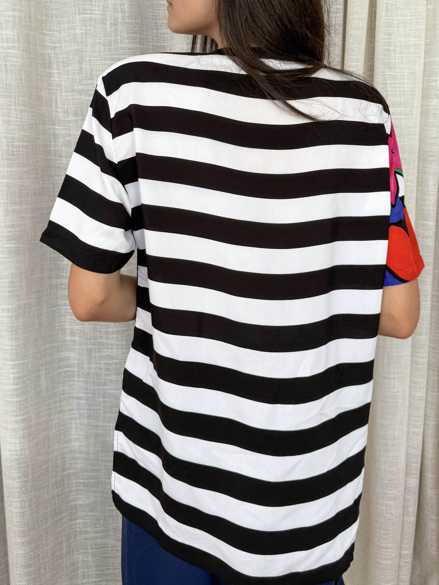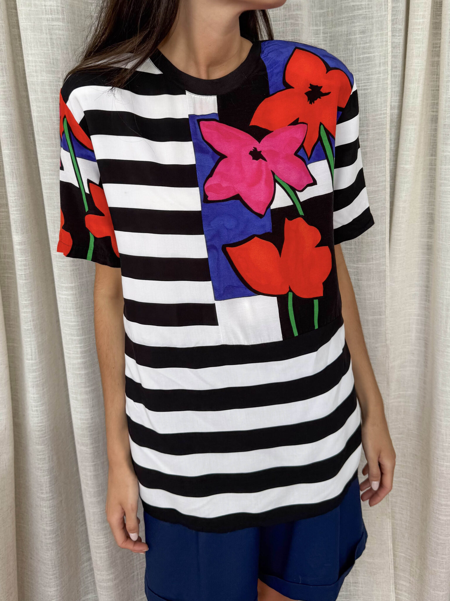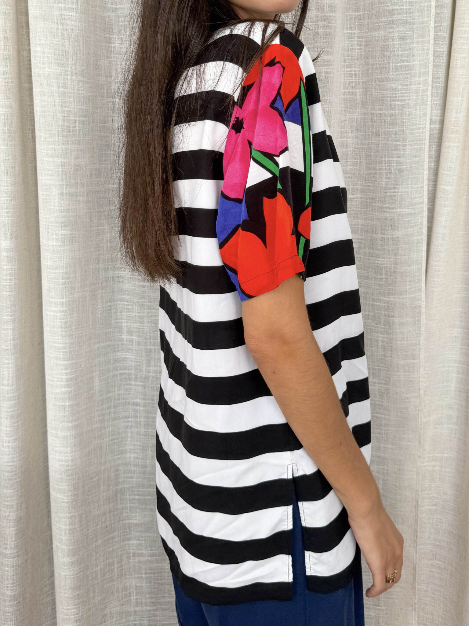 Camiseta rayas vintage con detalle de print floral a un lado y en una de las mangas. Escote redondo con elástico y hombreras.