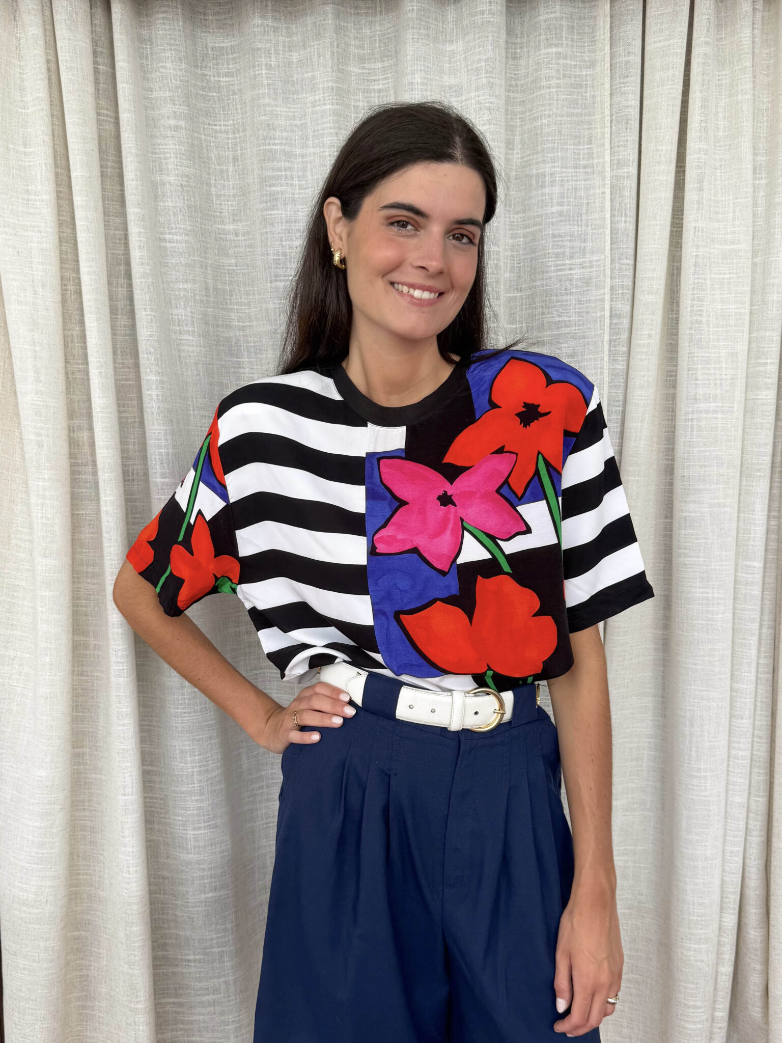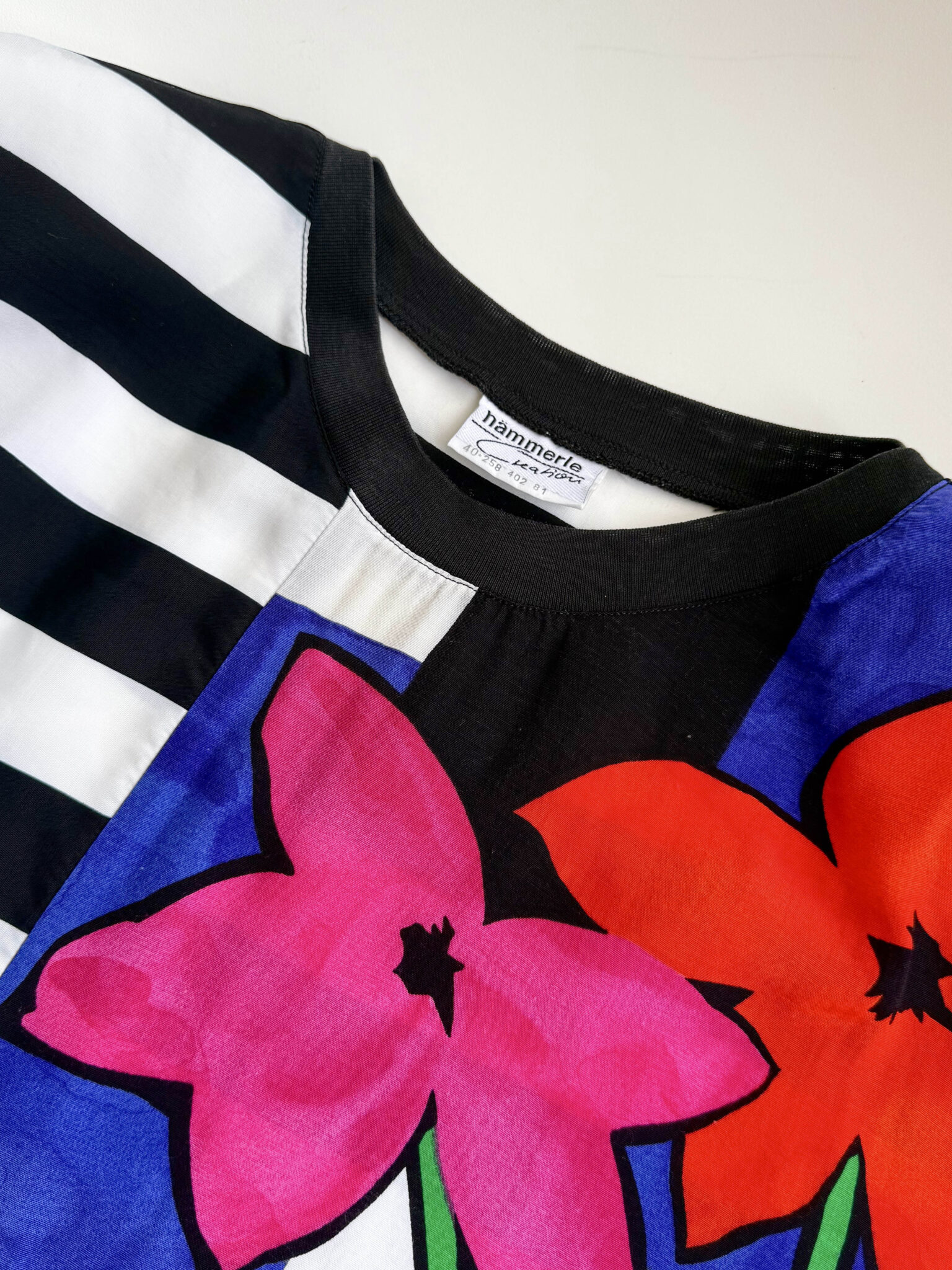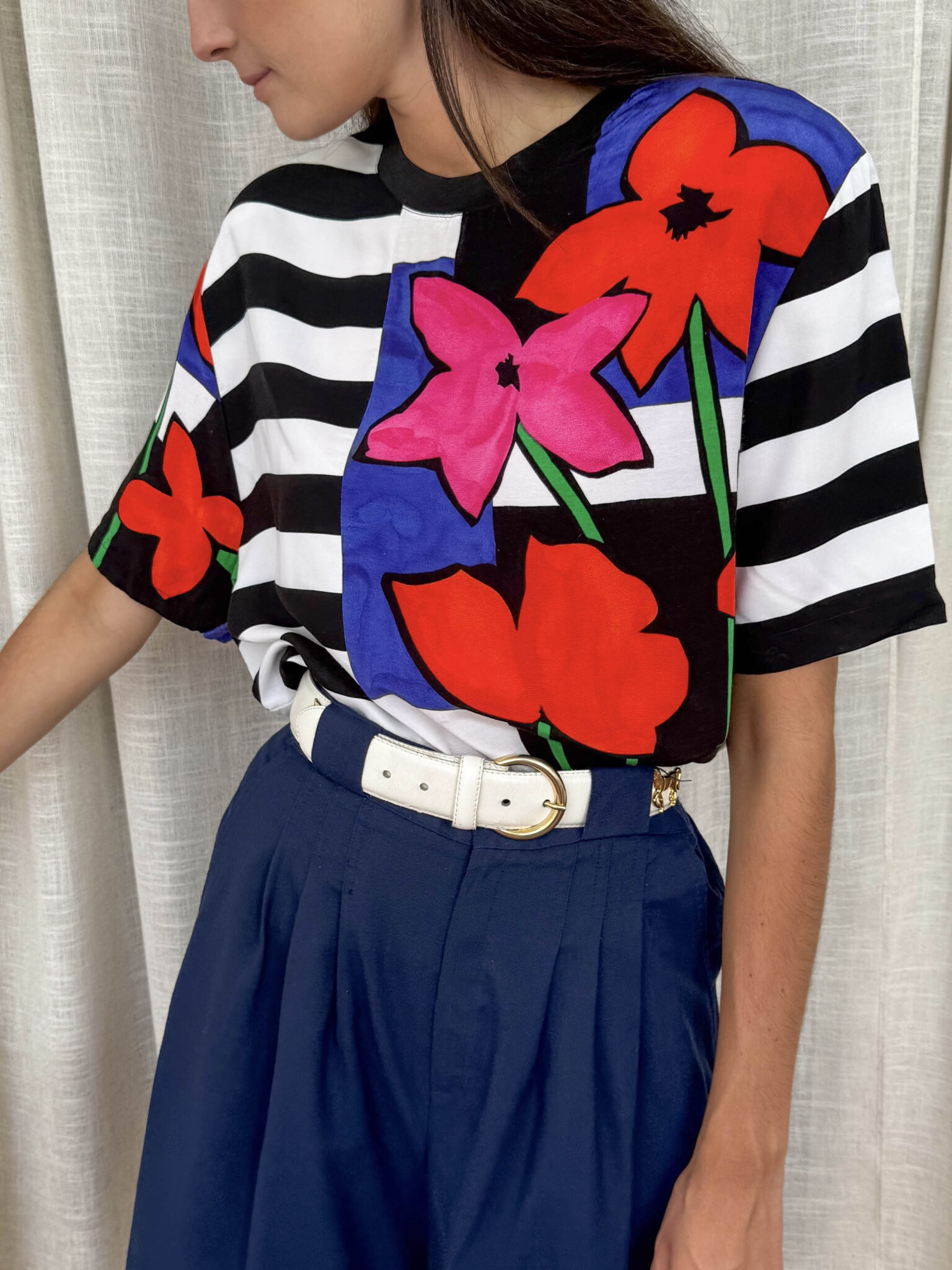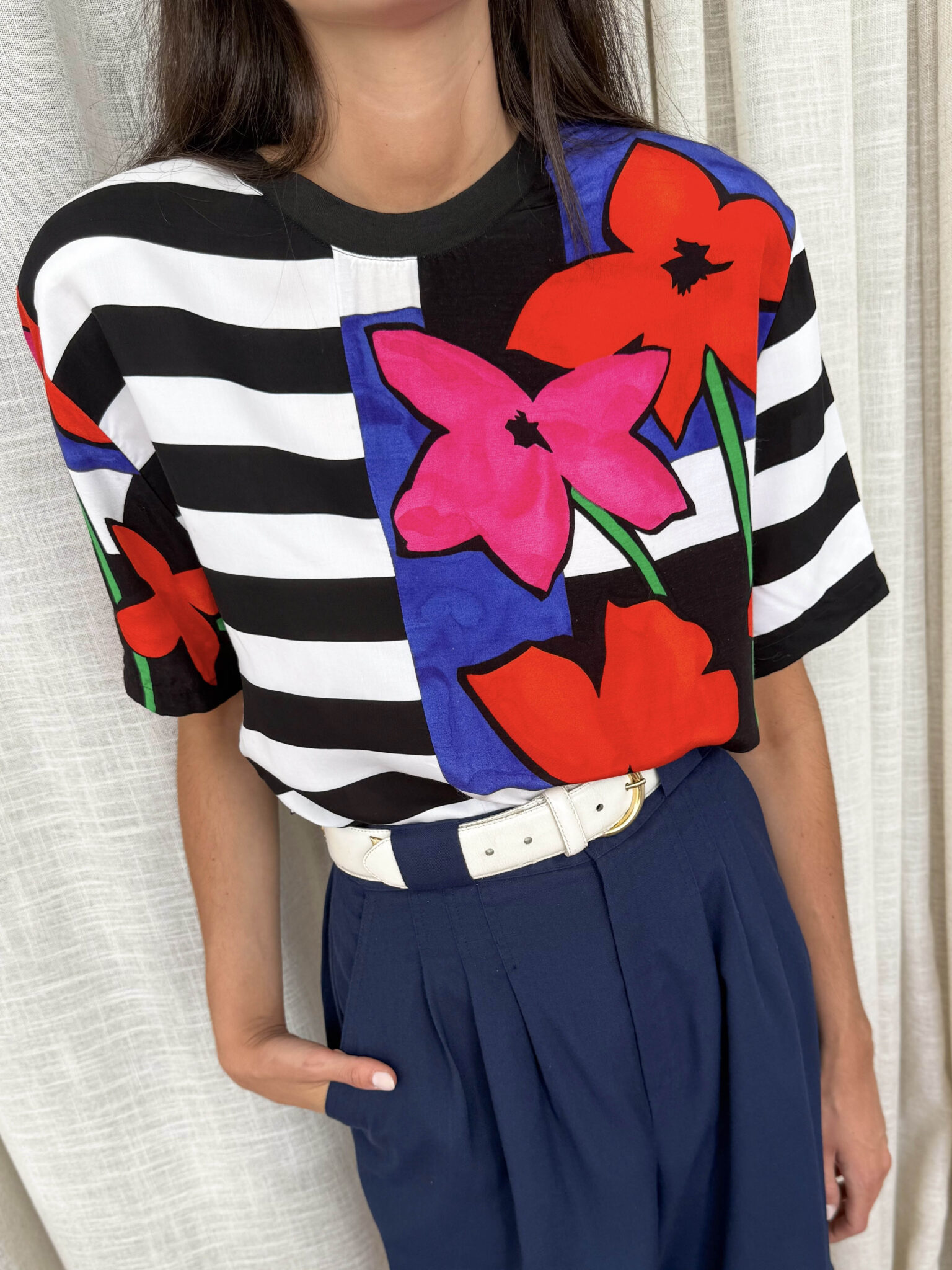 Camiseta rayas vintage con detalle de print floral a un lado y en una de las mangas. Escote redondo con elástico y hombreras.