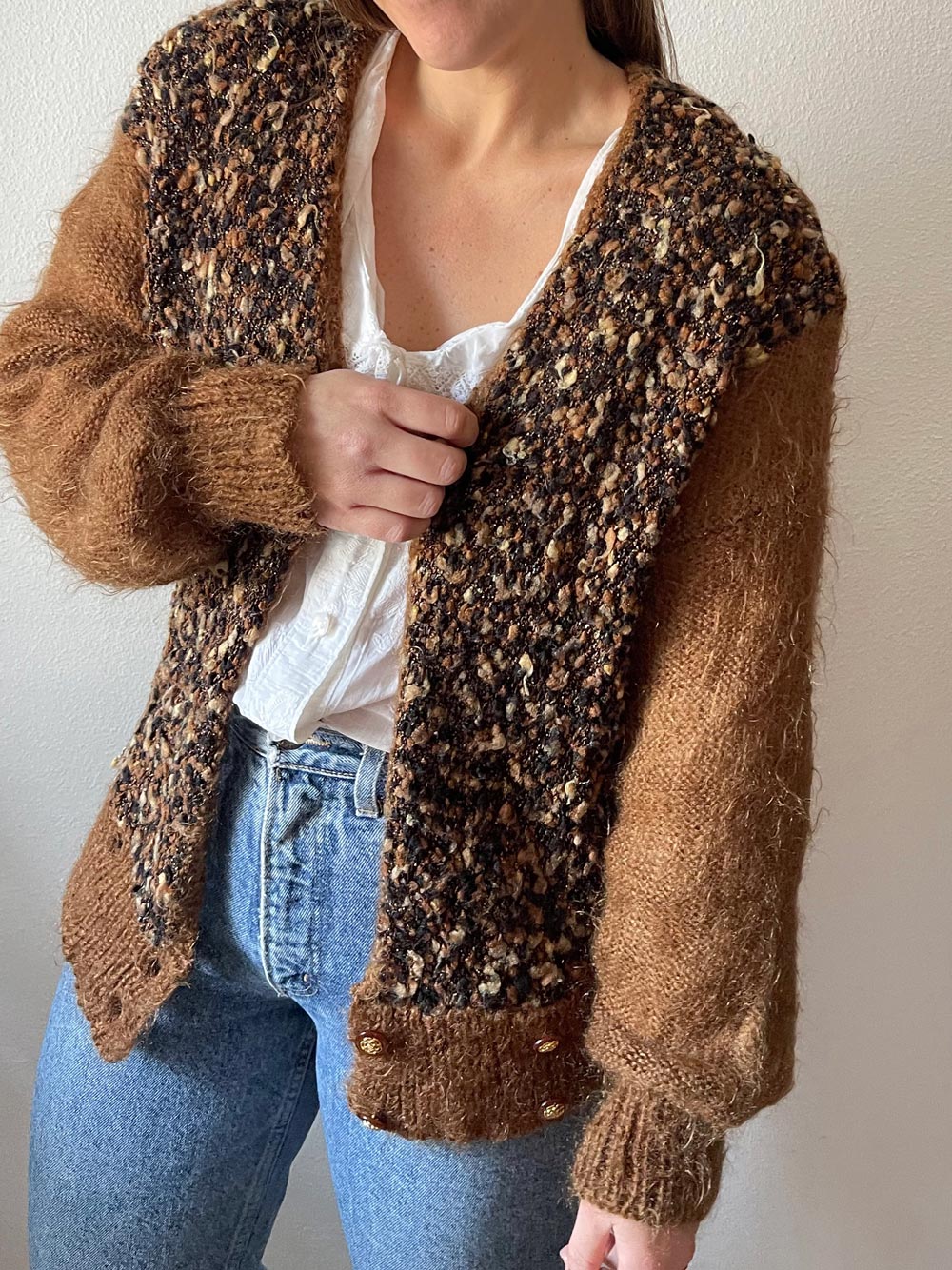 Cardigan mohair vintage fabricado en Francia. Escote en V con cierre inferior en cintura con botones. Muy gustoso. Colores marrón, negro y beige.
