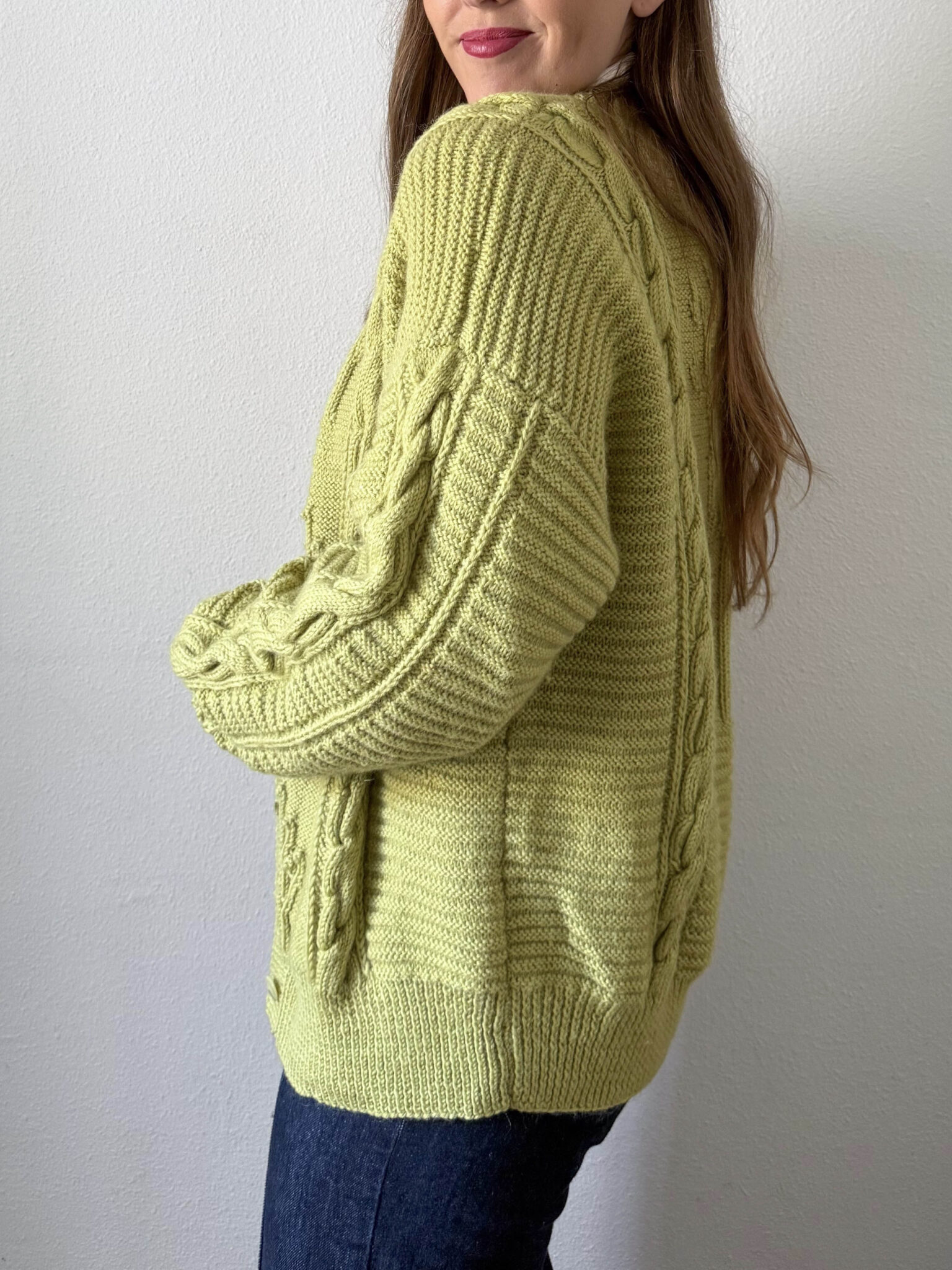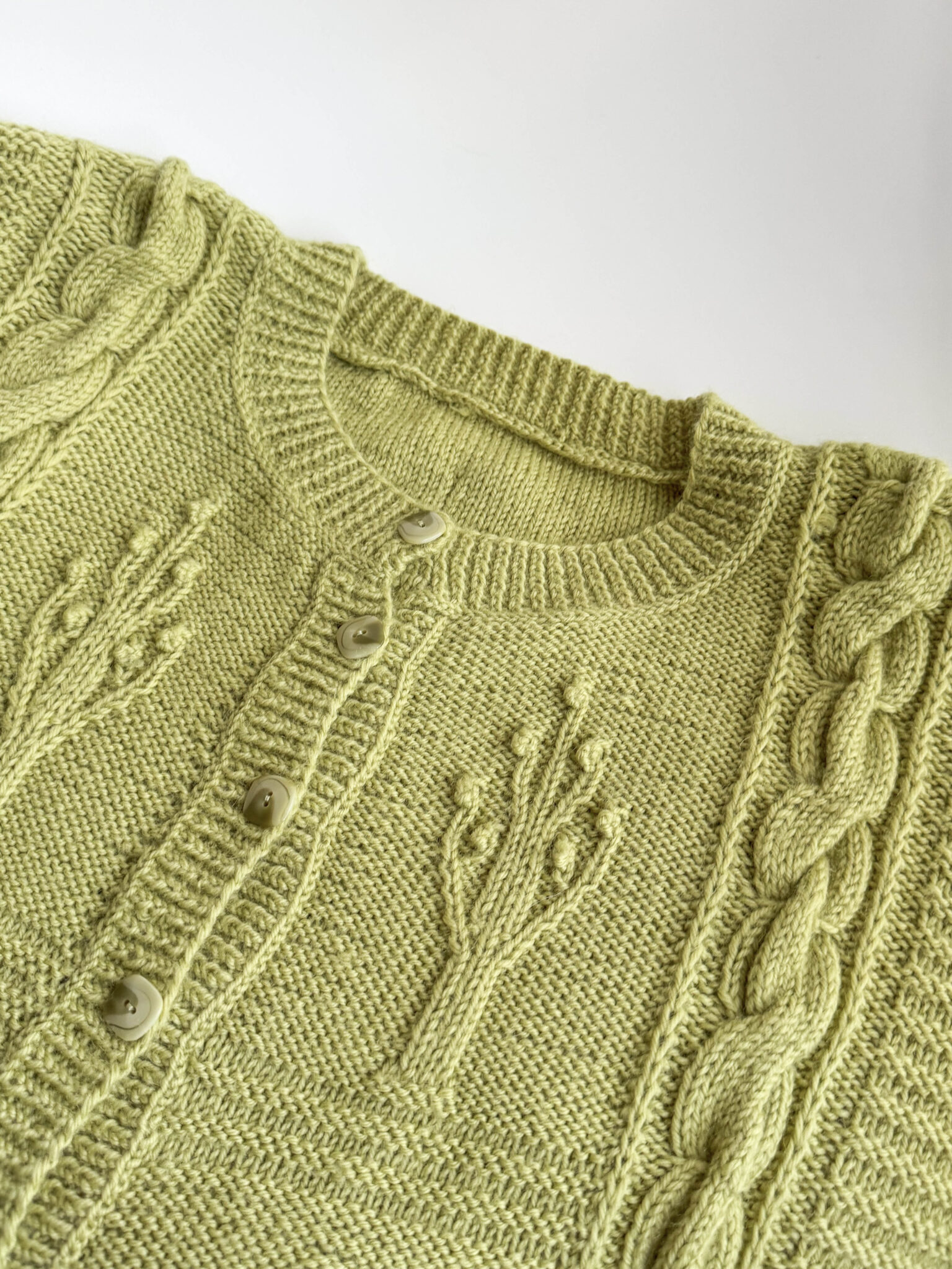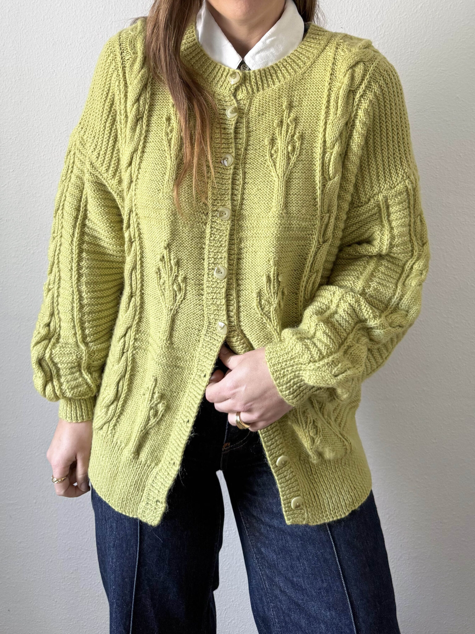 Cardigan trenzado lima de punto. Color súper favorecedor. Escote redondo, cierre frontal y corte oversize. Tejido con trenzados y relieves florales.