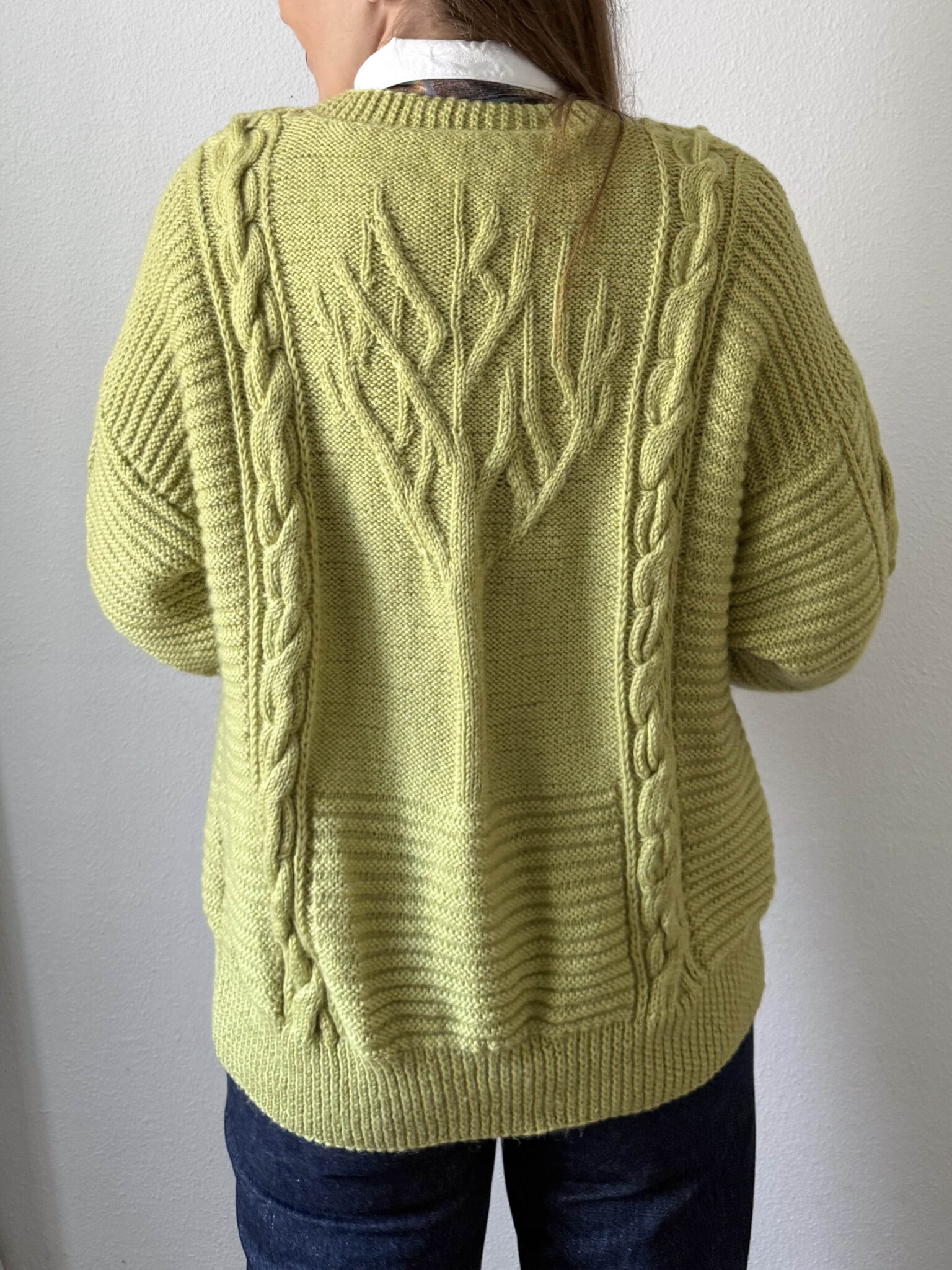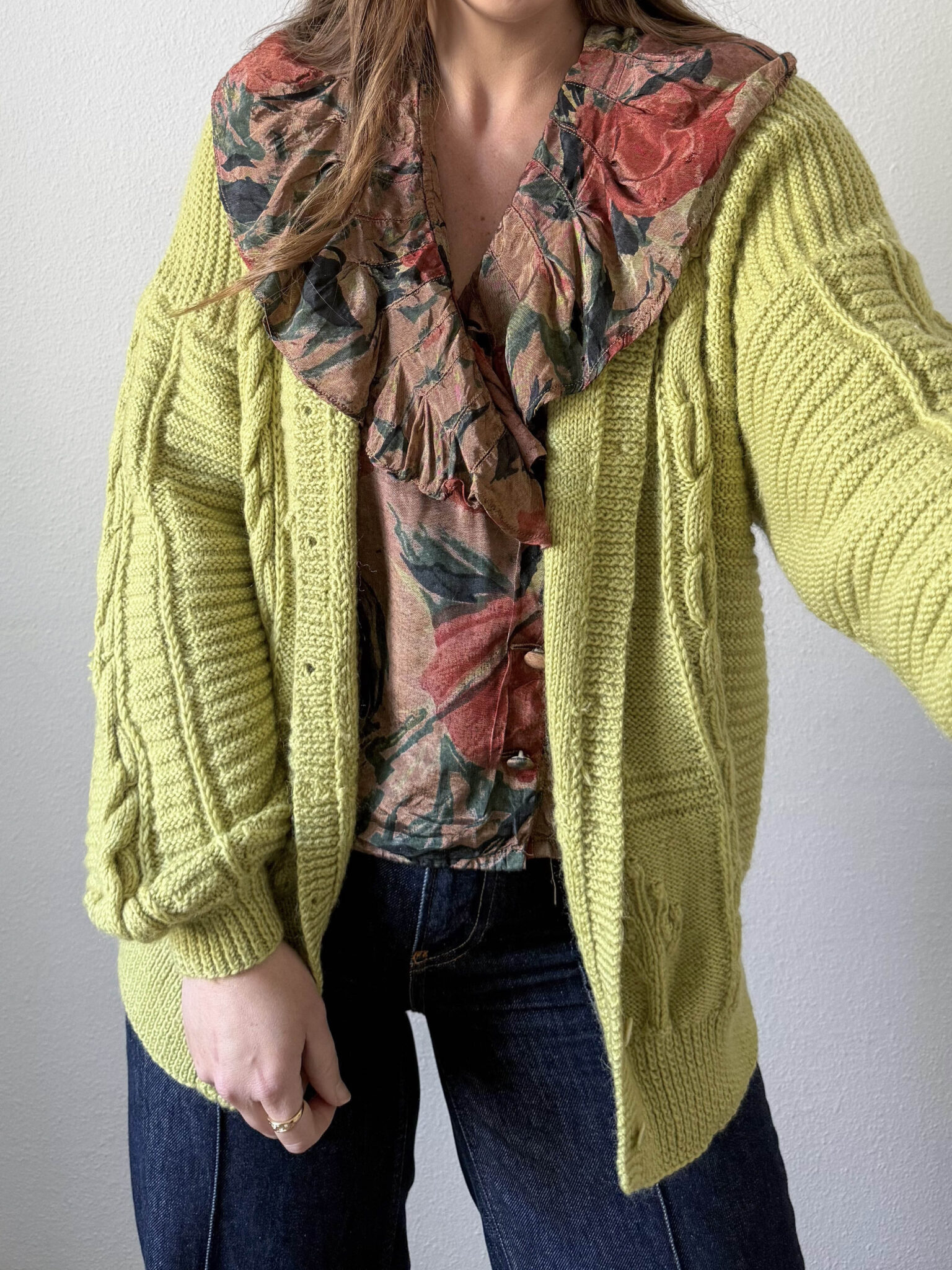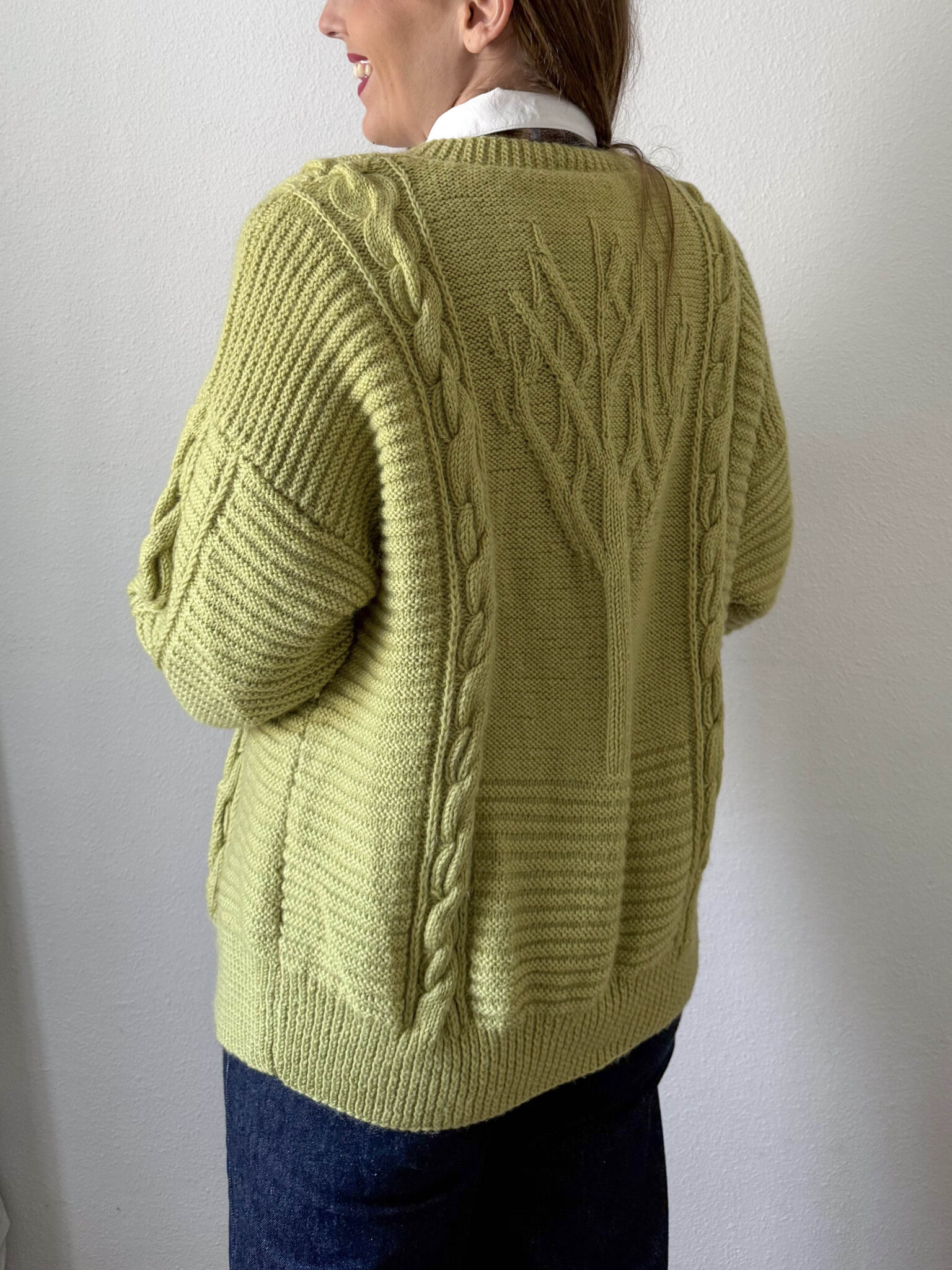 Cardigan trenzado lima de punto. Color súper favorecedor. Escote redondo, cierre frontal y corte oversize. Tejido con trenzados y relieves florales.