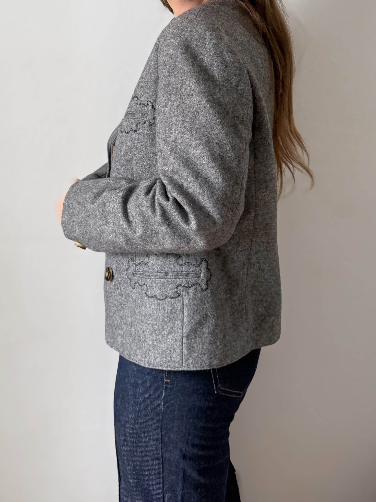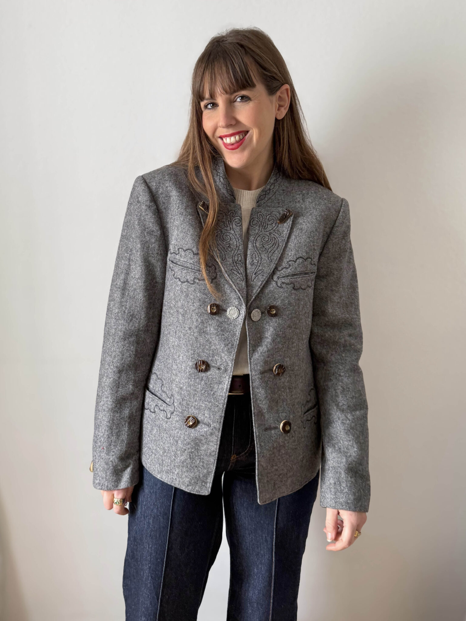 Chaqueta austriaca gris tipo Loden con detalles bordados en solapa y bolsillos en color negro. Botones de madera y un cierre metálico que se puede cambiar de posición