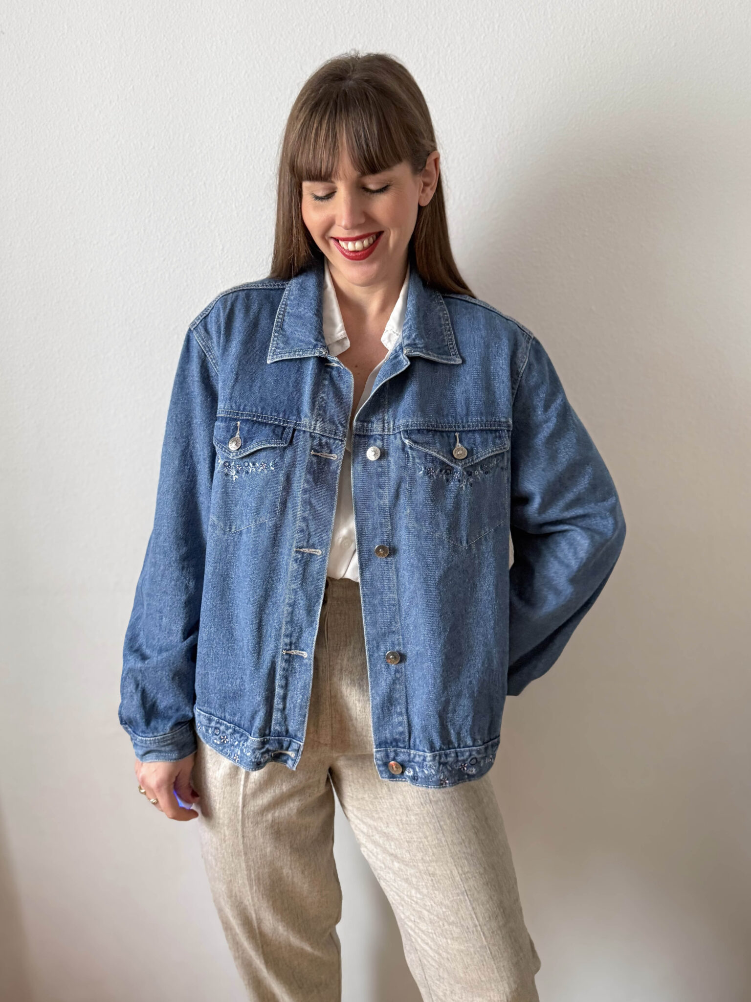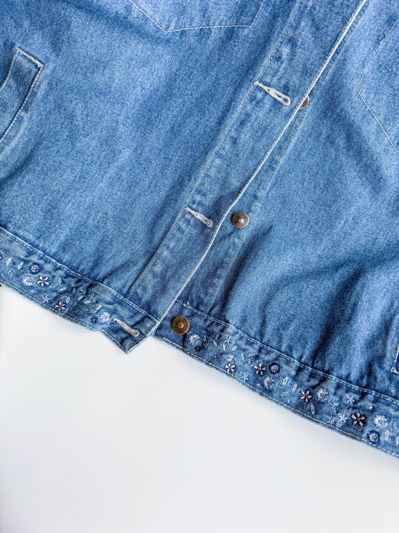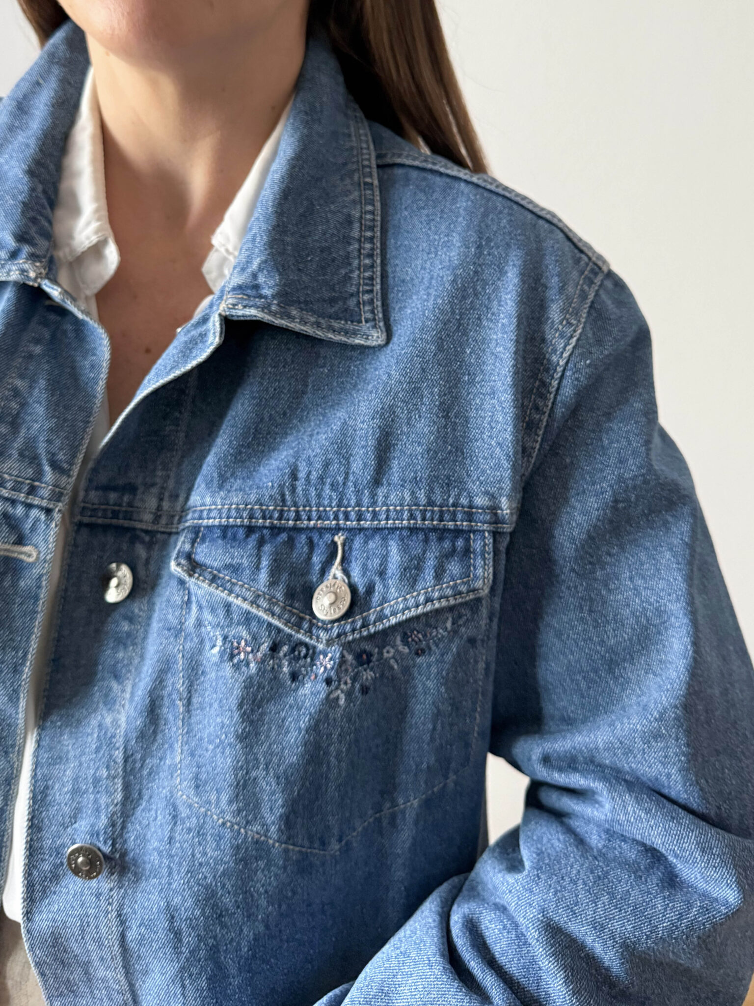 Chaqueta denim con bordados en tono medio. Corte ligeramente oversize y detalles florales bordados en bolsillos y parte inferior de la chaqueta.