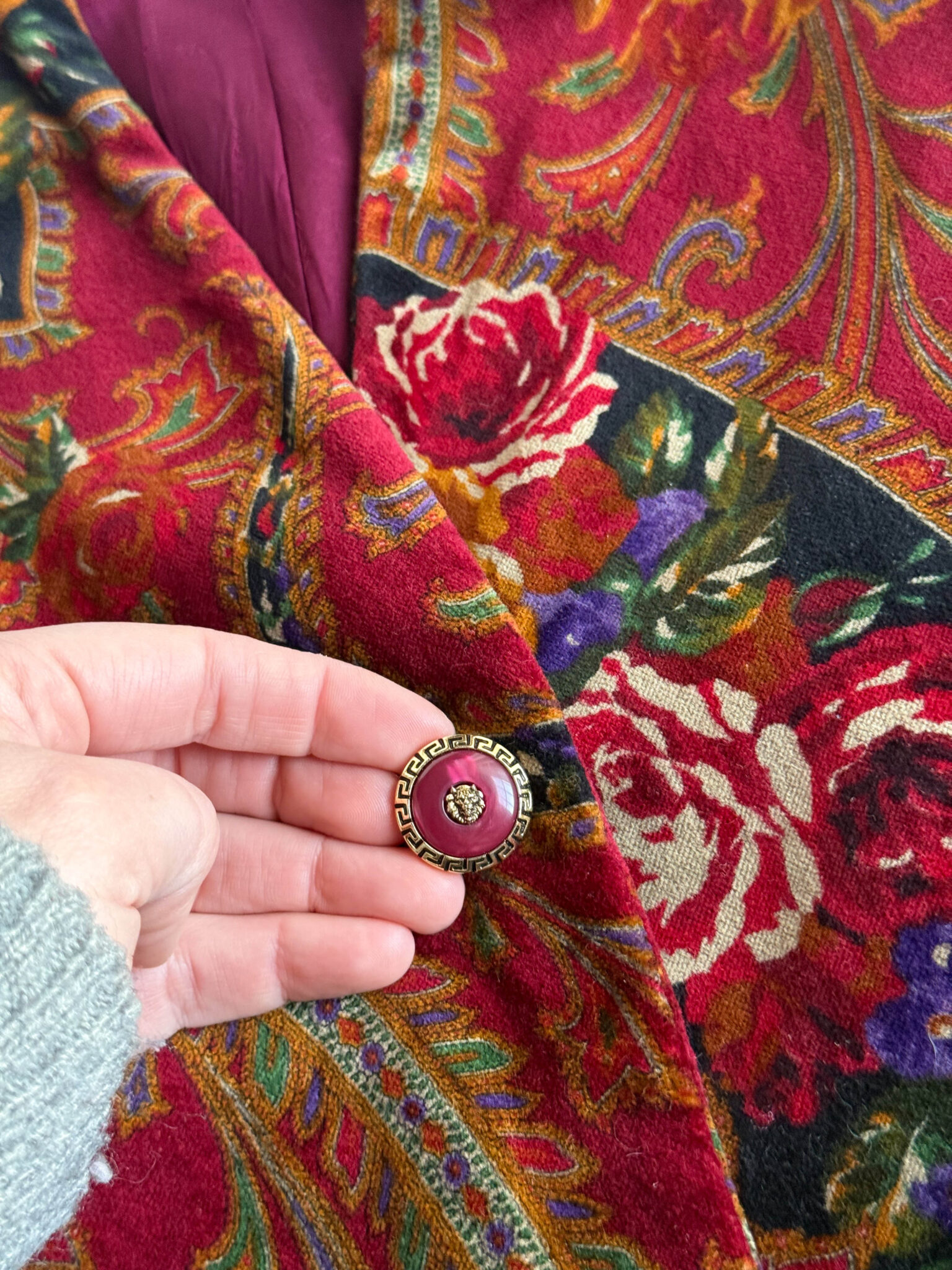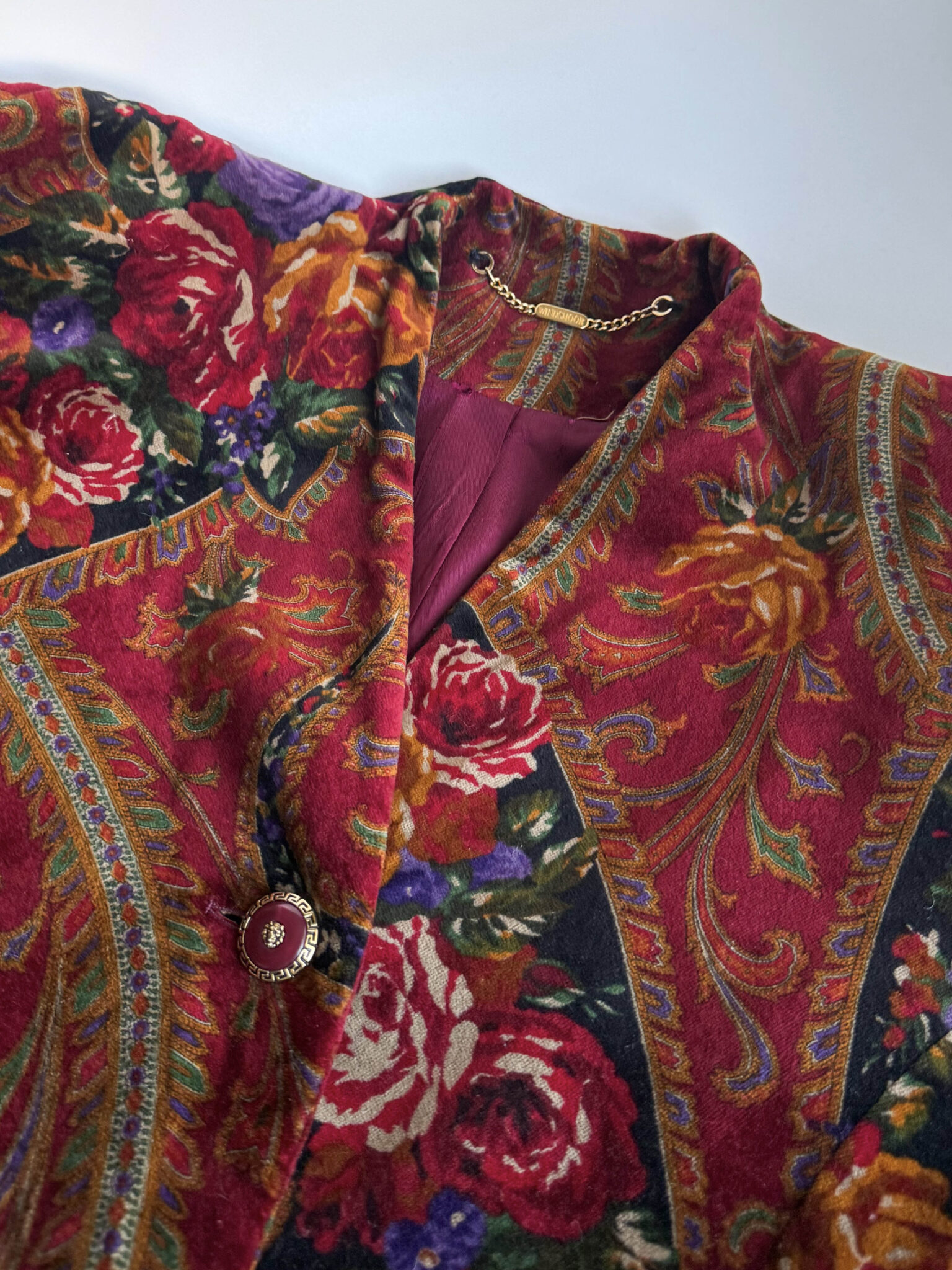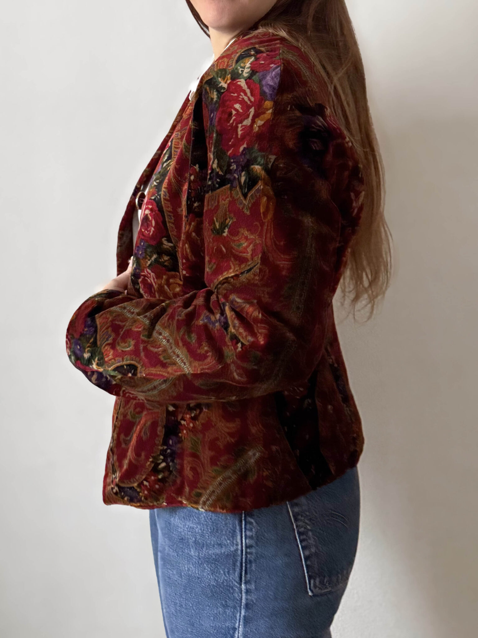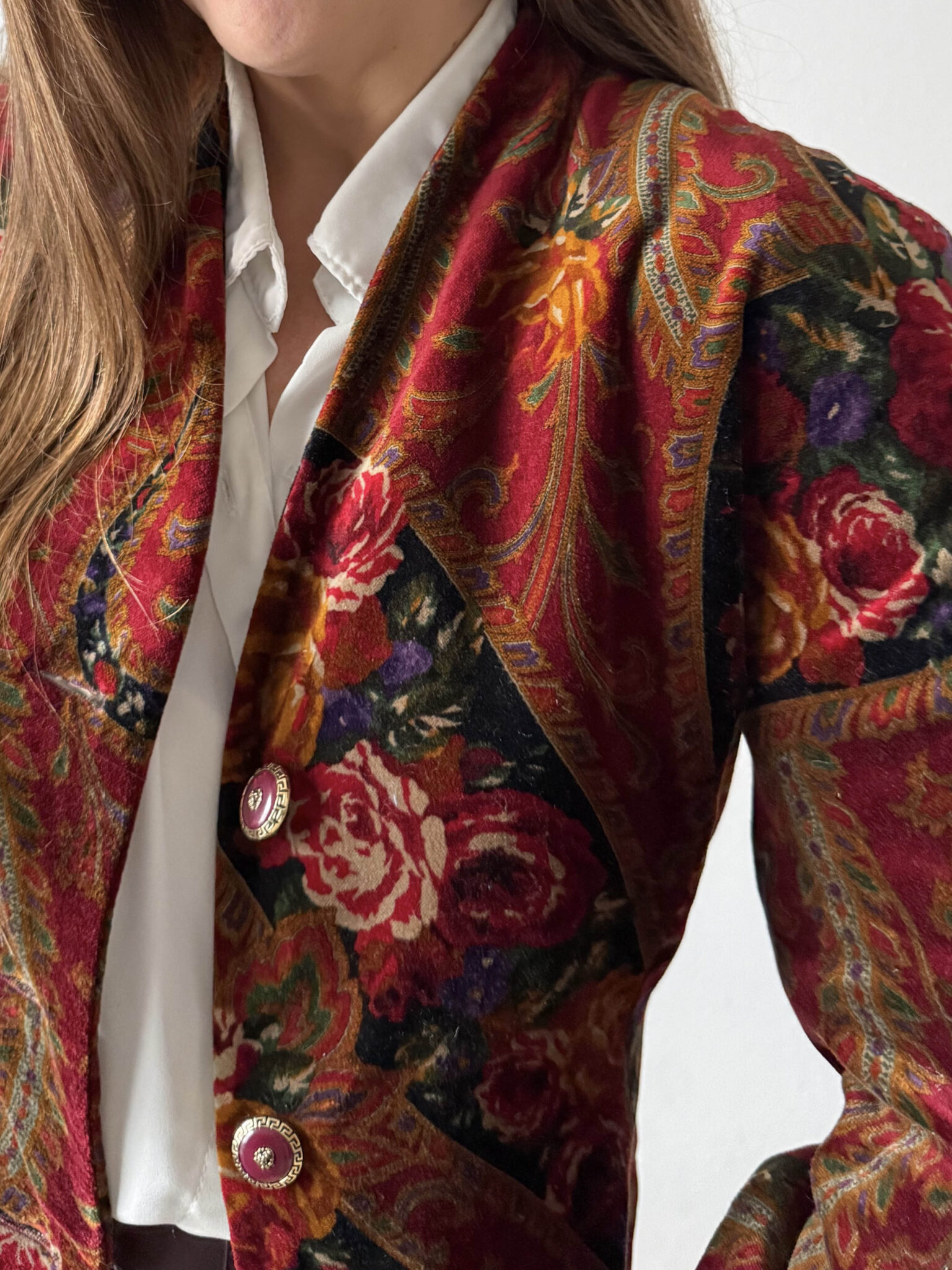 Chaqueta entallada terciopelo fabricada en Italia. Tejido estampado con motivos florales, corte entallado en cintura y botones joya. Años 80. Prenda de gran calidad