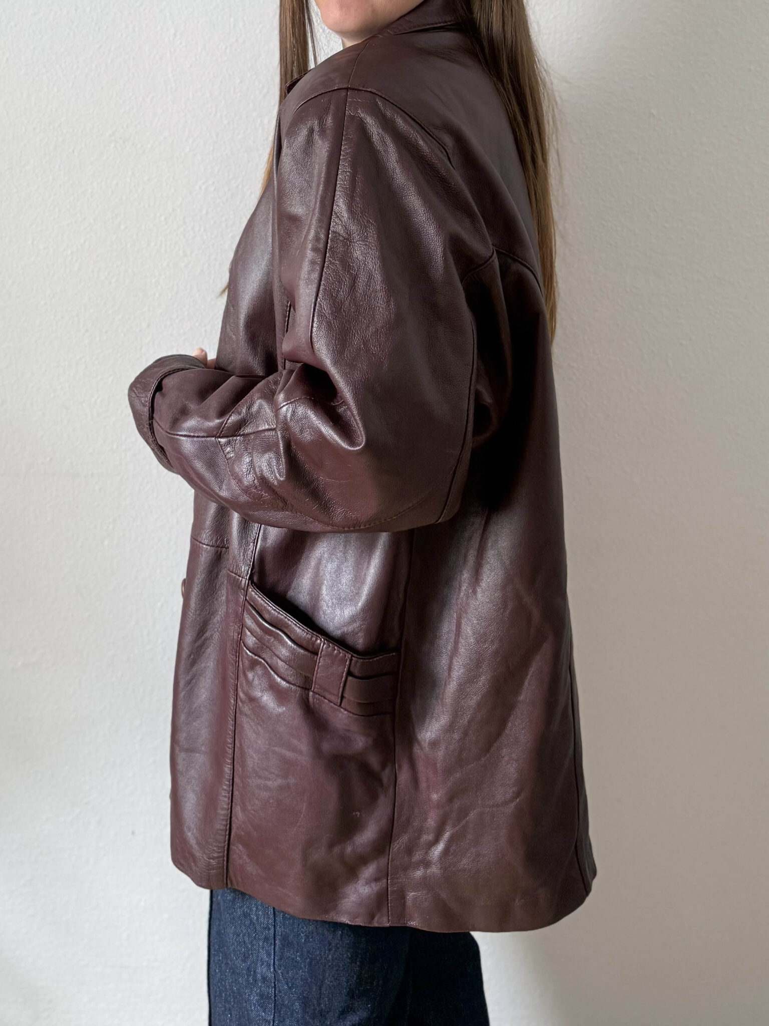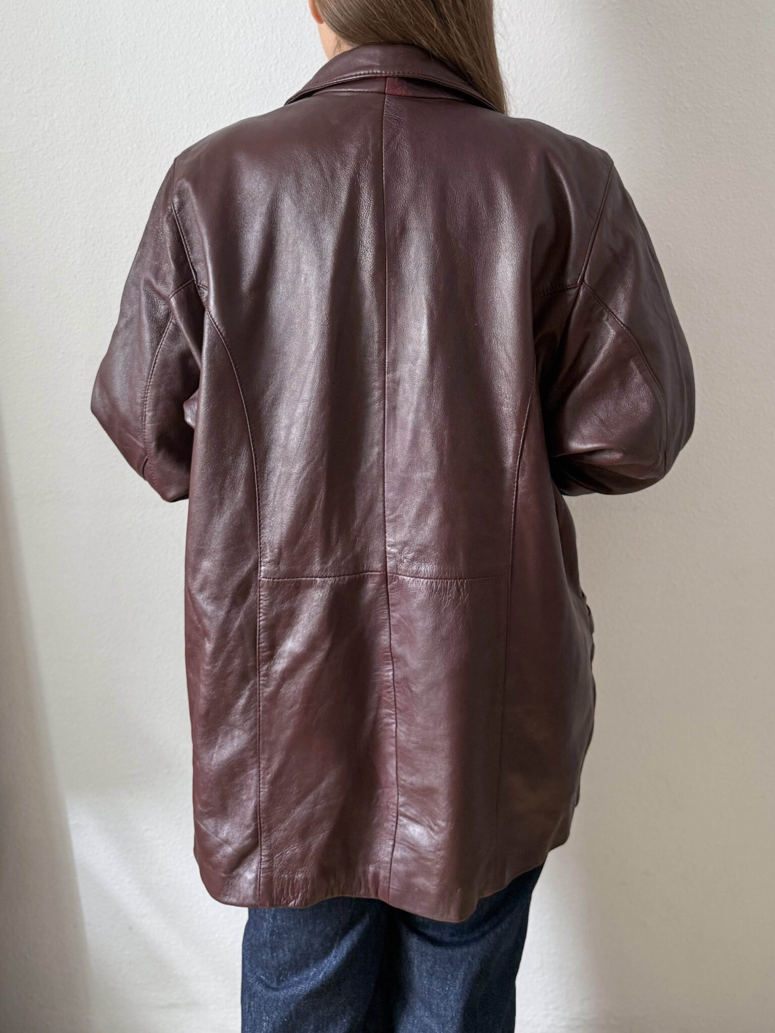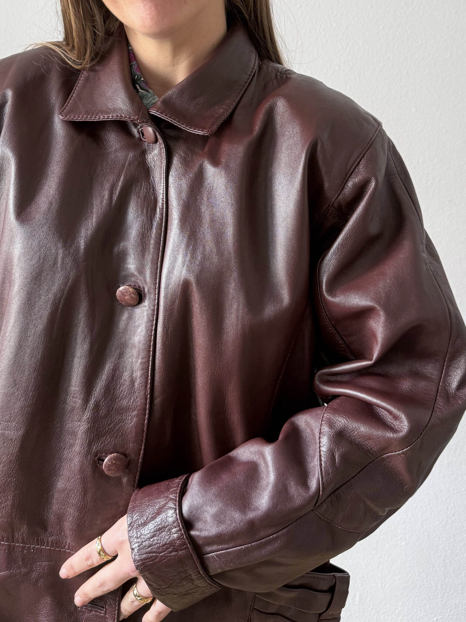 Chaqueta granate piel de corte amplio ligeramente oversize. Cuello estilo camisero, silueta recta y bolsillos con detalle fruncido.