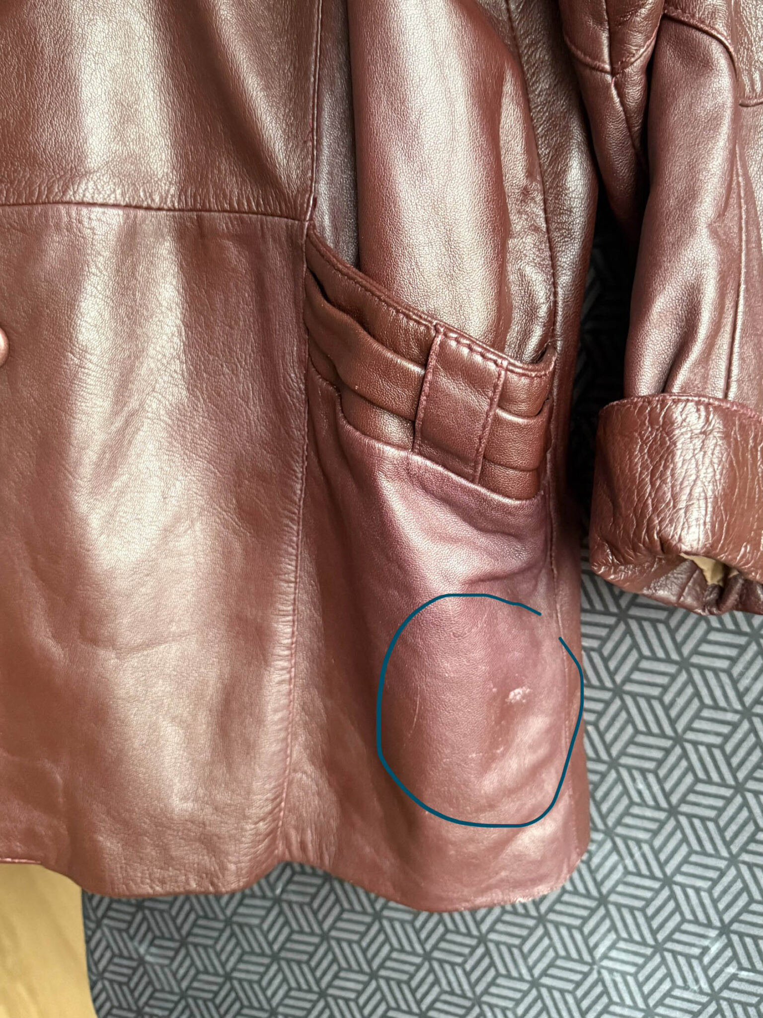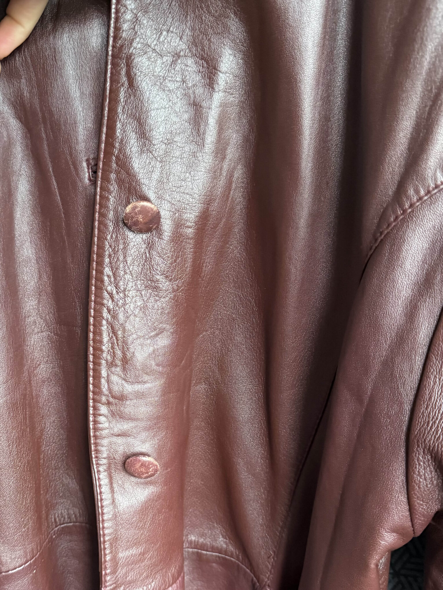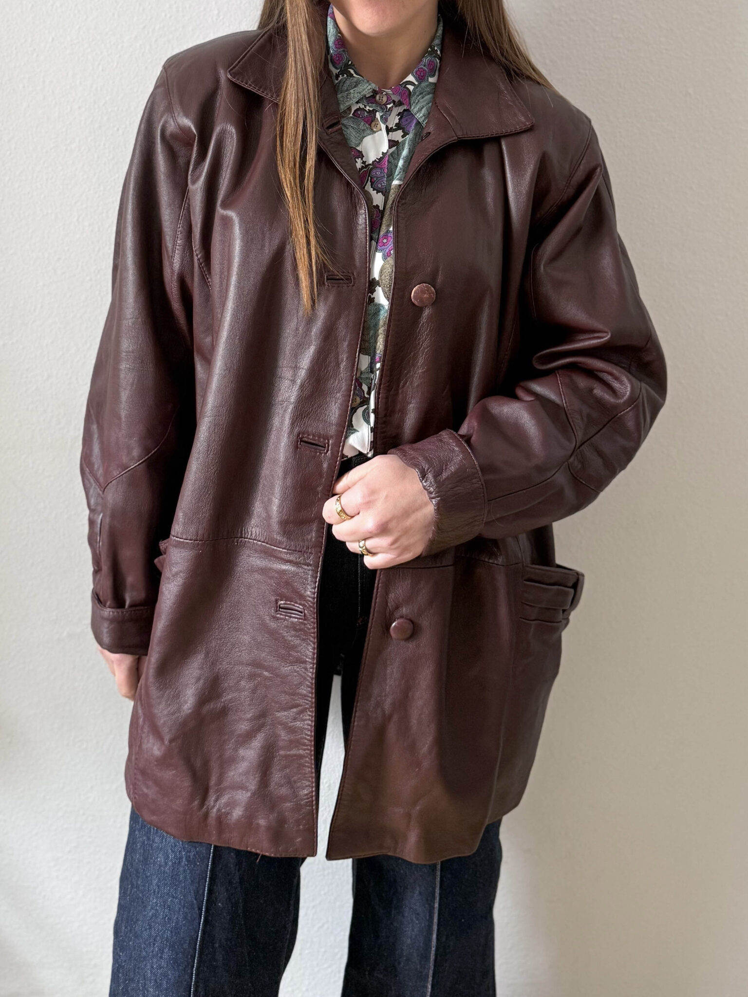 Chaqueta granate piel de corte amplio ligeramente oversize. Cuello estilo camisero, silueta recta y bolsillos con detalle fruncido.