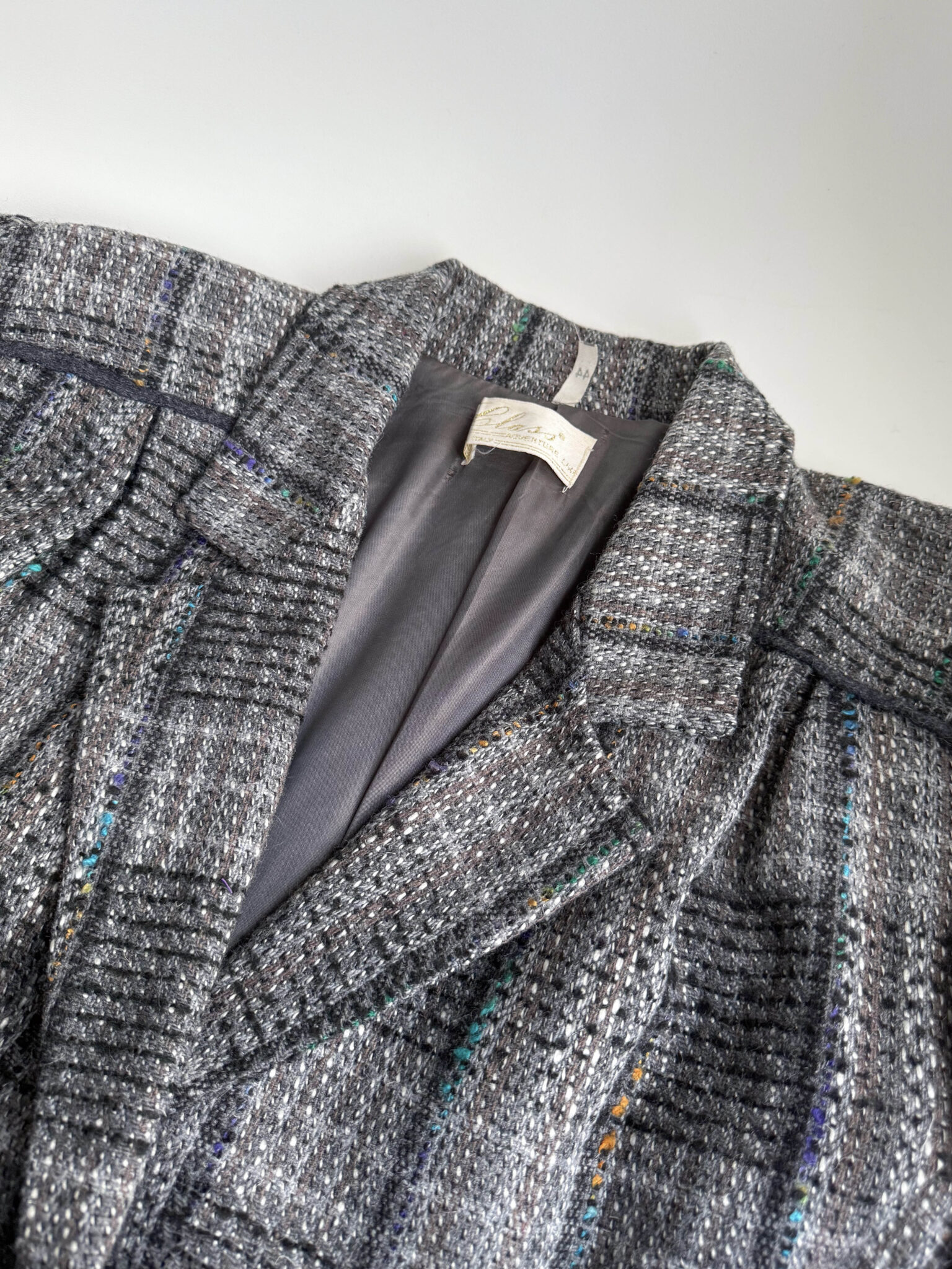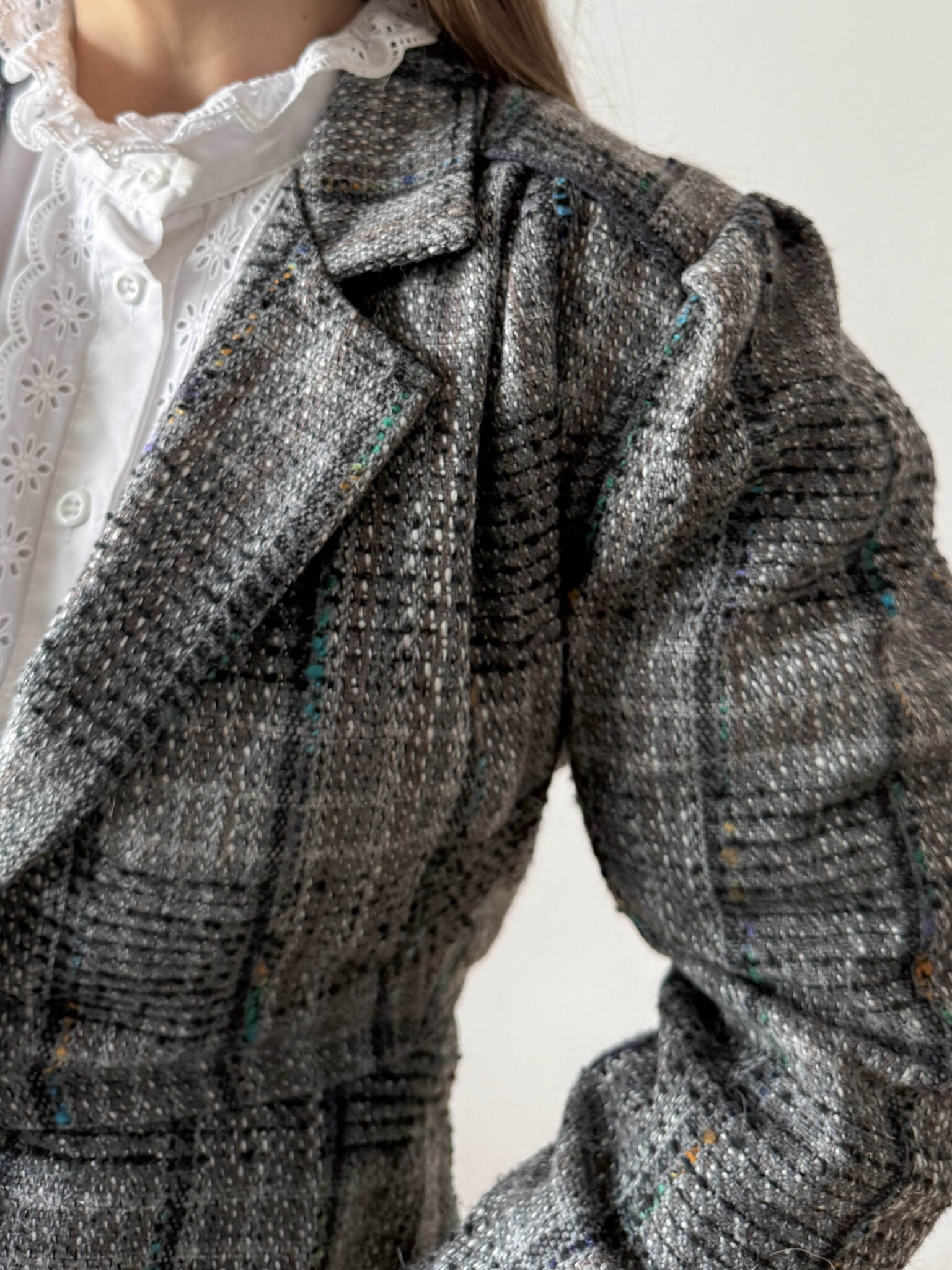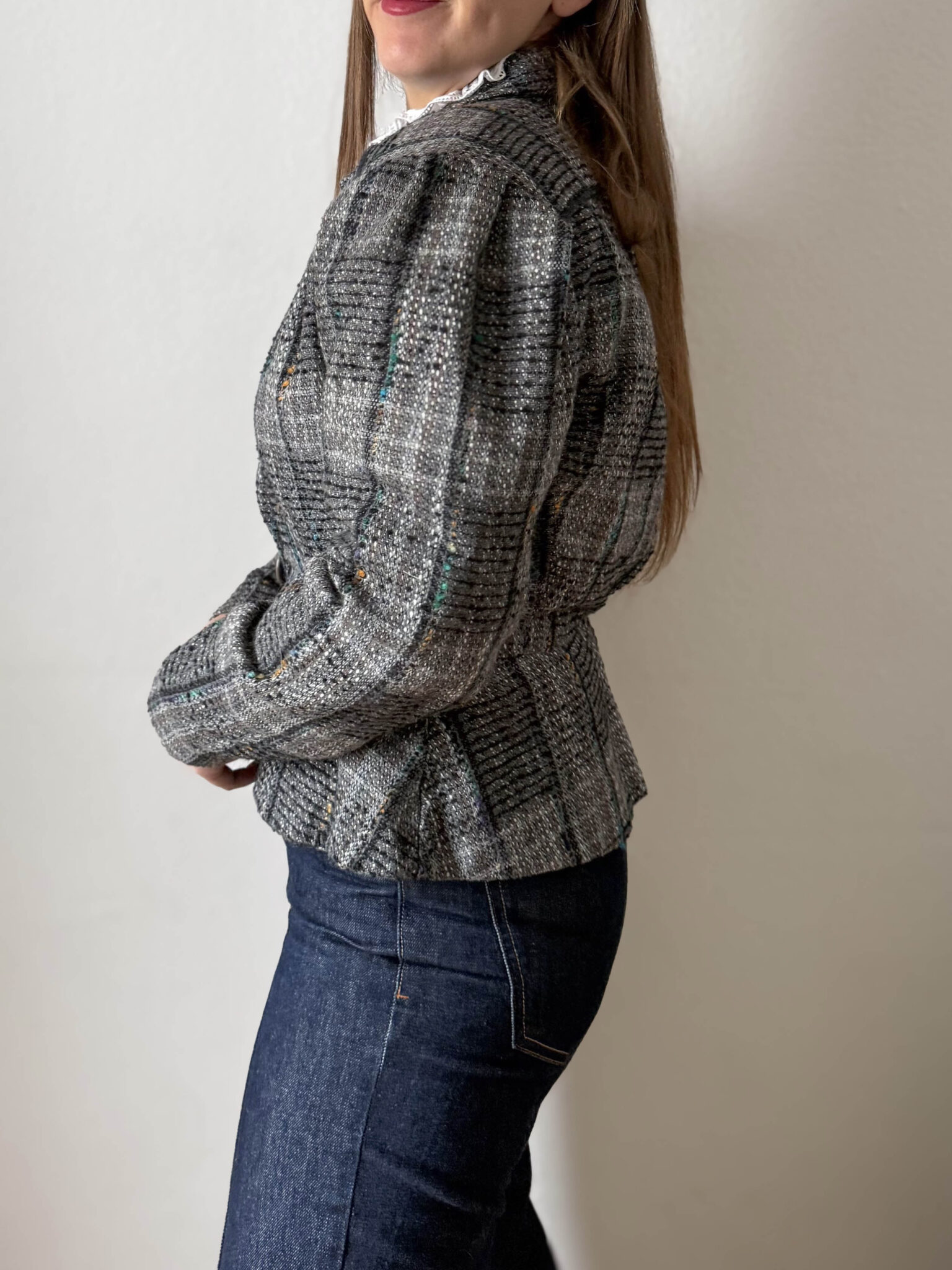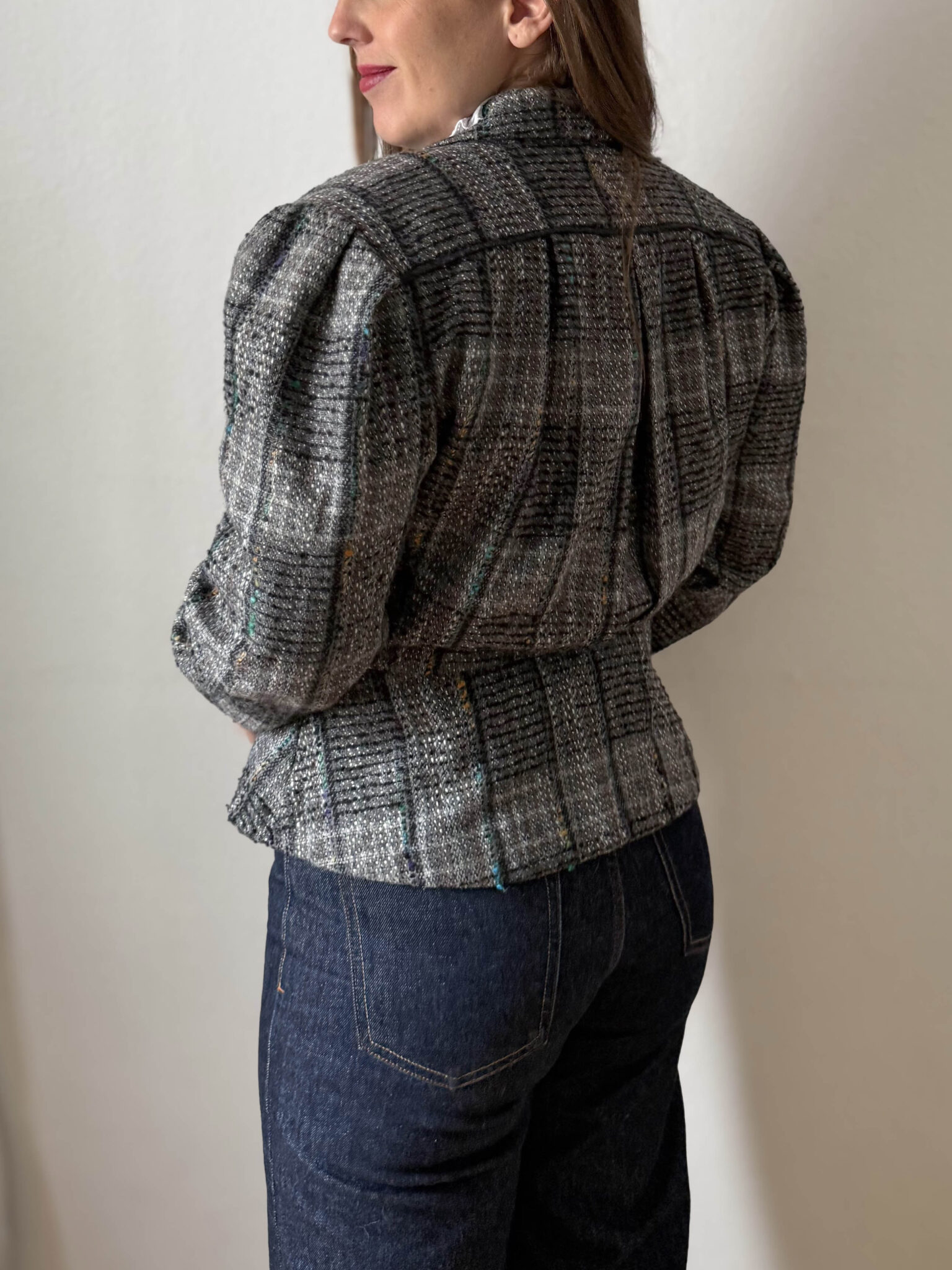 Chaqueta italiana peplum de silueta entallada, corte estructurado con mangas abullonadas y cintura tipo peplum. Tejido tipo tweed ideal