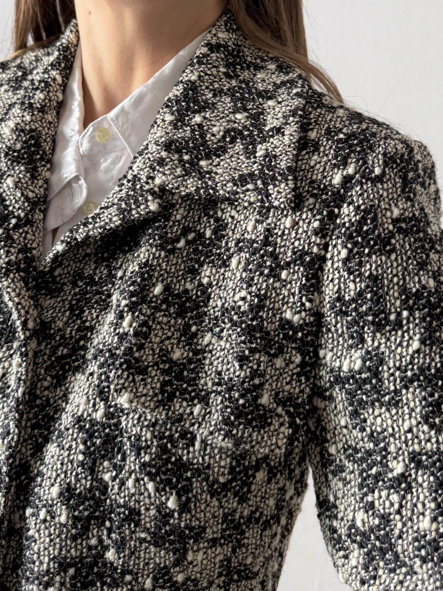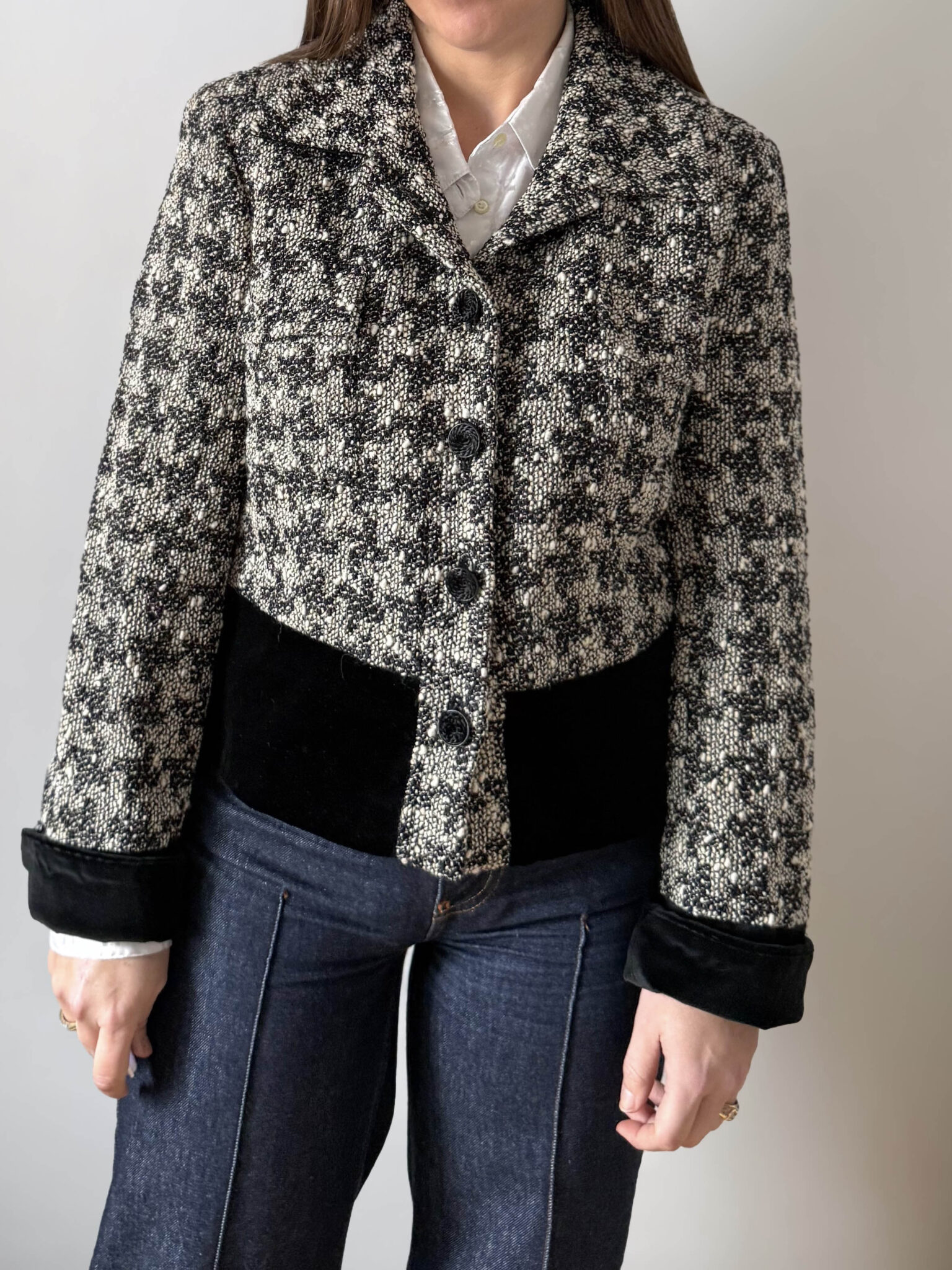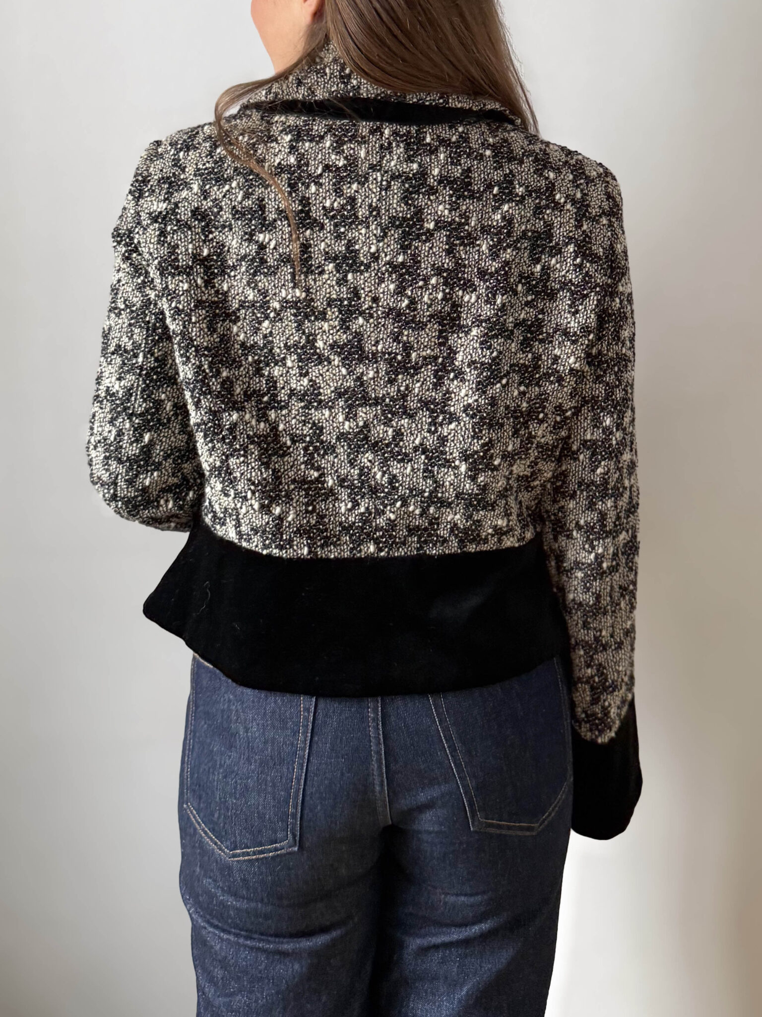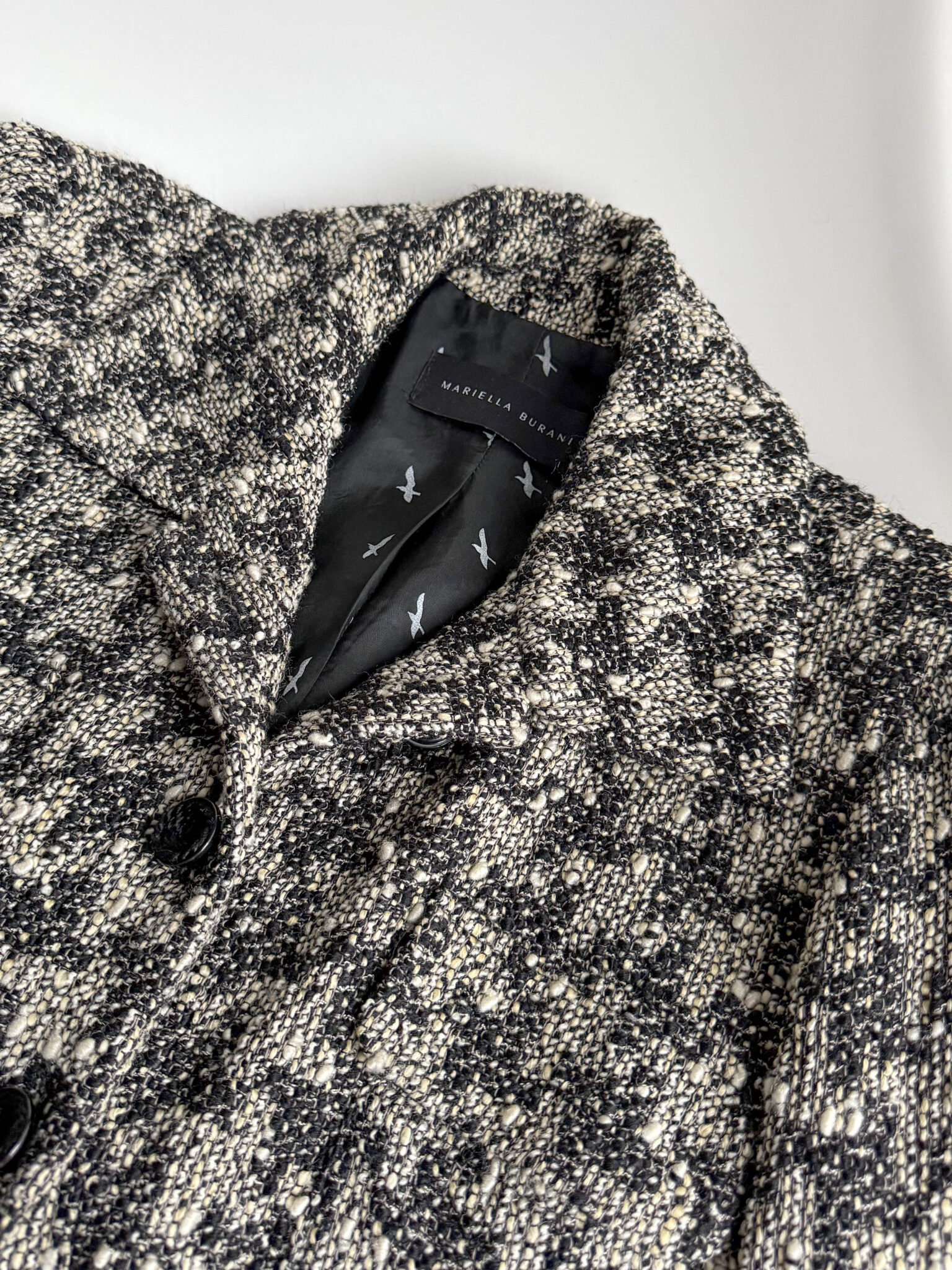 Chaqueta Mariella Burani, una de las firmas italianas más reconocidas del pret a porter de lujo accesible entre los 70 y los 2000. Chaqueta tipo tweed bicolor blanco y negro con solapa en escote, originales botones y detalles de puños y cinturilla en terciopelo.