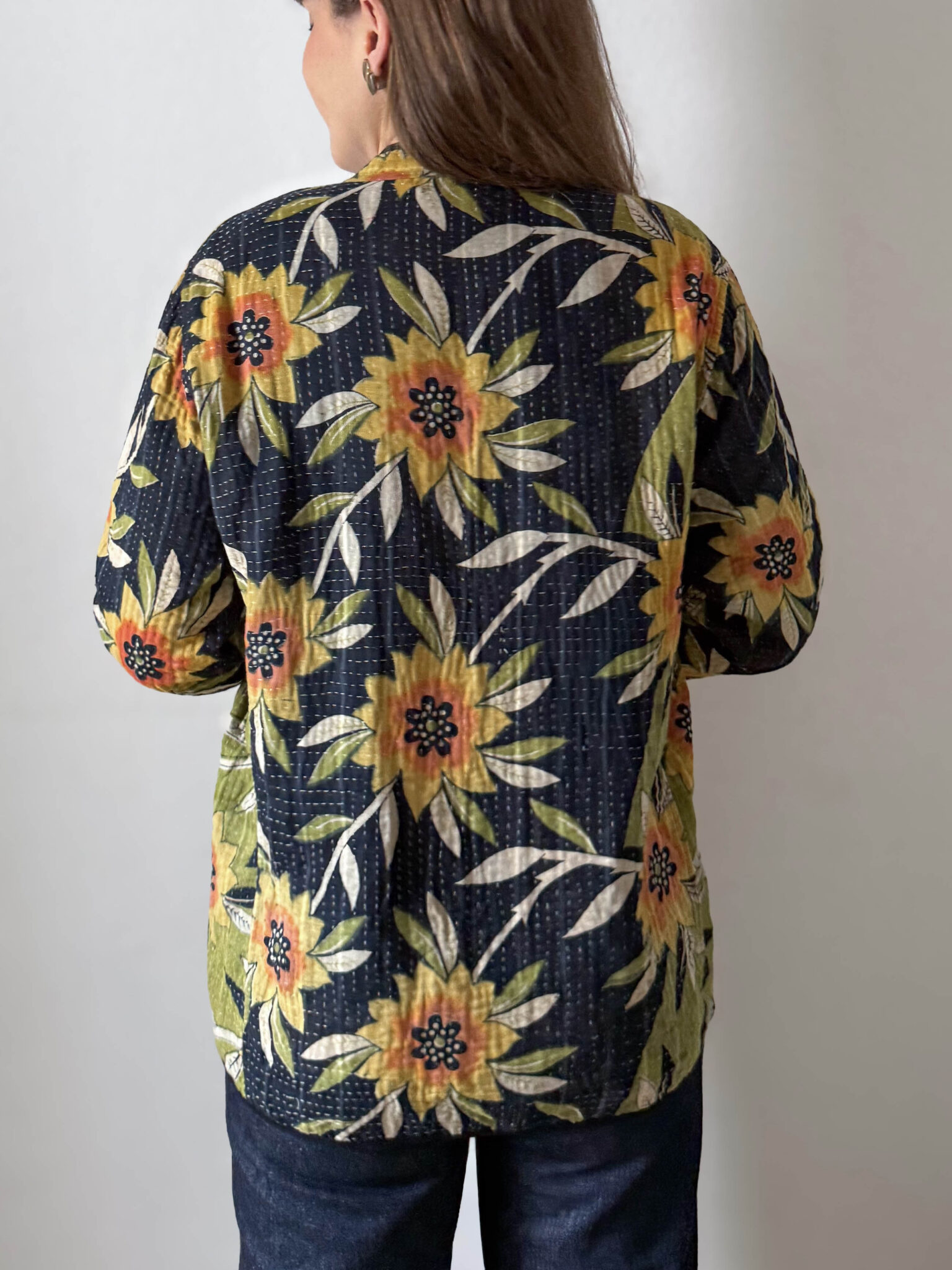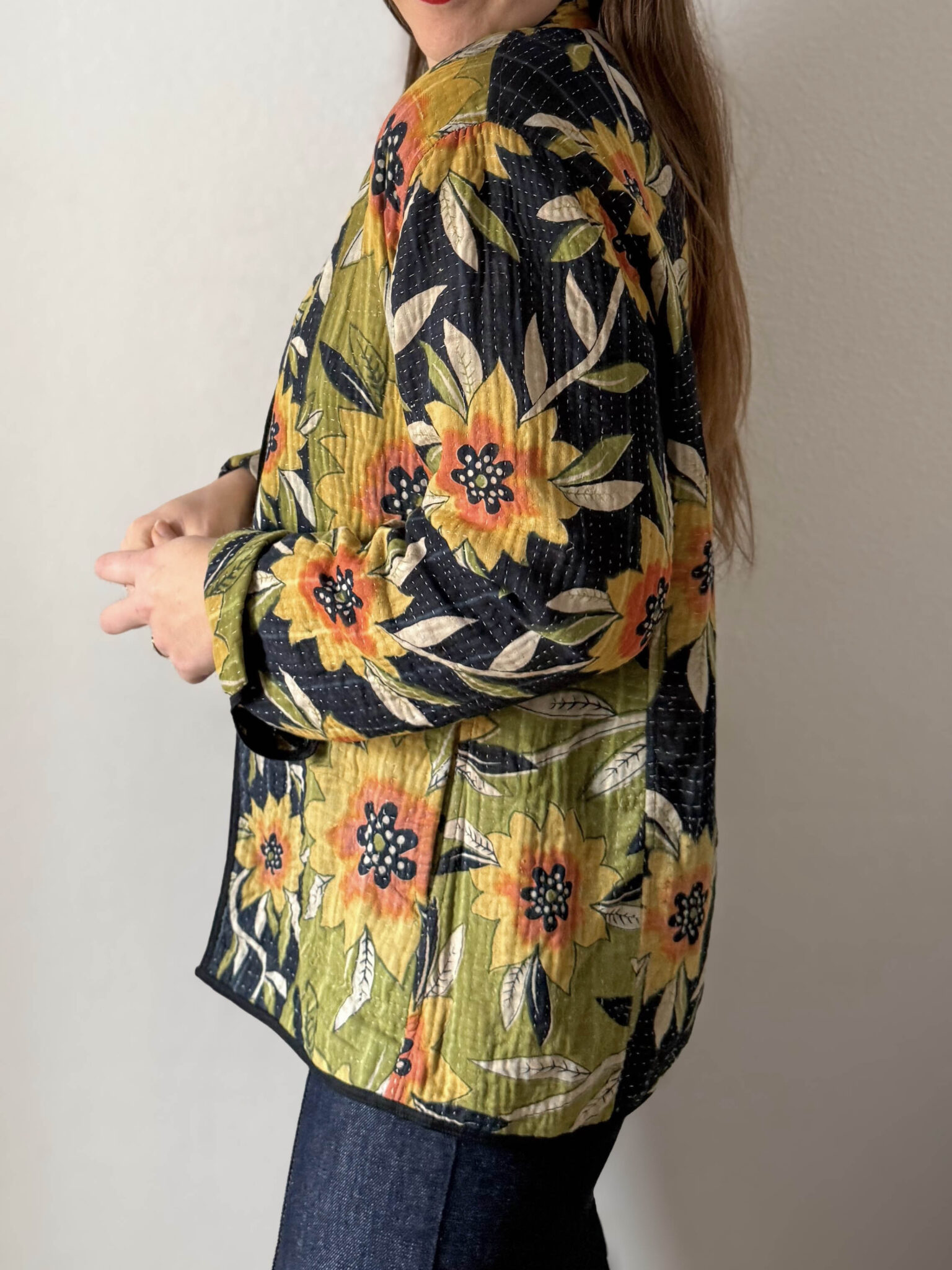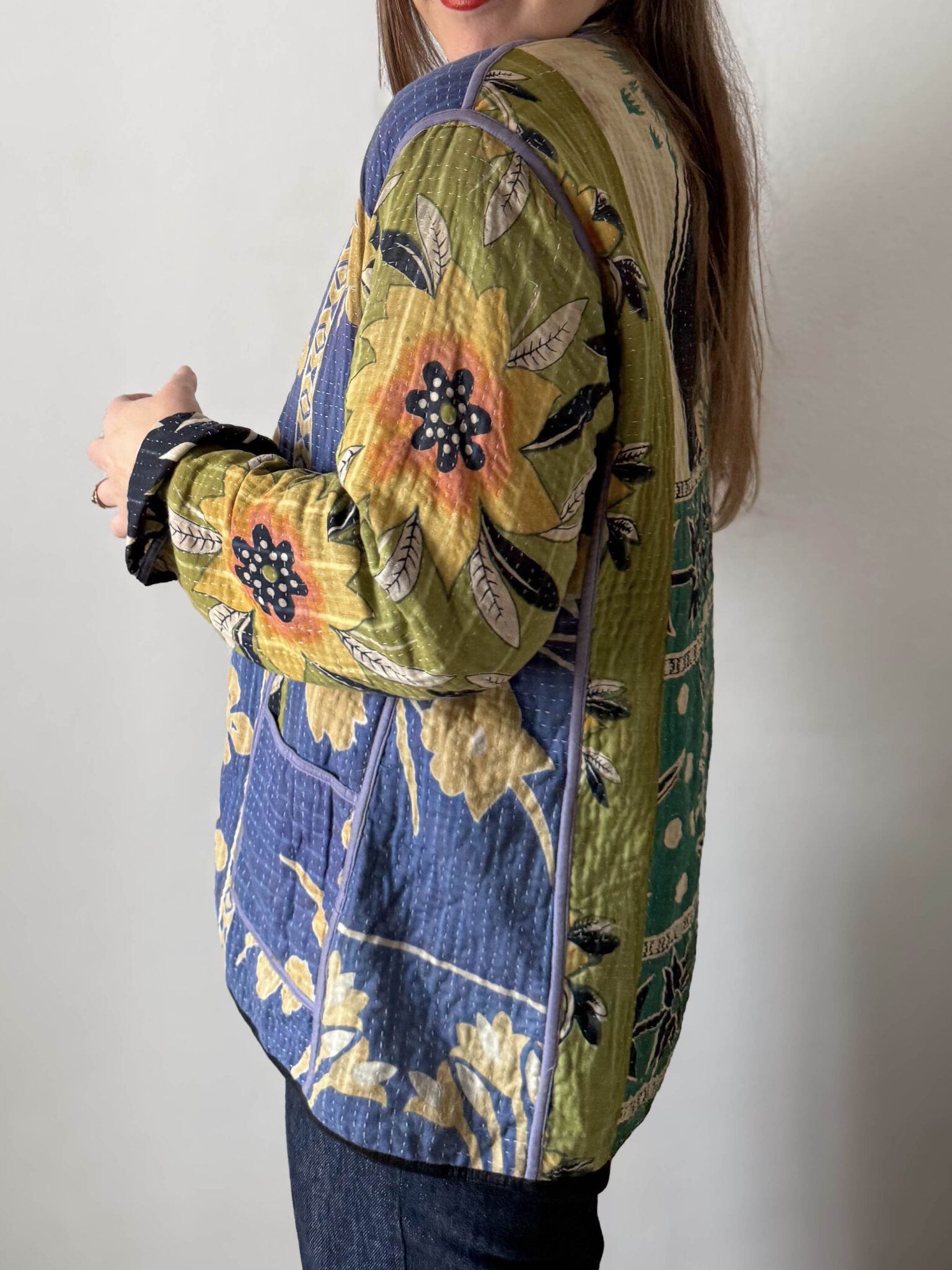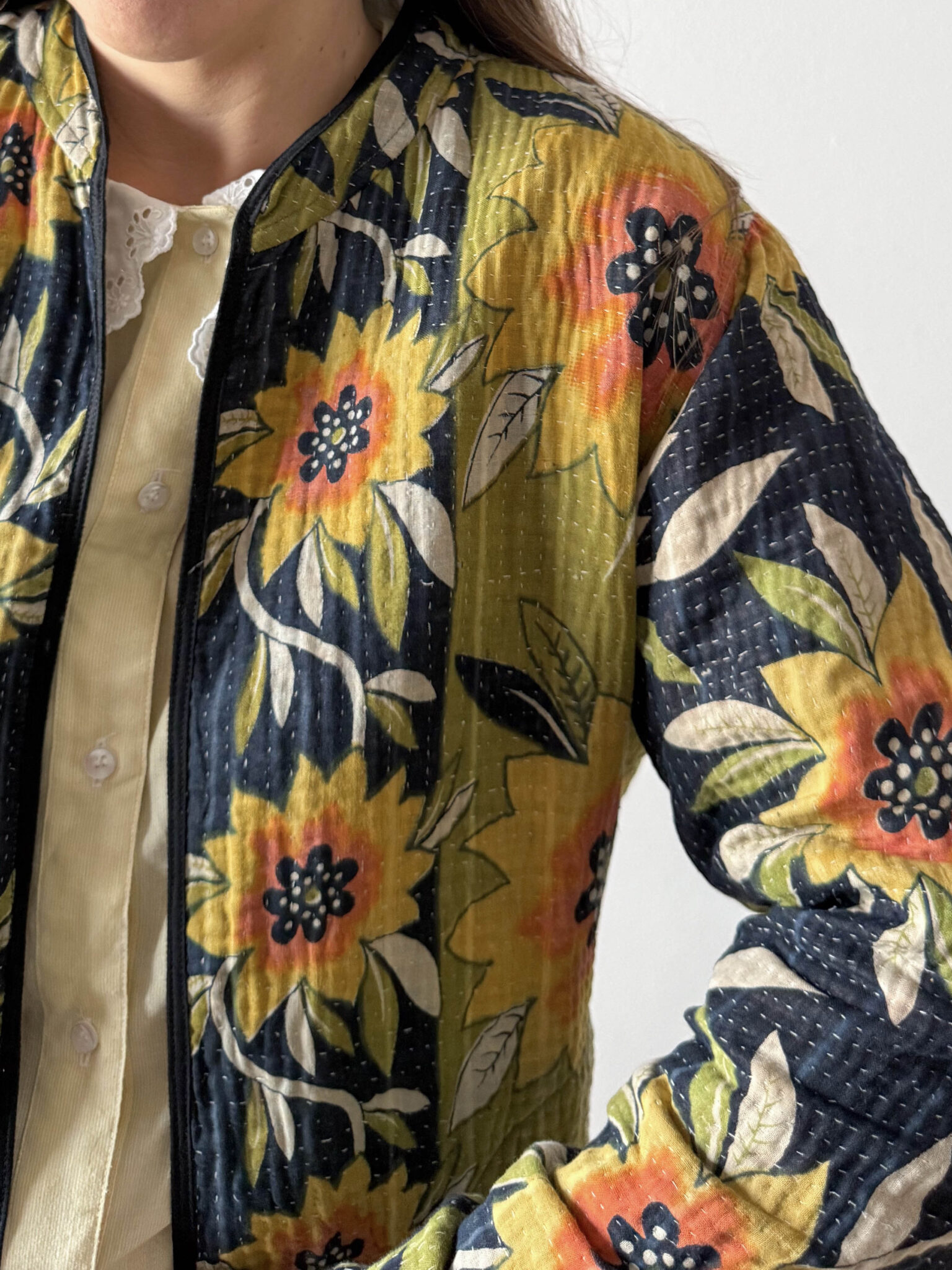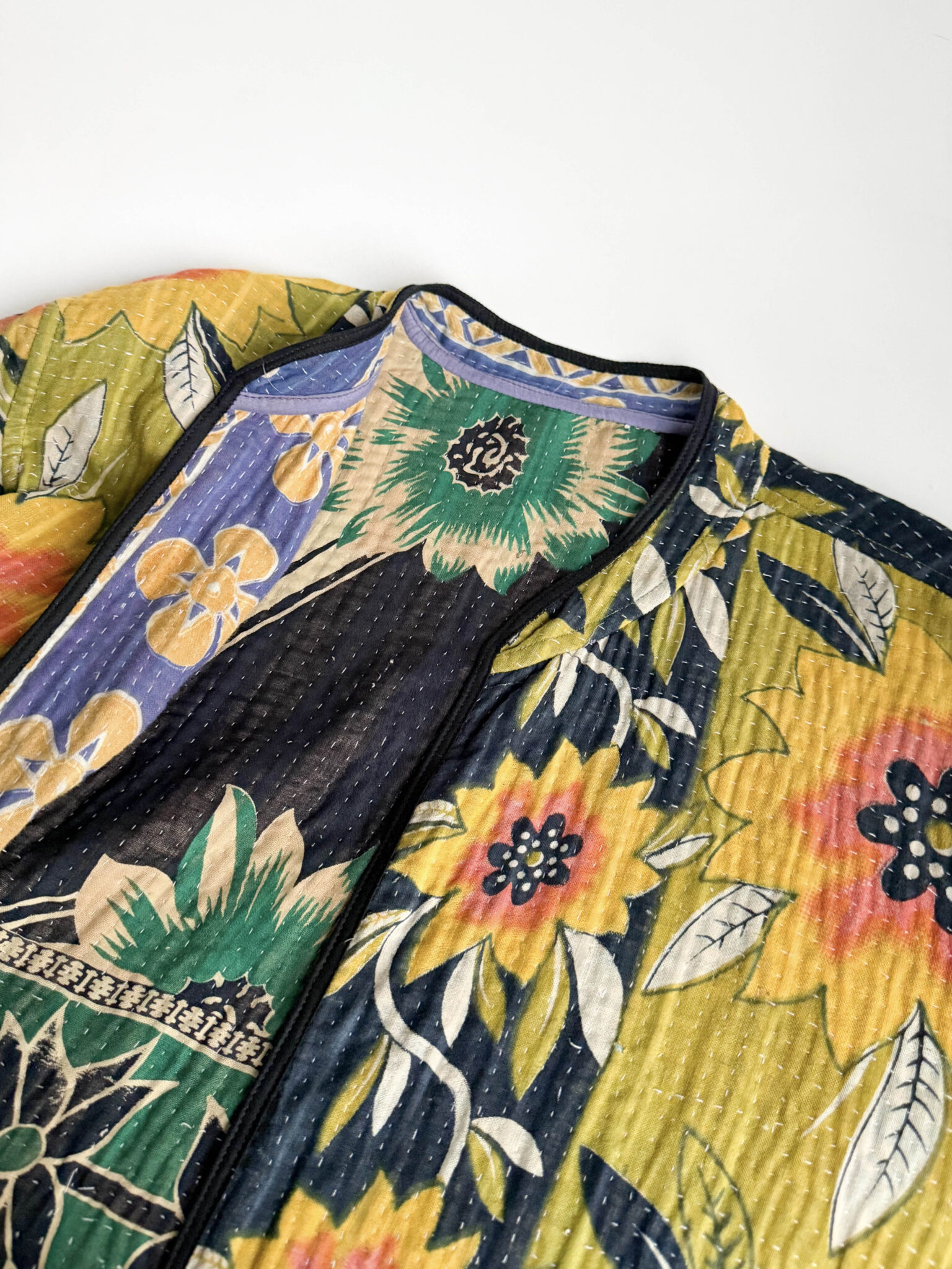 Chaqueta reversible vintage con colorido estampado multicolor de flores. Corte recto, sin cierre y con un tejido fino acolchado