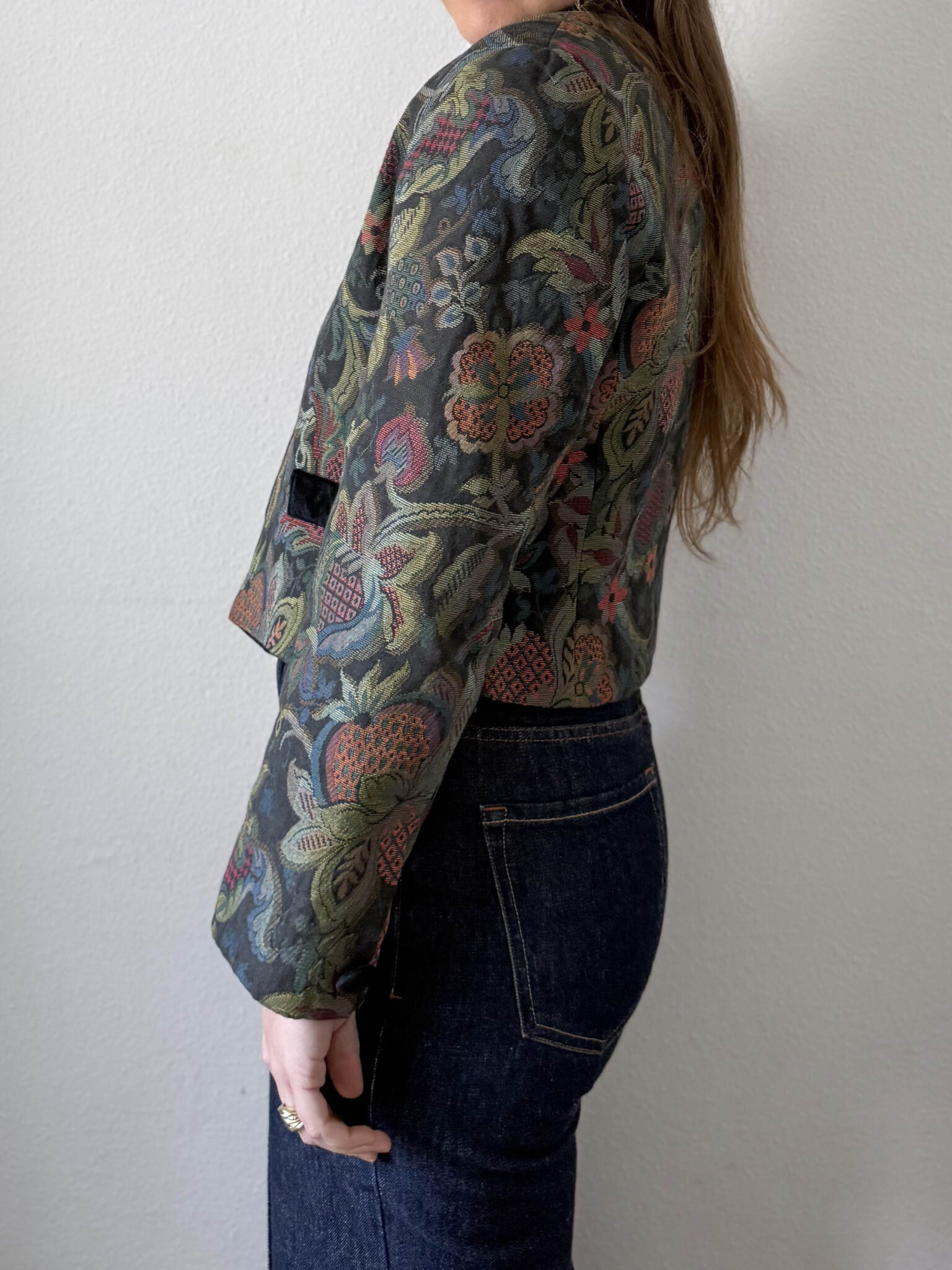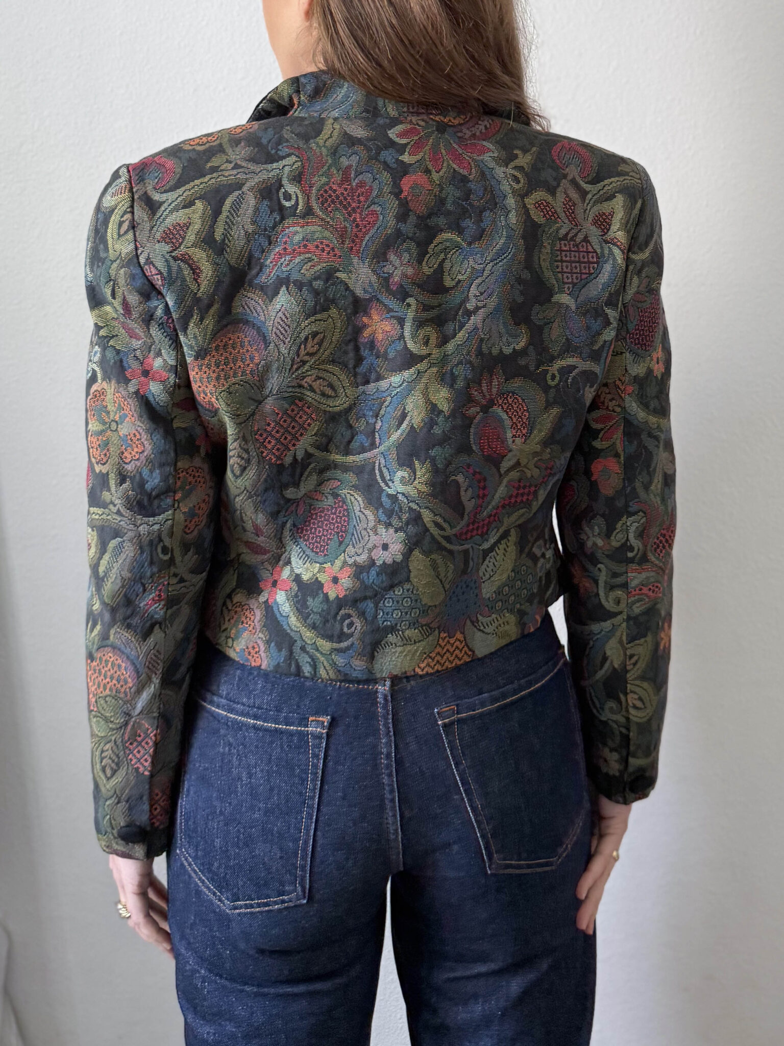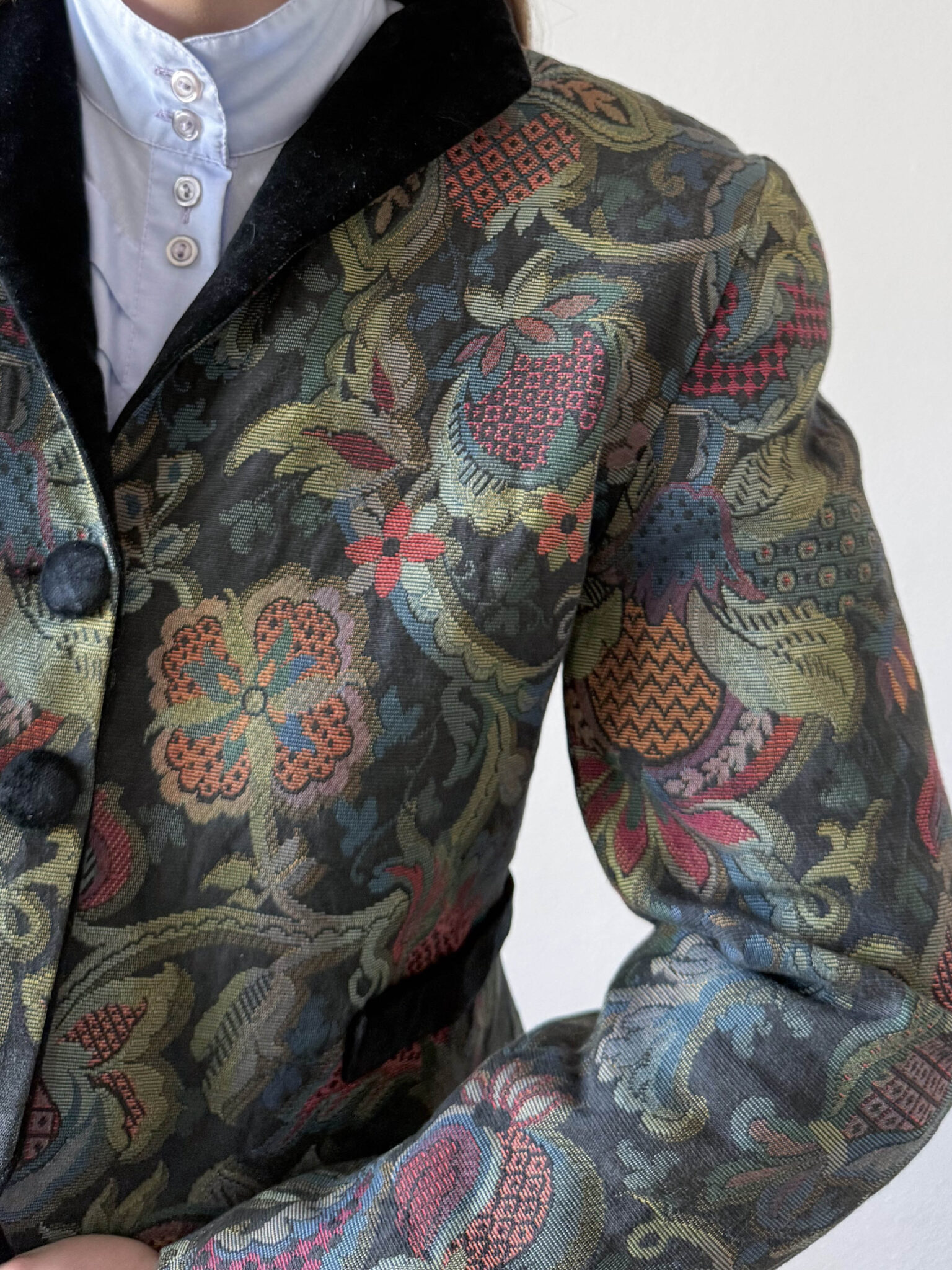 Chaqueta tapiz italiana con tejido estructurado, hombros marcados y precioso tejido jacquard tipo tapiz con motivos florales. Detalles de cuello, botones y bolsillos en terciopelo negro.