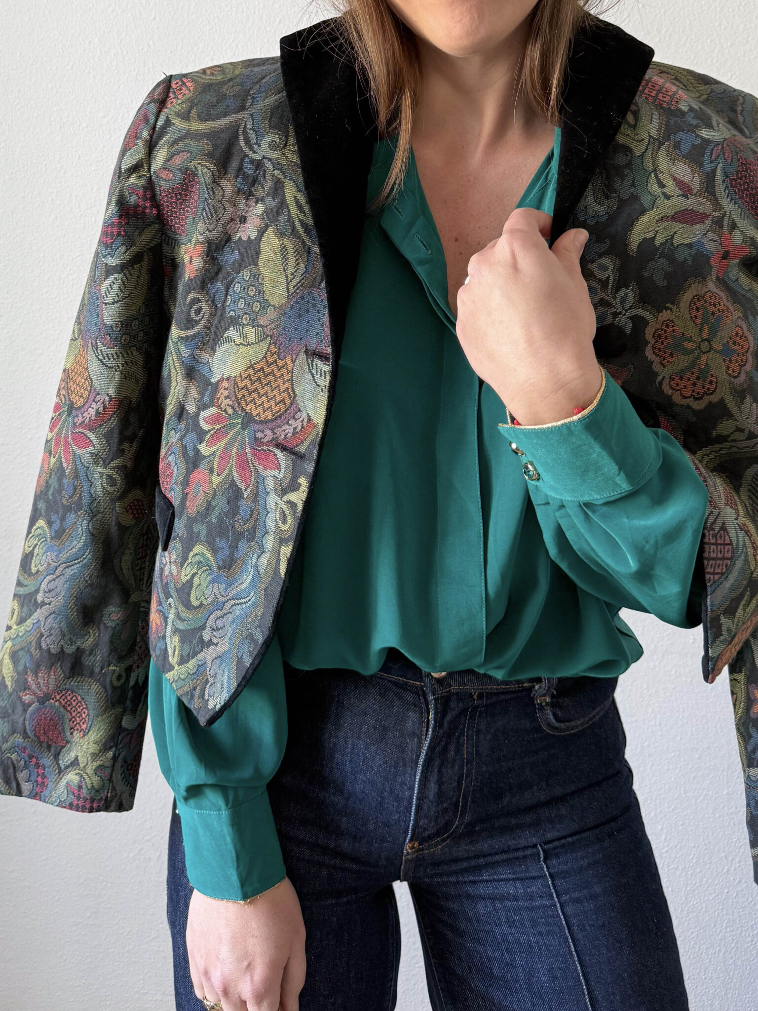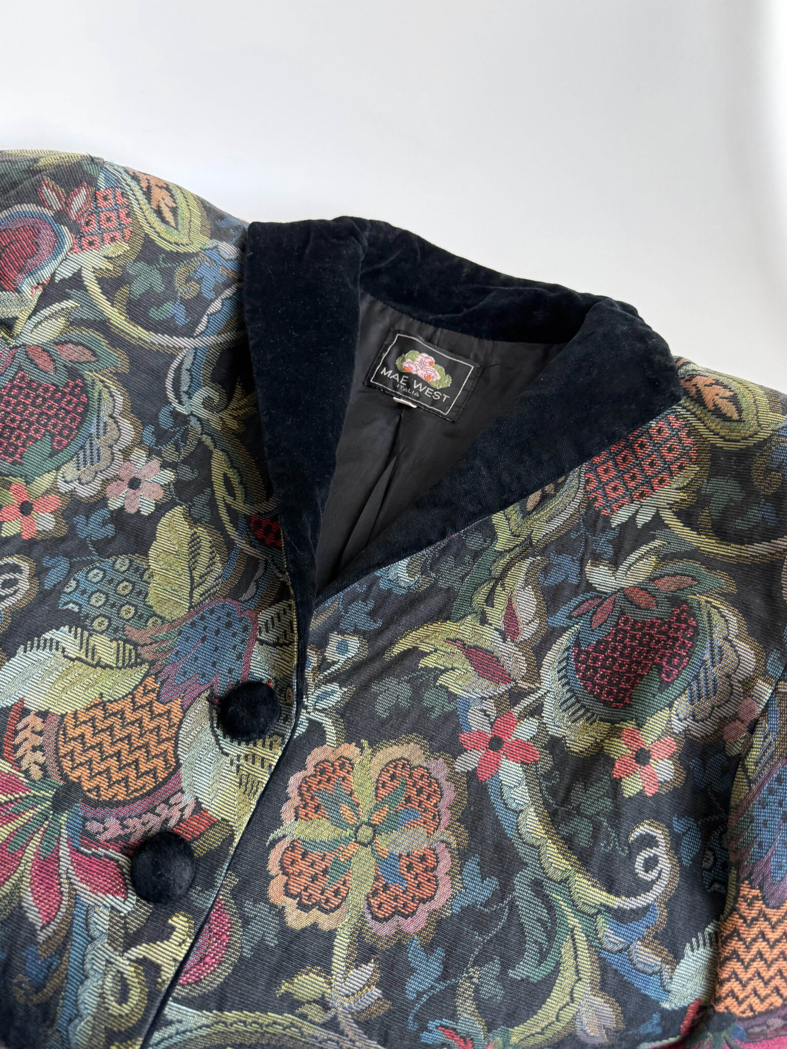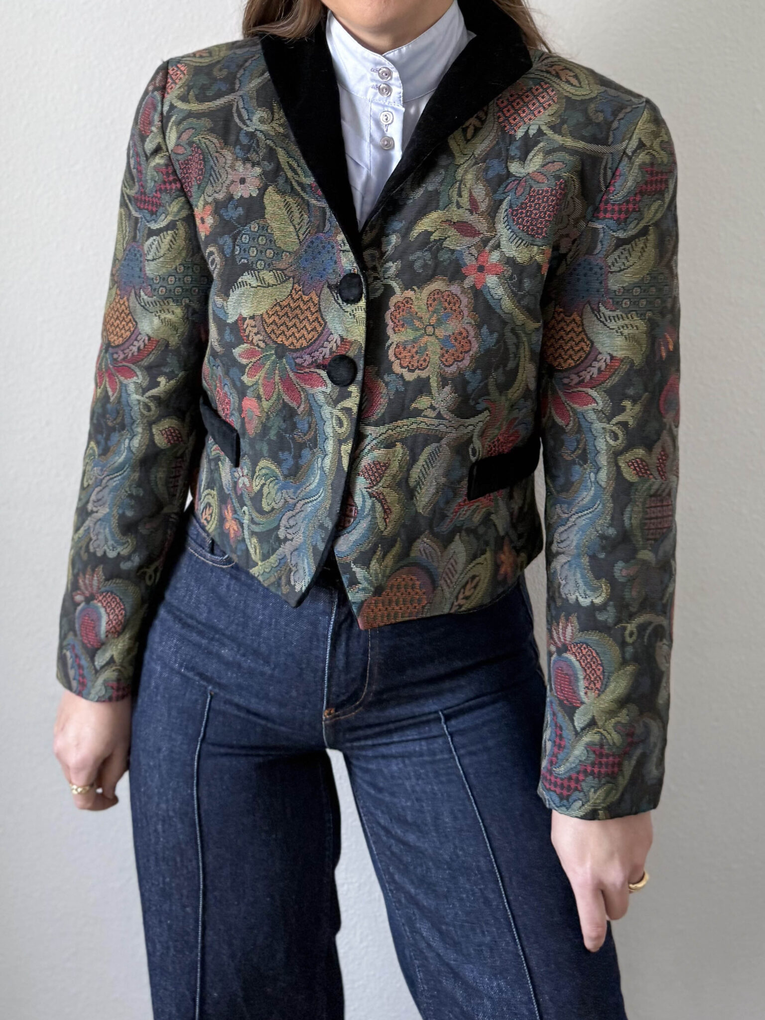 Chaqueta tapiz italiana con tejido estructurado, hombros marcados y precioso tejido jacquard tipo tapiz con motivos florales. Detalles de cuello, botones y bolsillos en terciopelo negro.