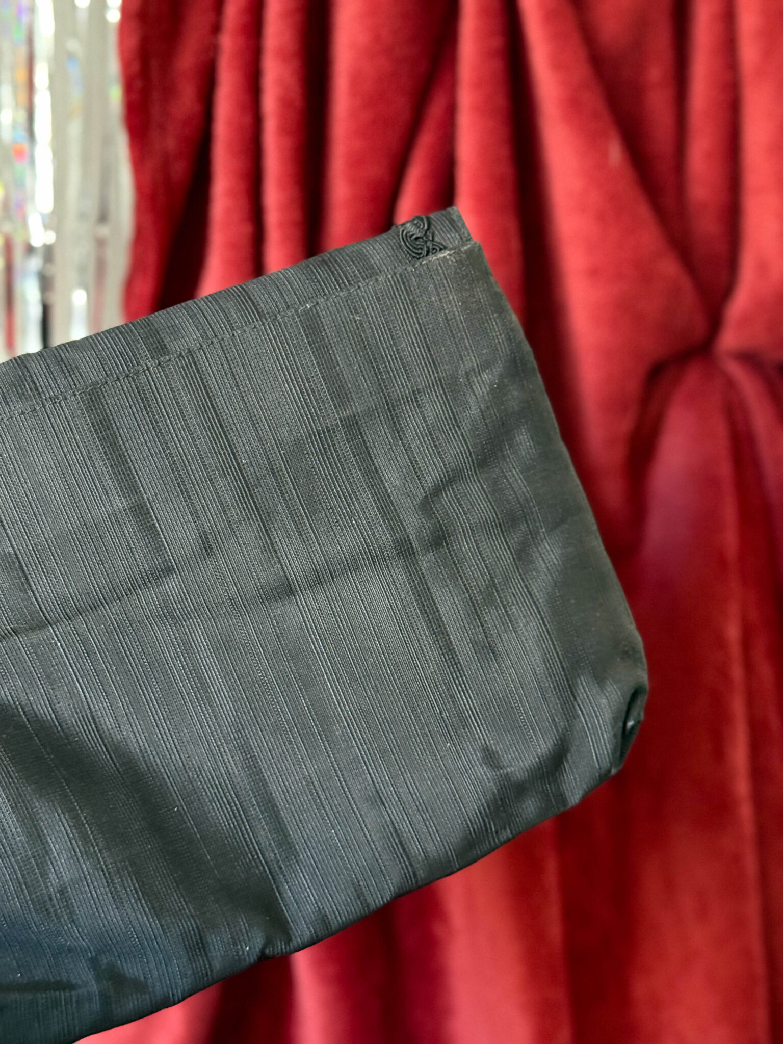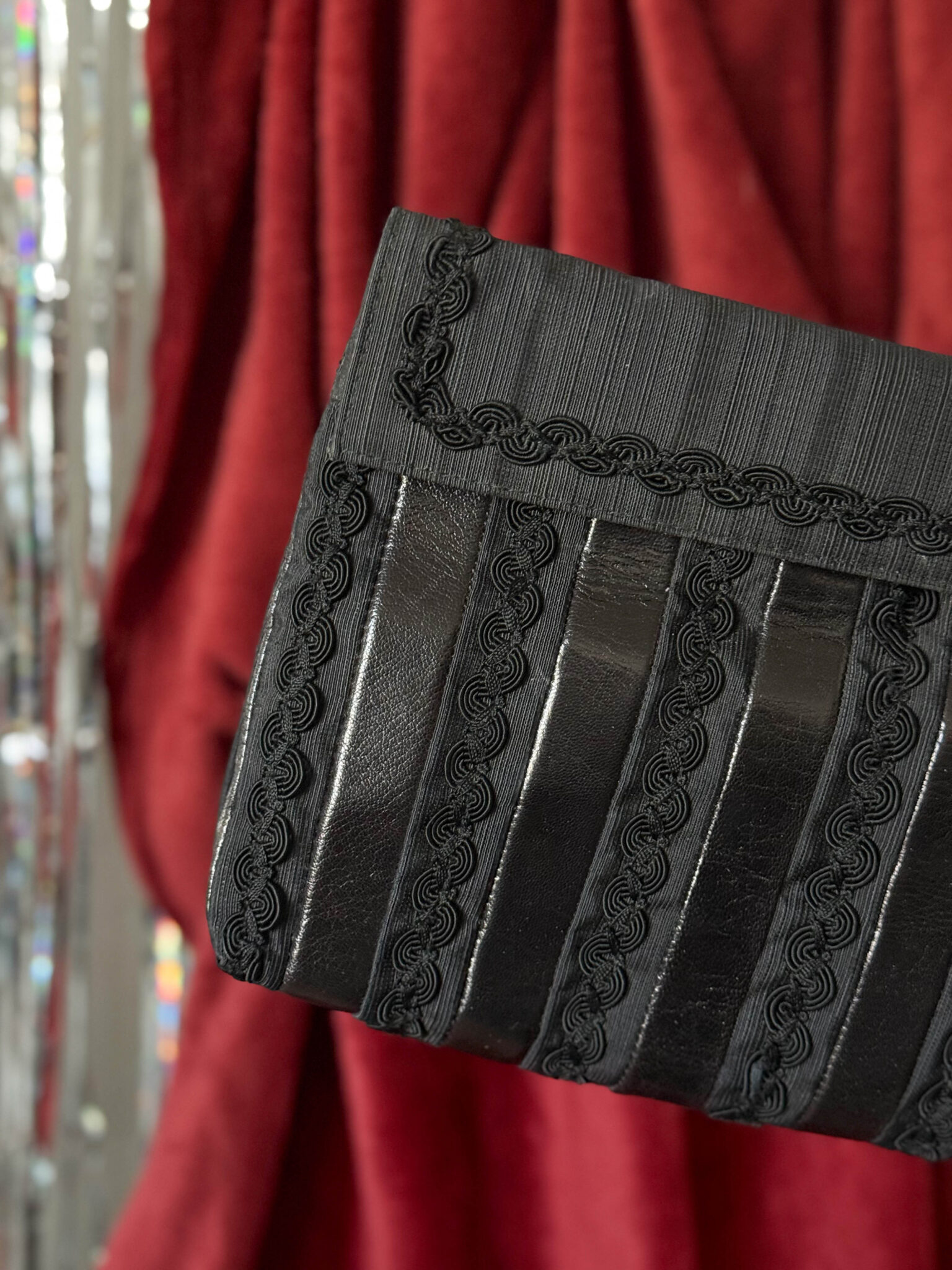 Cluth negro años 60 elaborado en tejido satinado , decorado con cintas verticales y ribetes decorativos. Gran capacidad de almacenaje.