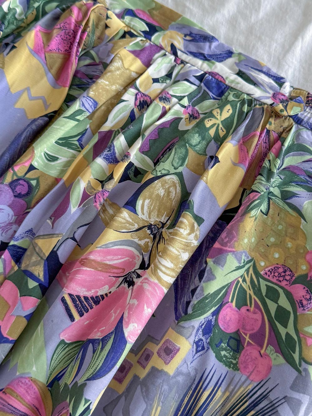 Falda estampada colorida vintage. Cintura con elástico, trabillas y bolsillos laterales. Estampado con una tonalidad de colores preciosa.
